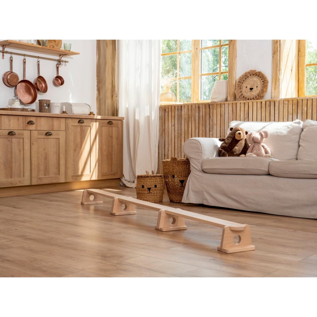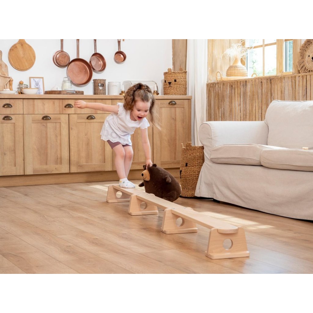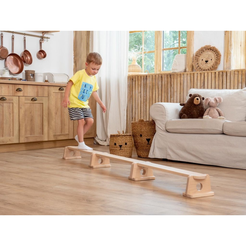 Balančná dráha obsahuje 3 kladiny a 4 podstavce. Jednoduchý systém zmontovania jednotlivých častí dohromady, umožňuje ľahké zostavenie. Trénuje rovnováhu a koordináciu a zároveň hravou formou podporuje dôveru vo vlastné schopnosti. Môže zvýšiť sebavedomie, stimulovať kreativitu a predstavivosť, trénovať motorické zručnosti a svalovú silu a poskytovať zábavný a interaktívny spôsob rozvoja detí. Vhodné aj na terapeutické účely. Jednoduchý tvar a dizajn, vyrobené z prírodného dreva Špecifikácia: Farba: Natural Materiál: brezová preglejka Rozmery každej kladiny: 75 cm Výška: 12cm Šírka: 19,8 cm Vhodný vek: 1 - 6 rokov Nosnosť: 60 kg Čistá hmotnosť: 6 kgDodatočné parametre