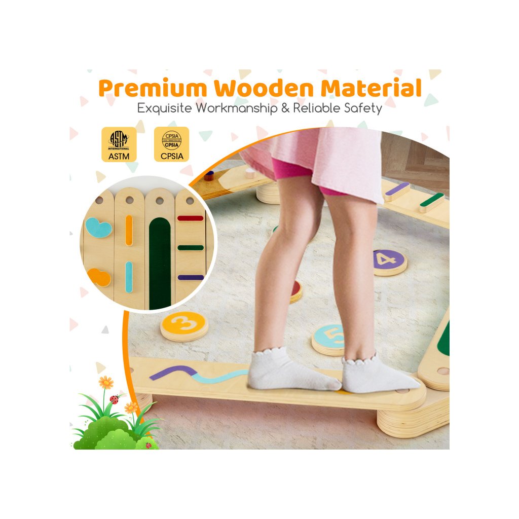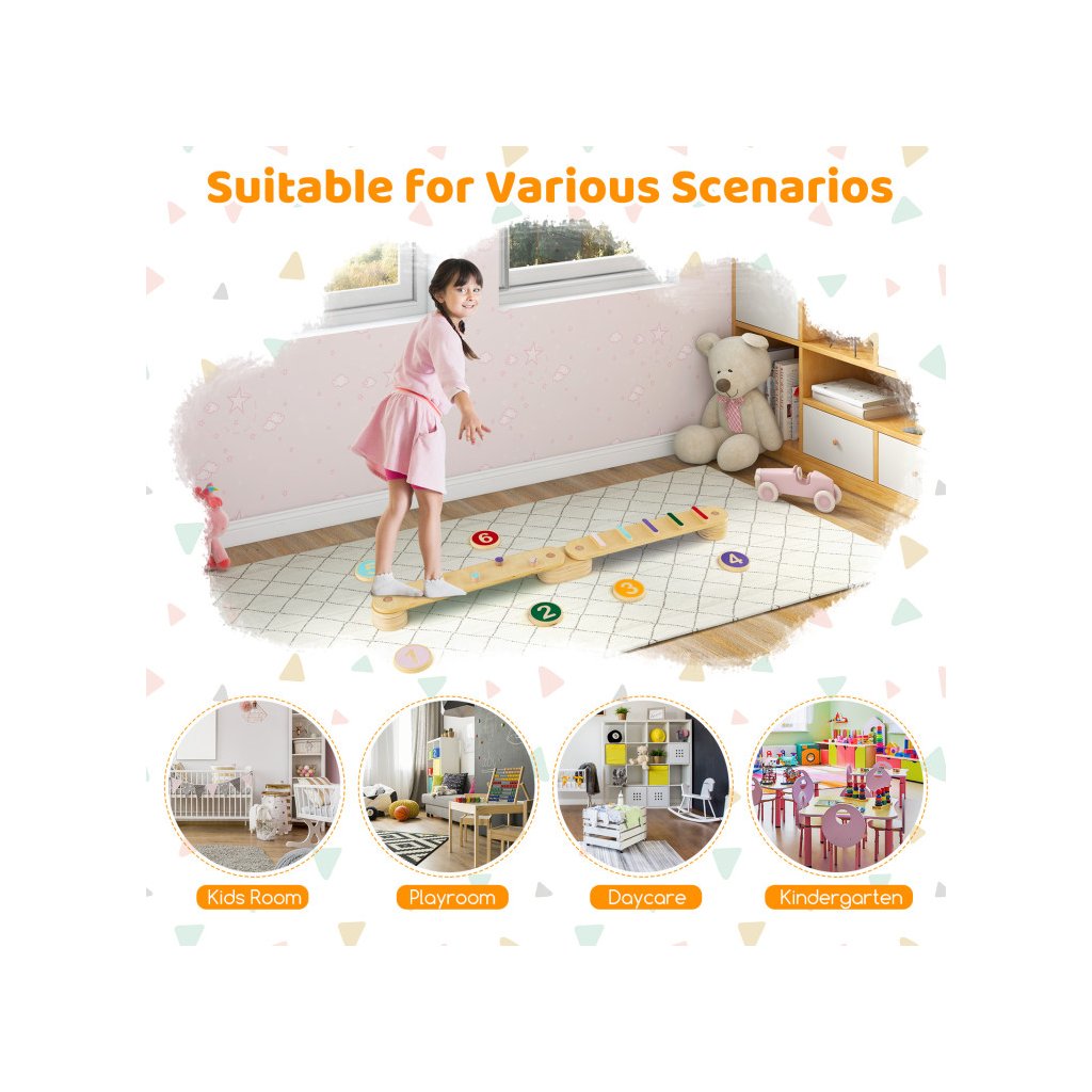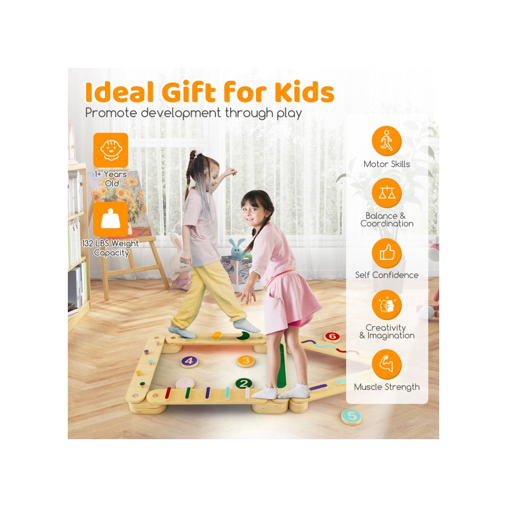 Balančná dráha obsahuje 6 kladín a 6 nášľapných kameňov. Jednoduchý systém vkladania jednotlivých častí dohromady, umožňuje stavať balančné dráhy ľubovoľným spôsobom a vytvárať tak rôzne zložité úrovne. Trénuje rovnováhu a koordináciu a zároveň hravou formou podporuje dôveru vo vlastné schopnosti. Môže zvýšiť sebavedomie, stimulovať kreativitu a predstavivosť, trénovať motorické zručnosti a svalovú silu a poskytovať zábavný a interaktívny spôsob rozvoja detí. Vhodné aj na terapeutické účely. Jednoduchý tvar a dizajn, moderné farby, vyrobené z prírodného dreva Špecifikácia: Farba: Viacfarebná Materiál: brezová preglejka Rozmery každého kladiny: 58 x 9,5 x 3 cm (D x Š x V) Rozmery každého nášľapného kameňa: 9,5 x 9,5 x 1,5 cm (D x Š x V) Rozmery okrúhle základne: 9,5 x 9,5 x 6 cm (D x Š x V) Rozmery dlhej základne: 17,5 x 9,5 x 6 cm (D x Š x V) Vhodný vek: Asi 1 rok Nosnosť: 60 kg Čistá hmotnosť: 6 kg Rozsah dodávky: 6 x kladina 6 x nášľapné kamene 5 x dlhá základňa 2 x guľatá základňa 1 x manuál Nosnosť: do 60 kgDodatočné parametre