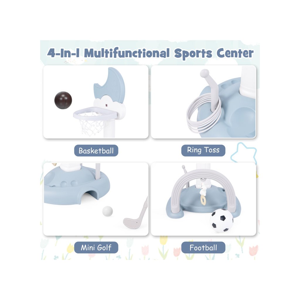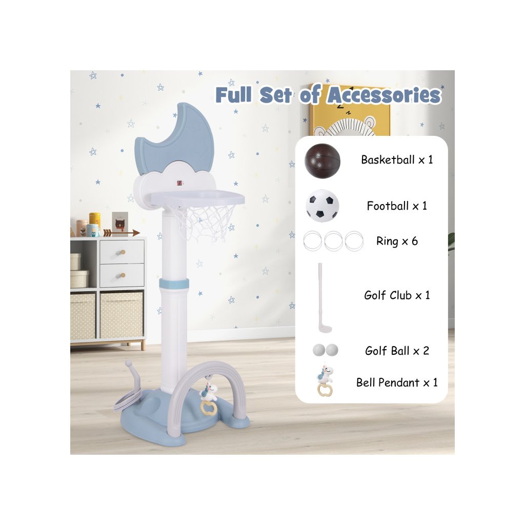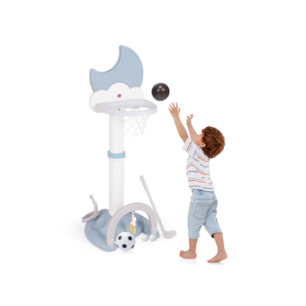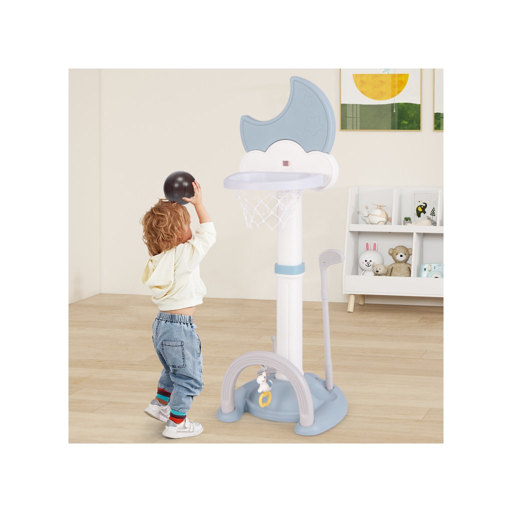 Multifunkčný basketbalový kôš 4 v 1 je dokonalým riešením pre aktívne batoľatá, ktoré chcú rozvíjať svoje športové zručnosti vo vnútri aj vonku. Integrované hry, ako je basketbal, futbal, golf a hádzanie obručí, ponúkajú rozmanitosť, ktorá udrží pozornosť detí dlhšie a prospeje ich motorickému vývoju. Nastaviteľná výška koša umožňuje prispôsobiť hračku veku dieťaťa a stabilná základňa zaisťuje bezpečnosť pri hraní. Digitálna výsledková tabuľa so zvukovými efektmi navyše umožňuje sledovať výsledky hier. Kôš je vyrobený z pevného HDPE + PP materiálu. Rozmer: 152 x 56 x 50 cm Obsah balenia: 1 x basketbalový kôš 1 x basketbalová lopta 1 x futbalová lopta 6 x vrhacia obruč 1 x golfový klub 2 x golfová loptička 1 x prívesok 1 x manuálDodatočné parametre