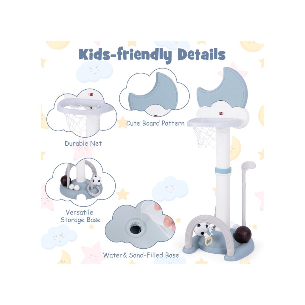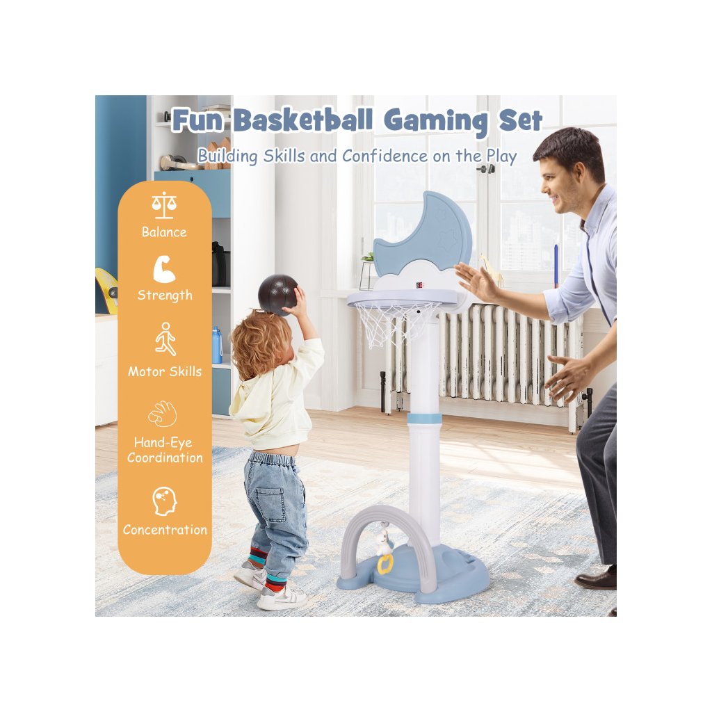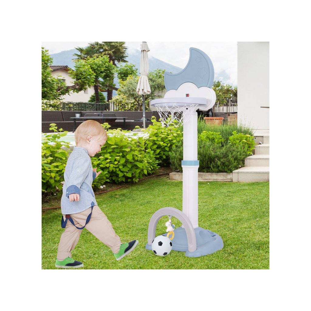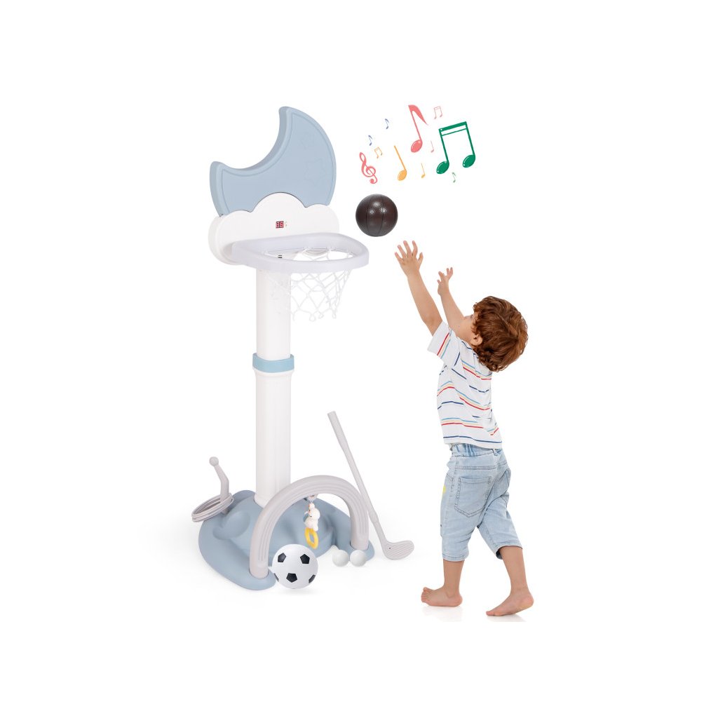 Multifunkčný basketbalový kôš 4 v 1 je dokonalým riešením pre aktívne batoľatá, ktoré chcú rozvíjať svoje športové zručnosti vo vnútri aj vonku. Integrované hry, ako je basketbal, futbal, golf a hádzanie obručí, ponúkajú rozmanitosť, ktorá udrží pozornosť detí dlhšie a prospeje ich motorickému vývoju. Nastaviteľná výška koša umožňuje prispôsobiť hračku veku dieťaťa a stabilná základňa zaisťuje bezpečnosť pri hraní. Digitálna výsledková tabuľa so zvukovými efektmi navyše umožňuje sledovať výsledky hier. Kôš je vyrobený z pevného HDPE + PP materiálu. Rozmer: 152 x 56 x 50 cm Obsah balenia: 1 x basketbalový kôš 1 x basketbalová lopta 1 x futbalová lopta 6 x vrhacia obruč 1 x golfový klub 2 x golfová loptička 1 x prívesok 1 x manuálDodatočné parametre