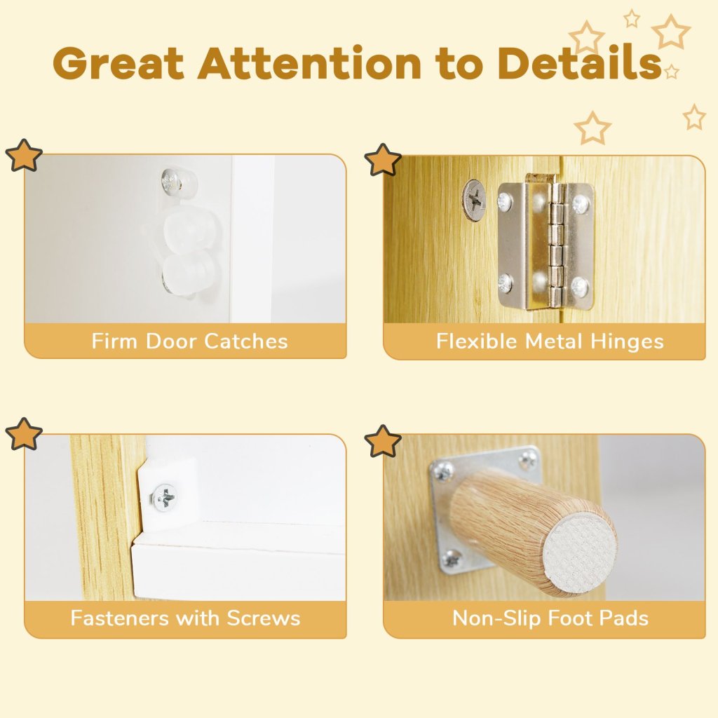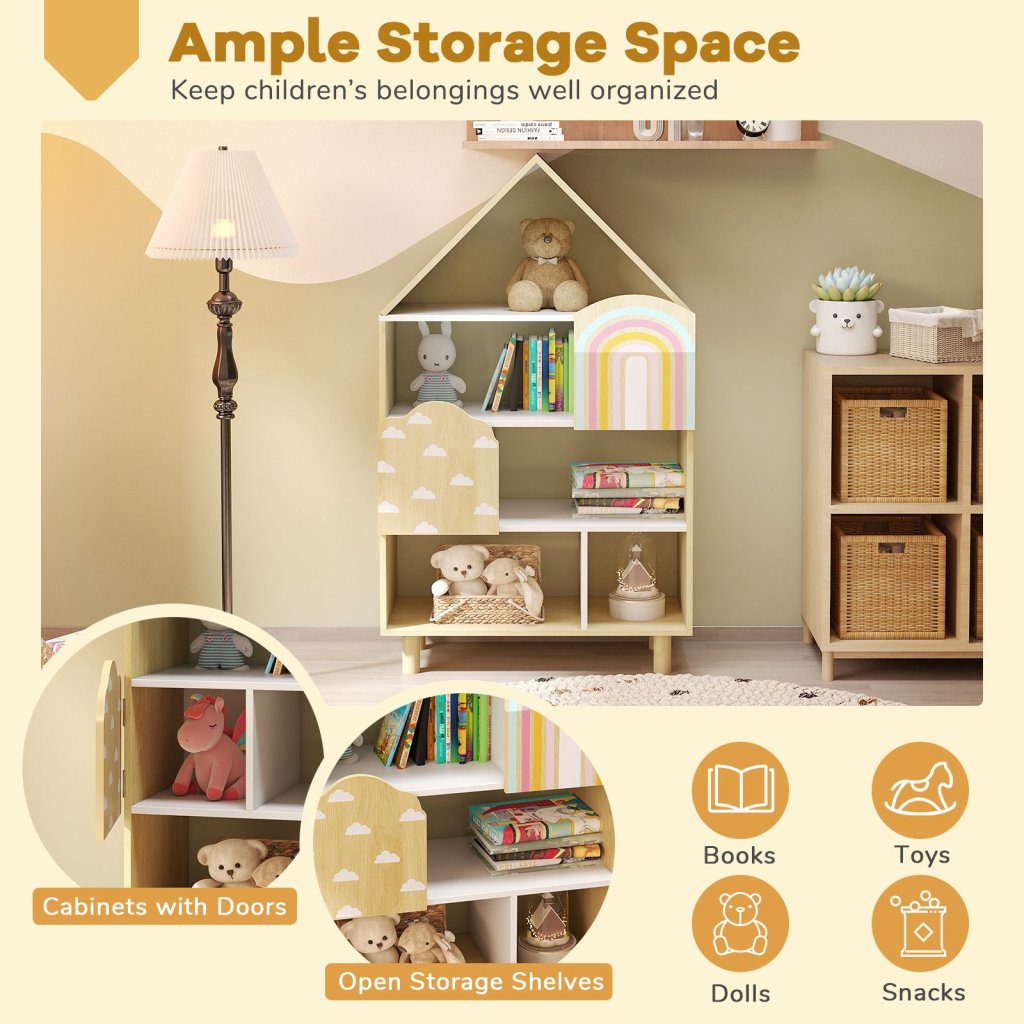 Táto detská knižnica v tvare domčeka spája funkčnosť s hravým dizajnom, ktorý okamžite spríjemní každú izbu. Štyri priestranné police ponúkajú dostatok miesta na knihy, plyšové hračky a drobnosti, zatiaľ čo spodná časť je vybavená dvoma dvierkami, za ktorými možno ľahko schovať hračky alebo predmety, ktoré by nemali zostať na očiach. Stabilnú konštrukciu podporujú masívne drevené nohy, ktoré udržujú policu pevne a bezpečne na mieste. Vysoká kvalita spracovania zaručuje dlhú životnosť a jednoduchú údržbu, takže polička bude spoľahlivým pomocníkom po mnoho rokov. Vďaka svojmu jedinečnému tvaru domčeka slúži nielen ako praktický úložný nábytok, ale aj ako originálna dekorácia, ktorá rozvíja detskú fantáziu a povzbudzuje ich k udržiavaniu poriadku. Táto polička je ideálnou voľbou pre rodičov, ktorí hľadajú kombináciu estetiky, funkčnosti a bezpečnosti v jednom. Perfektne zapadá do detskej izby a poskytuje vašim malým výskumníkom vlastný priestor na usporiadanie ich pokladov. Farba: prírodná Materiál: MDF, borovicové drevo, lisované drevo Rozmery produktu: 60 x 30 x 103 cm (D x Š x V) Nosnosť každej police: 15 kg Čistá hmotnosť: 14 kgDodatočné parametre