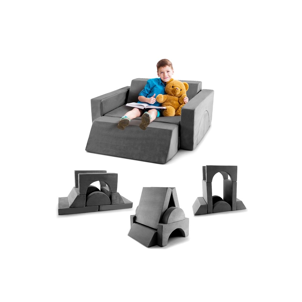 Popustite uzdu fantázii vášho dieťaťa s touto 8dielnou modulárnou detskou pohovkou!Deti si môžu postaviť bunker v niekoľkých možných kombináciách, detskej fantázii sa medze nekladú!!! Vysoko elastická modulárna pohovka poskytuje dobrý tlmiaci efekt pre pohodlné sedenie a poskakovanie. Pohovka je potiahnutá semišovými poťahmi, ktoré poskytujú útulný a luxusný pocit a poskytujú maximálne pohodlie pre vaše dieťatko. Dôležitá je najmä jeho správna tvrdosť, aby jednotlivé výtvory stáli pevne a vaše deti po nich mohli bezpečne liezť. Pena je dostatočne ľahká, aby ju aj tie najmenšie deti mohli premiestňovať z miesta na miesto a mohli začať tvoriť rôzne tvary Bunkra. Snímateľné poťahy je možné prať v práčke, takže detská pohovka bude opäť vyzerať ako nová. Okrem toho má táto pohovka pre batoľatá rad zaujímavých kombinácií, ktoré deťom umožňujú vytvárať si vlastné hracie kútiky prostredníctvom fantázie. Týmto spôsobom môže priniesť radosť a pohodlie do hry vášho dieťaťa. Táto hračka je špeciálne navrhnutá pre deti, aby podporila ich krativitu. Špecifikácia: Farba: Sivá Materiál: syntetický semiš, pena Rozmery produktu: 105,5 cm x 101 cm x 48 cm (D x Š x V) Rozmery štvorcového vankúša: 75 cm x 75 cm x 12 cm (D x Š x V). Veľkosť lichobežníkového vankúša: 15,5 cm x 75,5 cm x 24 cm x 29 cm (šírka hore x D x V x šírka dna) Rozmery zakriveného vankúša: 75 cm x 37,5 cm x 12 cm (D x Š x V) Veľkosť polkruhového vankúša: 49 cm x 25,5 cm x 12 cm (D x Š x V) Vhodný vek: od 1 roka Čistá hmotnosť: 8 kg Rozsah bunkra: 2 x štvorcové vankúše 2 x lichobežníkové vankúše 2 x zakrivené vankúše 2 x polkruhové vankúše 1 x návodDodatočné parametre