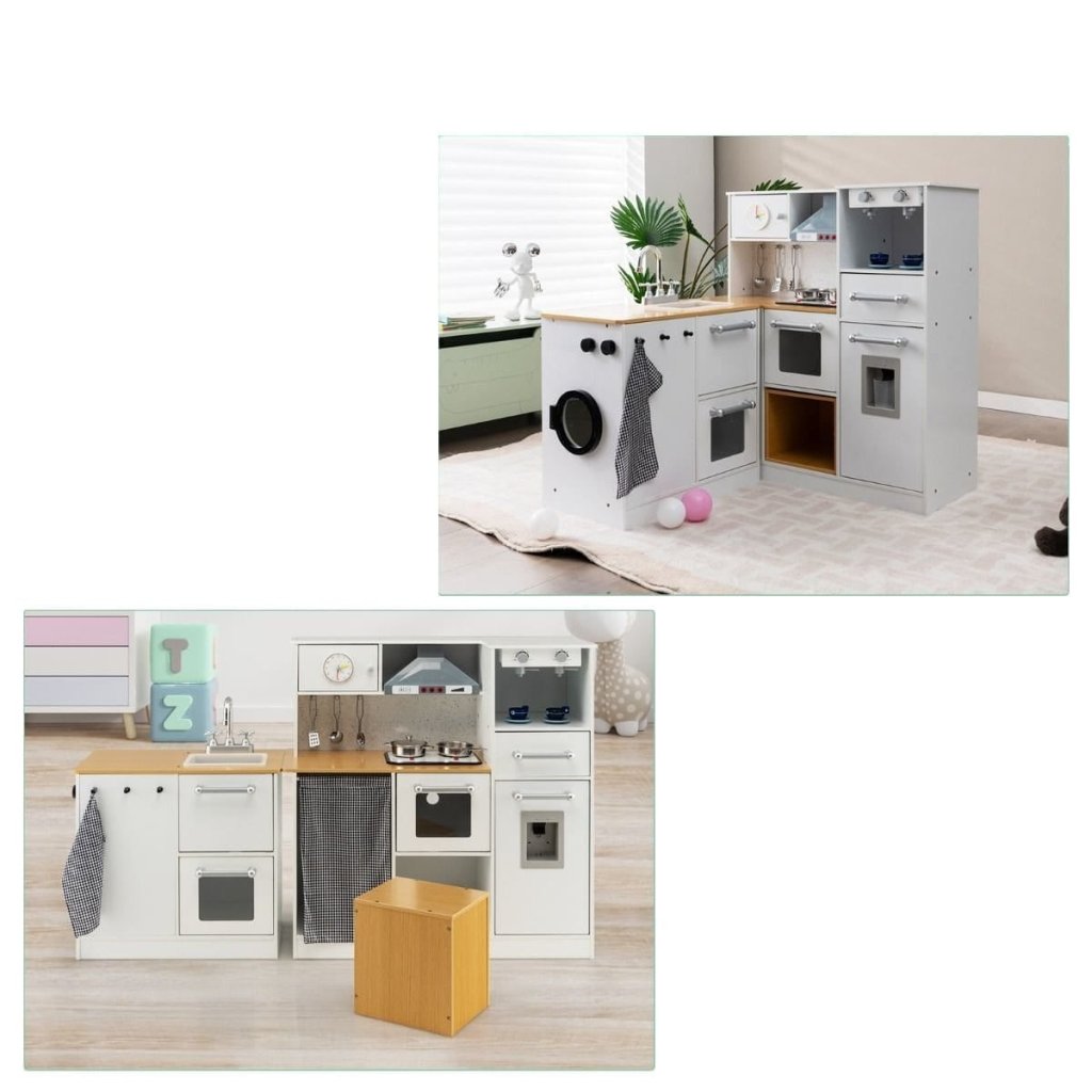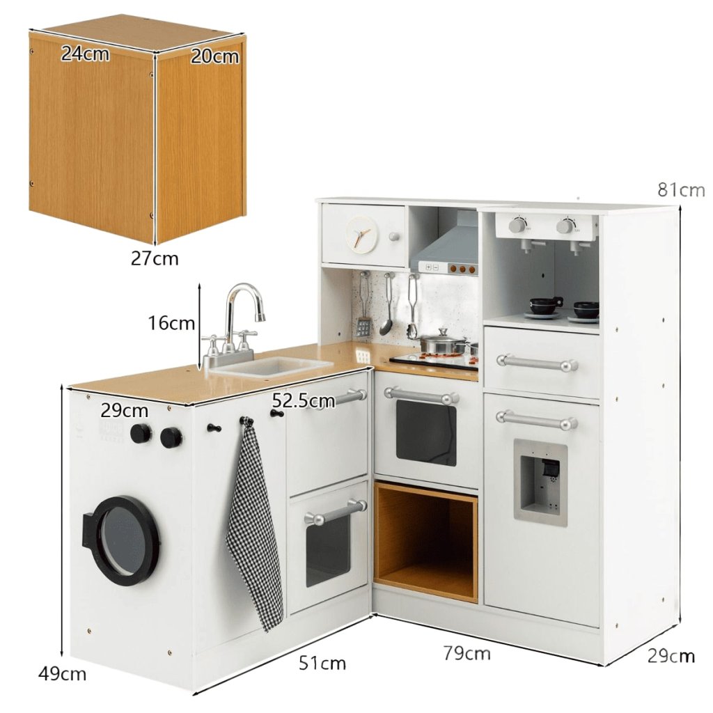 Táto štýlová a funkčná detská rohová kuchynka je ideálnym miestom pre malých kuchárov, ktorí radi napodobňujú reálny svet varenia. Kuchynka je vyrobená z kvalitného materiálu v modernom bielom prevedení s drevenými detailmi, ktoré pôsobia príjemne a prirodzene. Súčasťou je drez so skutočne funkčnou pákovou batériou, sporák s gombíkmi, rúrou, chladničkou, mikrovlnnou rúrou, umývačkou aj práčkou. Kuchynka ponúka dostatok úložného priestoru aj miesto pre príslušenstvo, ktoré je súčasťou setu - napríklad kovové náčinie a hrniec. K výrobku patrí aj praktická drevená stolička, ktorá deťom umožní pohodlne sa posadiť pri príprave jedál. Perfektná voľba pre rozvoj detskej fantázie, jemnej motoriky a sociálnych zručností. Kuchynka je navrhnutá tak, aby bola bezpečná a odolná na každodenné hranie. Podrobnosti: Farba: biela Materiály: MDF Rozmery produktu: 130 x 29 x 81 cm (D x Š x V) Čistá hmotnosť: 23,5 kg Odporúčaný vek: 3+Dodatočné parametre