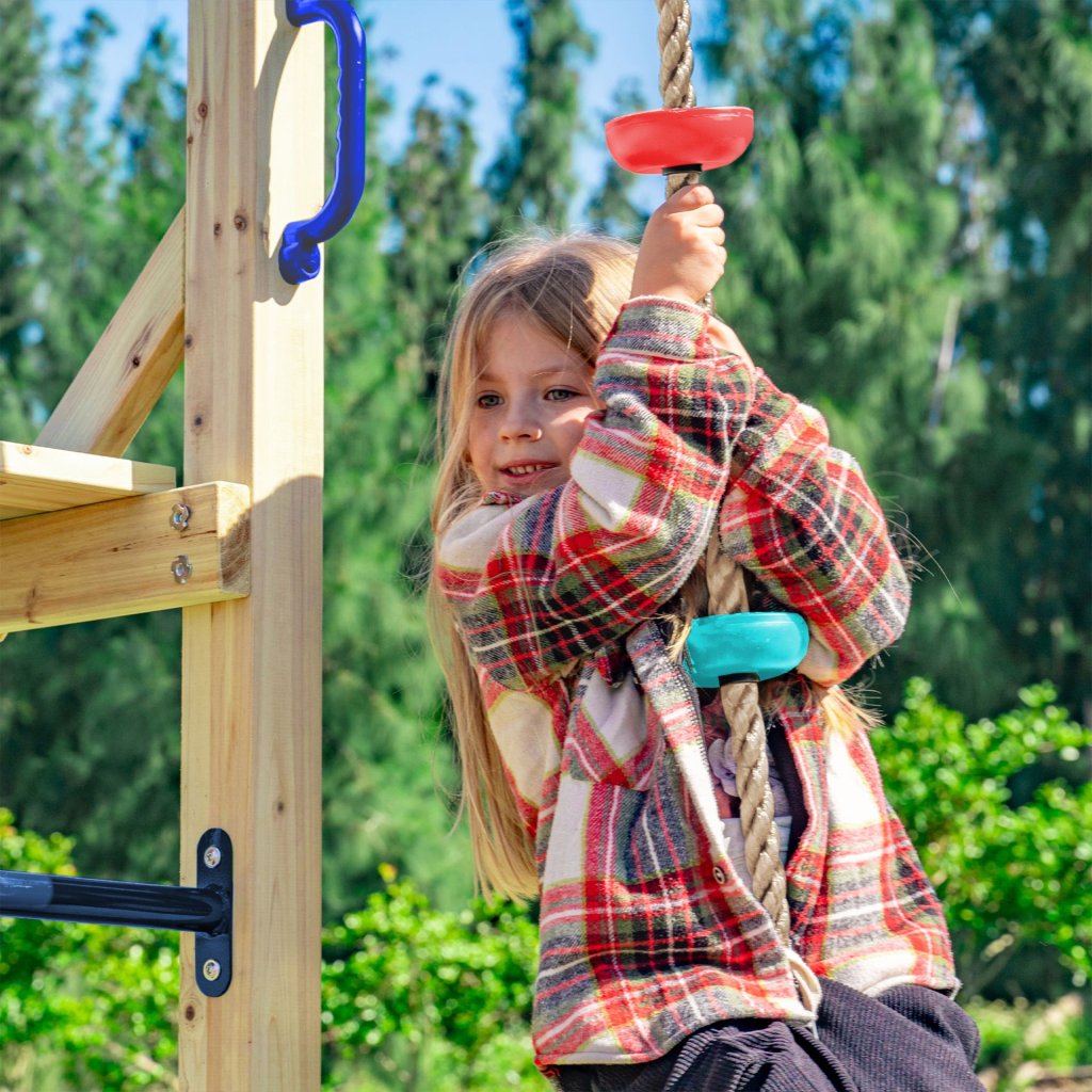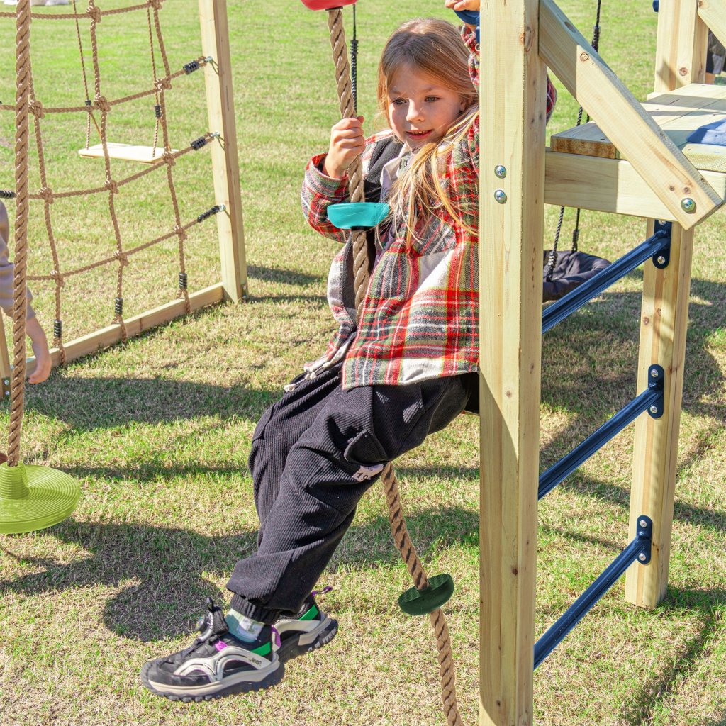 Dominantou zostavy je šmykľavka dlhá 220cm vo výške 120cm, k nej vedú rebríky, lanový rebrík a šplhacie laná, ktoré rozvíjajú silu, rovnováhu a koordináciu. Ručkovacie prvky a gymnastické kruhy posilňujú paže a chrbát, zatiaľ čo lanová sieť podporuje odvahu a sebadôveru. Ihrisko ponúka aj pokojnejšie zóny – hojdacie prvky vrátane obľúbenej hojdačky hniezdo sú ideálne na odpočinok, rozhovory alebo pozorovanie okolia. Kombinácia dynamických a relaxačných aktivít zaisťuje zábavu pre deti rôzneho veku a povahy a podporuje samostatnú aj spoločnú hru.