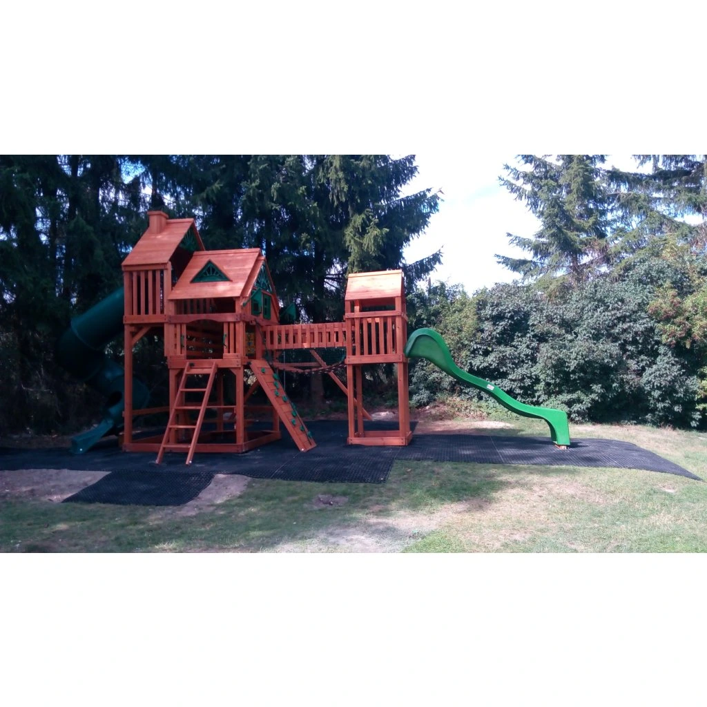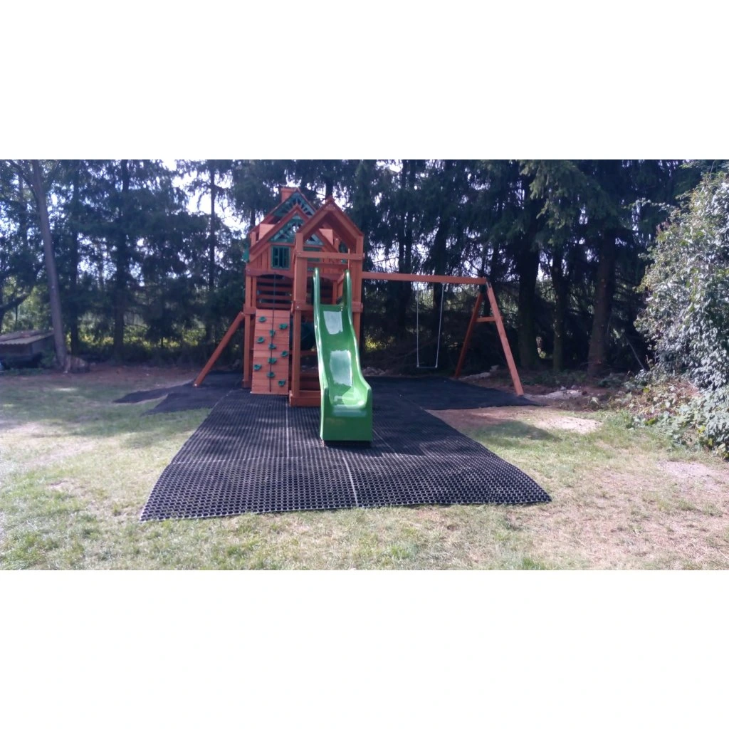 Náš tip - najvýhodnejší materiál pre vytvorenie dopadové plochy tlmiace pád z výšky až 3 m sú gumené zatrávňovacie dosky Grass a Saf. Ich inštalácia je jednoduchá pokládka na terén bez nutnosti zemných prác.