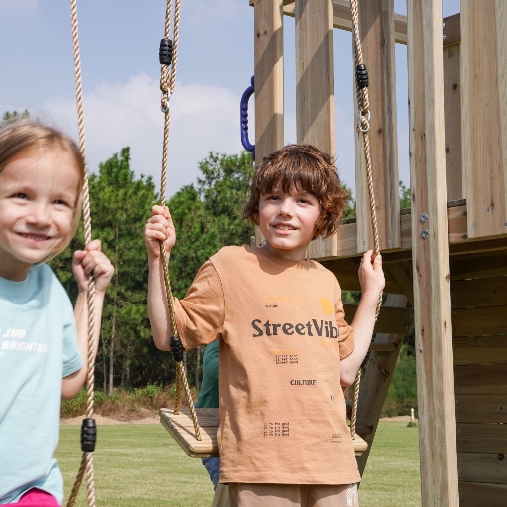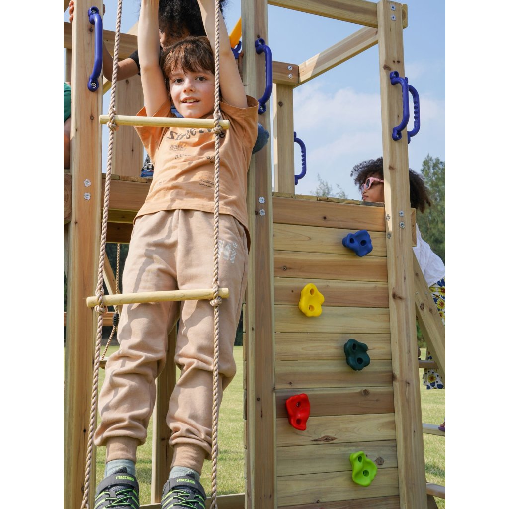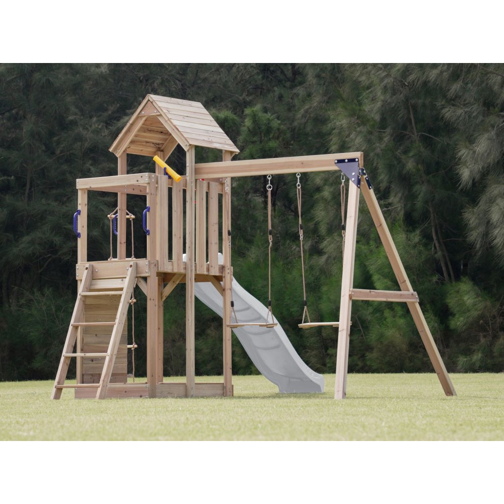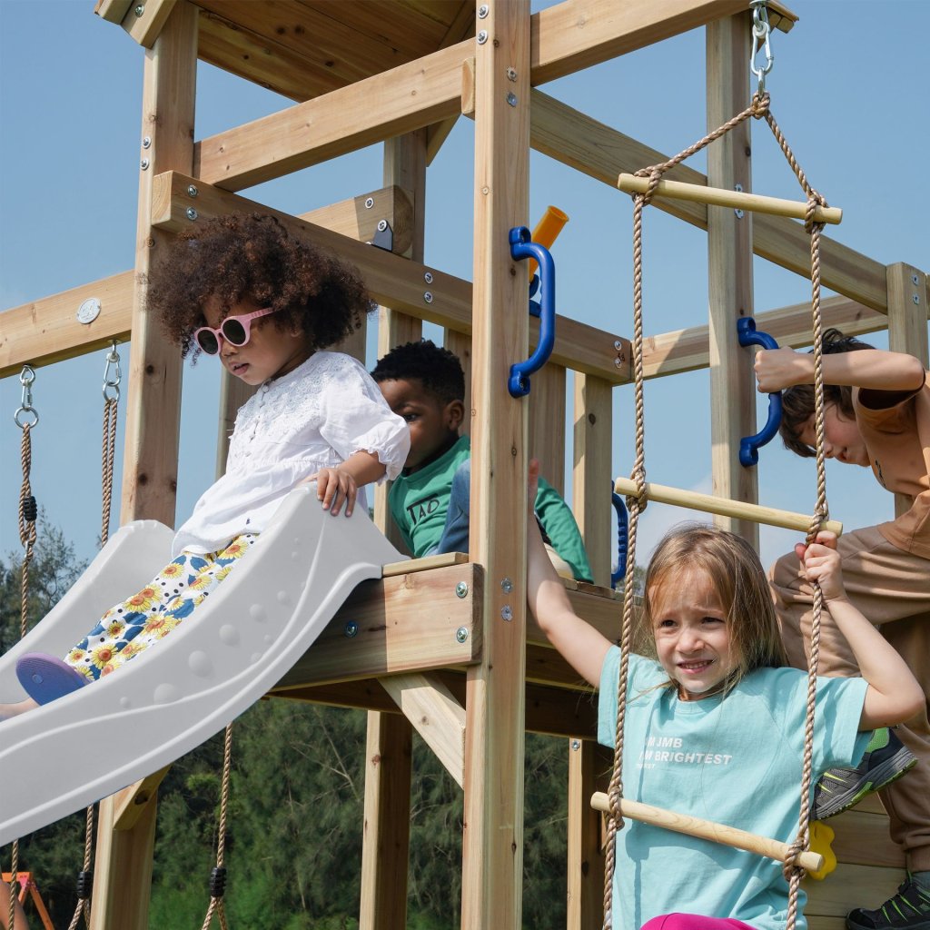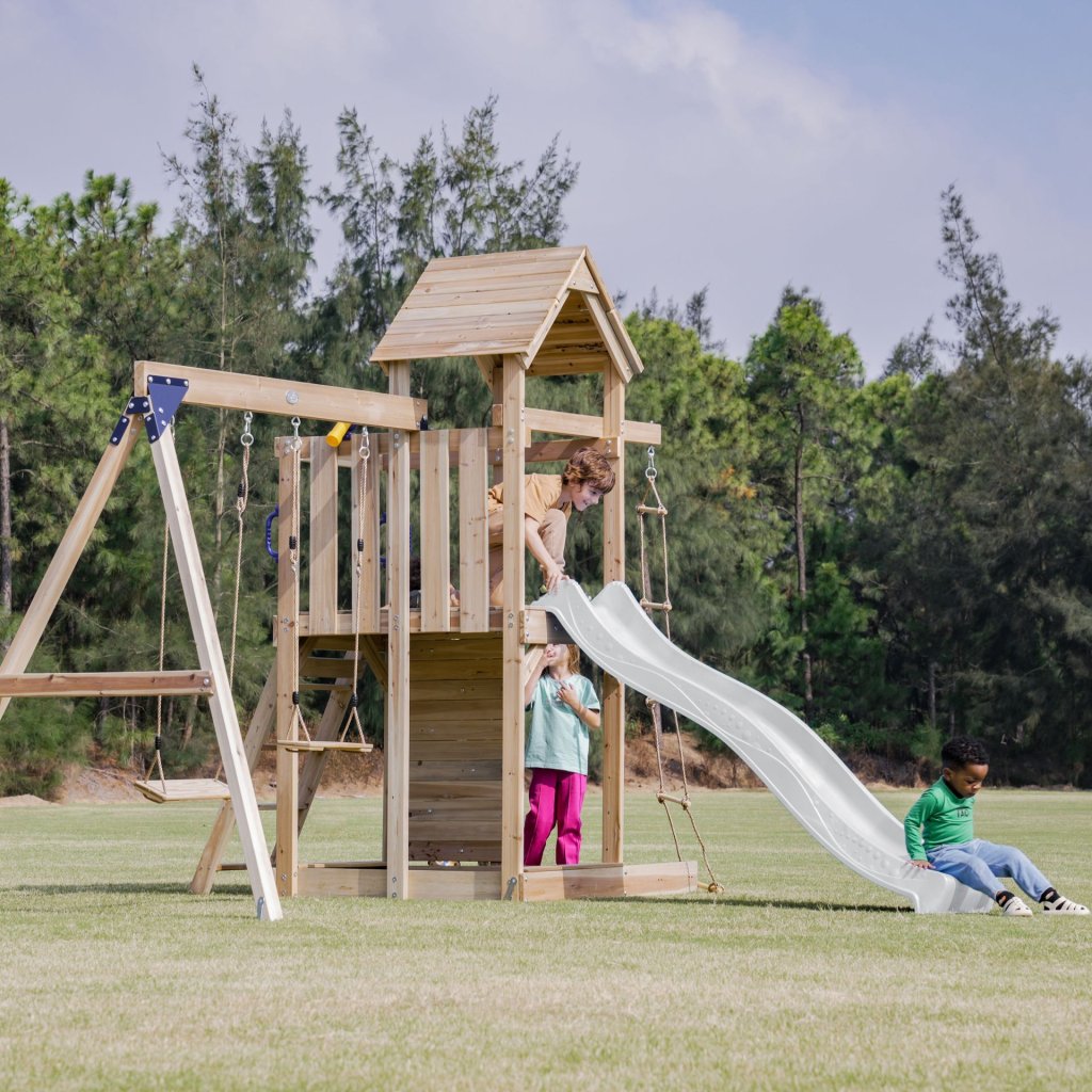 Cena za kompletné ihrisko vrátane skluzavky, houpačkového modulu, ručkovacieho modulu a ďalších herných doplnkov. LUXUSNÍ detské ihrisko z cedrového dreva. Detské ihrisko AXI Moos so sklzavkou a houpačkovým modulom patrí medzi hracie zostavy veľkosti S-M. Dokonalé multifunkčné detské ihrisko, ktoré má všetko!! Jednopodlažná herná zostava so sklzavkou o dĺžke 220 cm, je ďalej rozšírená o masívny houpačkový modul s dvoma kusmi závesných houpačiek a šplhacím žebríkom. Děti budou mít báječný výhľad do okolia s luxusnou hernou vežou, ktorá je čiastočne zastrešená drevenou strechou. Z podesty vo výške 120 cm, je pripojená kombinovaná lezecká stena, ktorá je osadená masívnymi plastovými šplhacími telom a ďalej potom dreveným lezeckým žebríkom. Skluzavka v dĺžke 220 cm poskytne nezapomenuteľný zážitok z jazdy. Horná časť veže má priestorný balkón, kde môžu deti využiť priestor k zábavnej hre. Pod podestou je priestor pre pískovisko. Součástí herní věže je rozširující houpací modul, na kterém jsou umístěny dvě dřevěné houpačky. Všetky plastové časti sú z celoprofarbeného, ??stálofarebného, ??UV odolného plastu pre celoroční užití venku. Zemné kotvy sú súčasťou dodávky, aby bola zostava v teréne bezpečne uchycená. Vyrobená z celého masívneho, luxusného cedrového dreva, ktoré patrí k veľmi odolným drevinám, je mimoriadne odolná, odolná proti škůdcom, plisním a hnilobe. Cedrové drevo Vás však okouzlí aj nádhernou kresbou a neopakovateľnou vôňou. Kvalitou cedrového dreva sme si istí - preto poskytujeme na všetok drevený materiál detského ihriska 5 letou zárukou. Dodávka obsahuje: cedrové dřevo, nakrácené na potrebné dĺžky krabici s kompletným montážnym materiálom Skluzavka 220 cm 2 kusy houpačkových sedákov Manuál Vzhľadom k nadrozmernej veľkosti a náročnosti montáže si vyžaduje inštaláciu odborne proškolenými montážnymi špecialistami. Hŕiště tiež môžete zatraktívniť rad doplnkov ako napríklad: kormidlo, volant, dalekohled, periskop, vlajka, dopisní schránka aj. POKYNY PRO MONTÁŽ Hŕiště z cedru sú určené pre celoročné vonkajšie užívanie výlučne v privátnom sektore. Cedrové dřevo doporučujeme ošetřovat olejovou emulzi určenou na ochranu cedrového dřeva Sestavu je možné vložiť na trávu, piesok, kačírek či mulčovaciu kôru, nikdy ihrisko neinštalujte na tvrdé podložie, ako je asfalt či betón. Umístění sestavy na trávu, písek, apod vyžaduje rovný terén, v prípade umiestnenia na nerovnom teréne môže dôjsť k defomracii zostavy. Deformácia zostavy z dôvodu umiestnenia na nevhodný terén nie je oprávneným dôvodom k reklamácii. V prípade nerovného terénu možno zostavu umiestniť na terén pomocou tzv. nadzemných kotev. Skluzavku a ostatné plastové časti stačí omýtiť mydlovou vodou. Môžu byť ponechány celoročne vonku.Dodatočné parametre