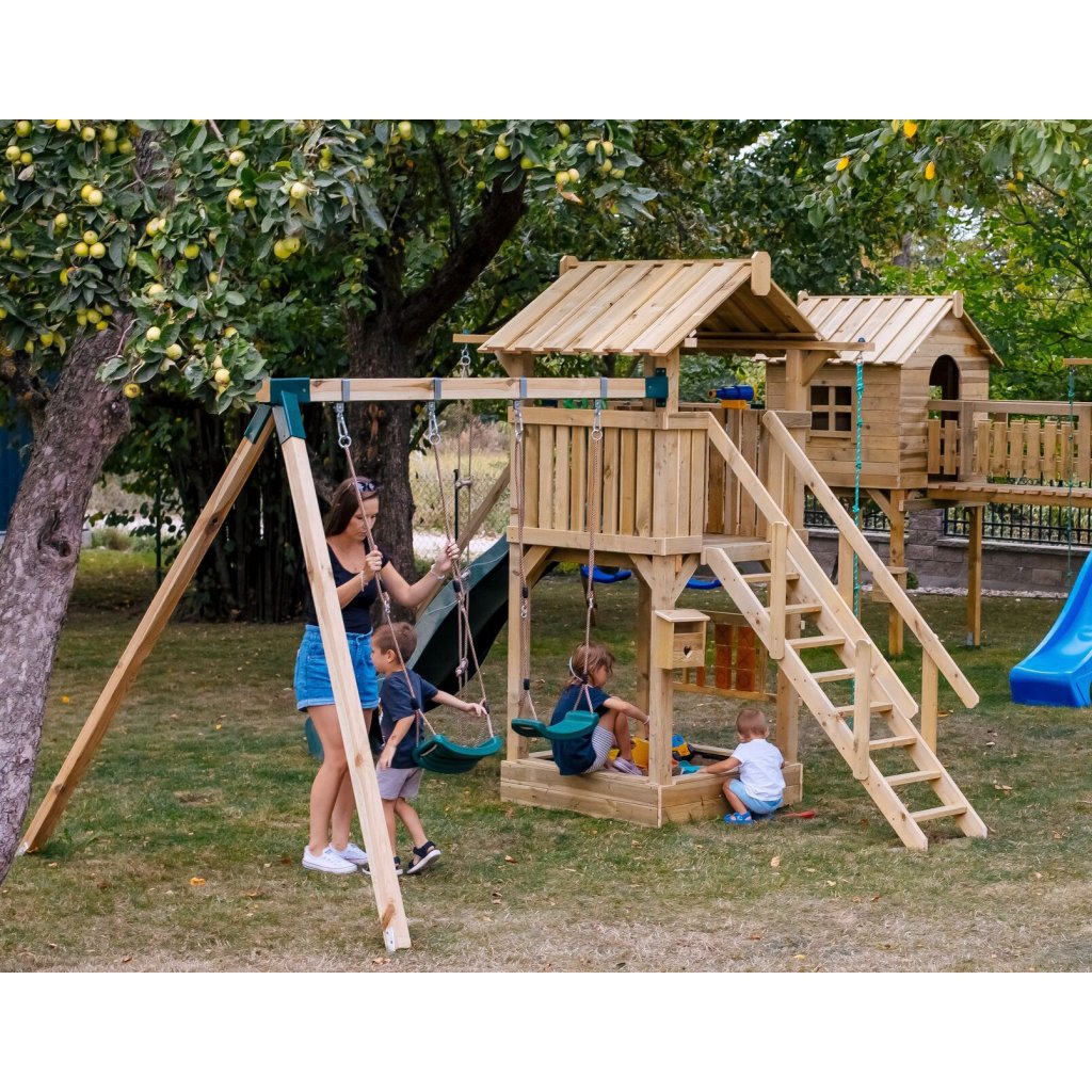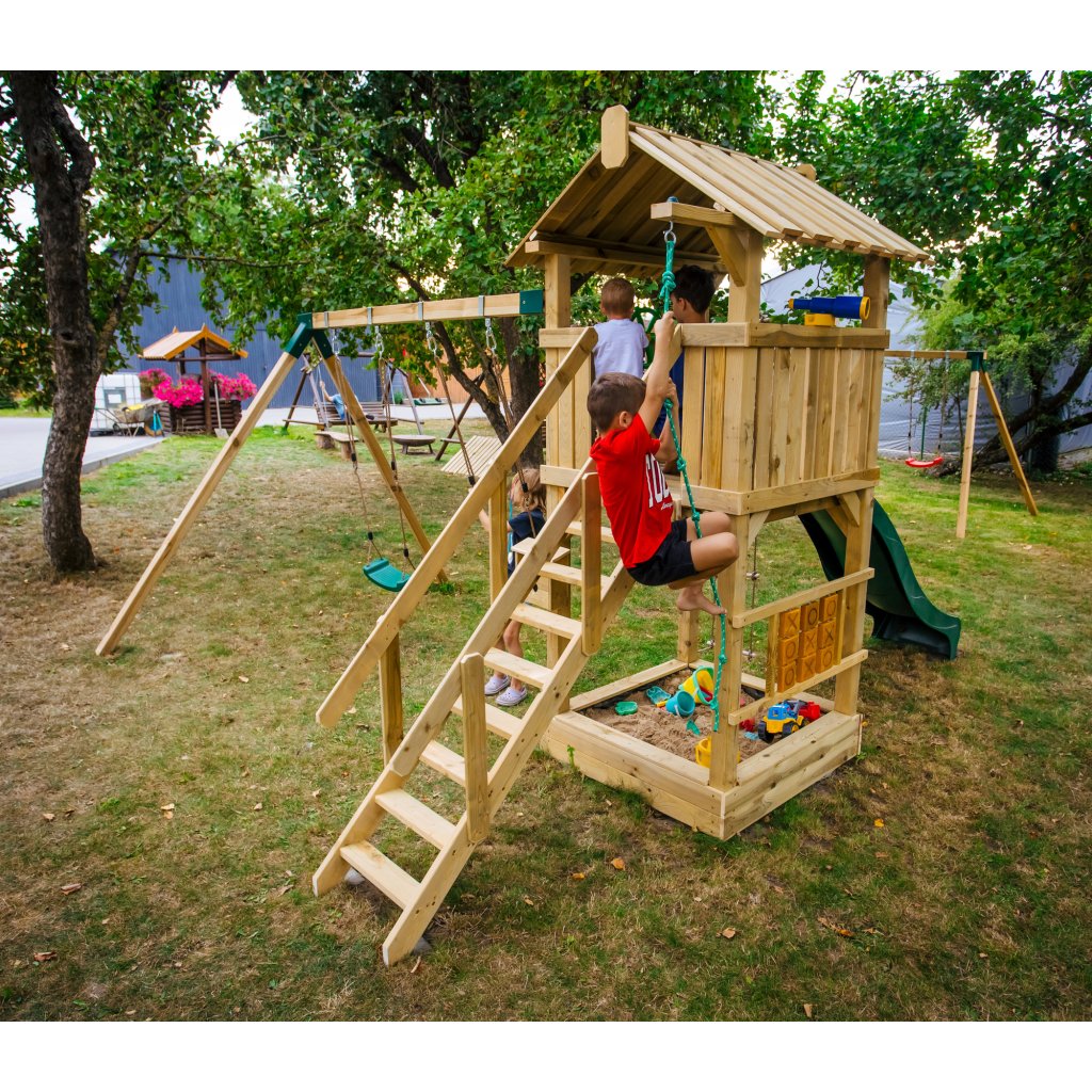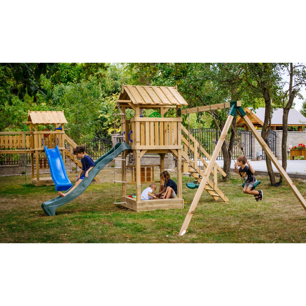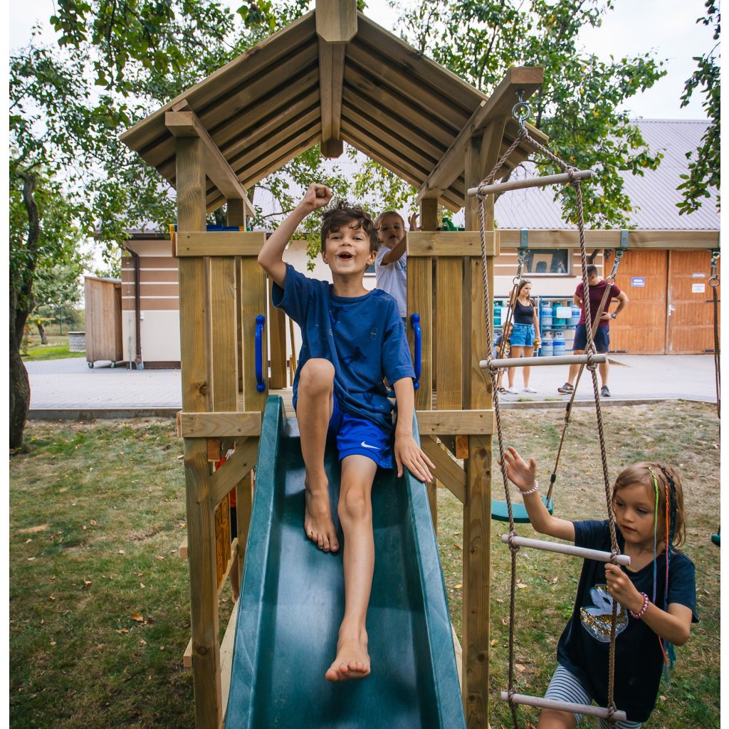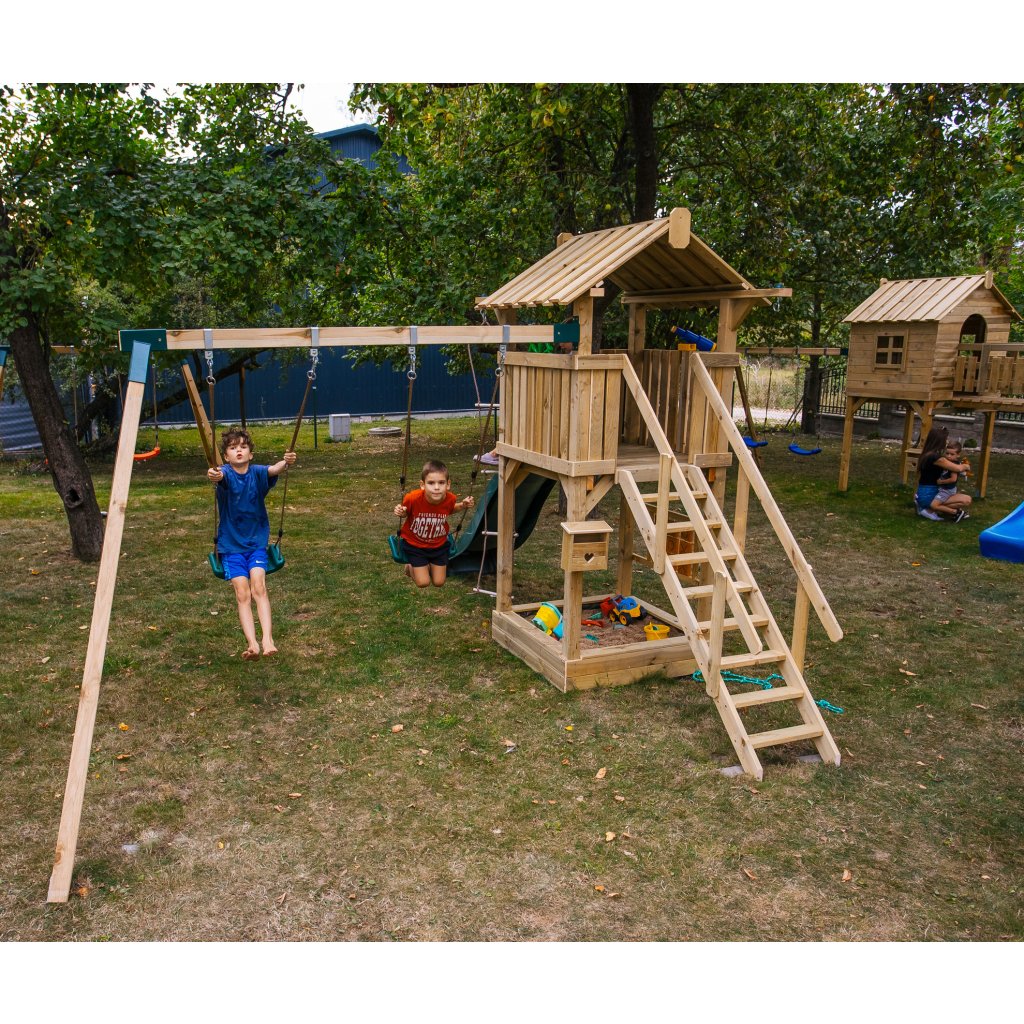 Zostava je vybavená vyvýšeným domčekom s podestou vo výške 128 cm, z ktorej majú deti krásny výhľad do okolia a pocit vlastného útočiska. Z podesty sa môžu s nadšením spustiť po plastovej šmykľavke s dĺžkou 228 cm, ktorá zaručuje plynulú a zábavnú jazdu. Súčasťou hernej veže je rozširujúci hojdačkový modul s dvoma závesnými plastovými hojdačkami, zavesenými na pevných lanách.