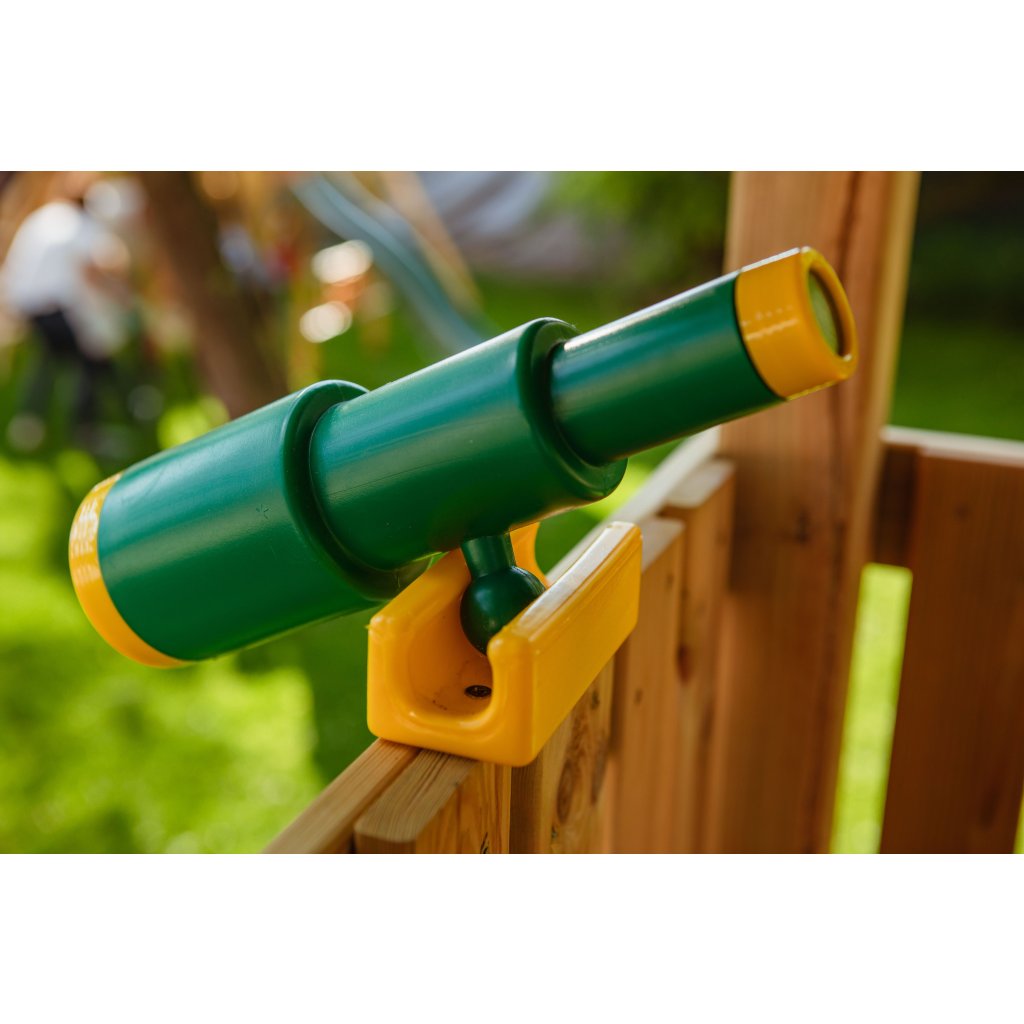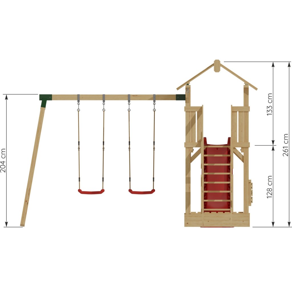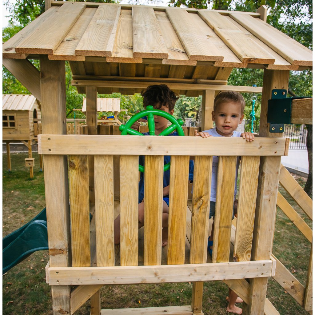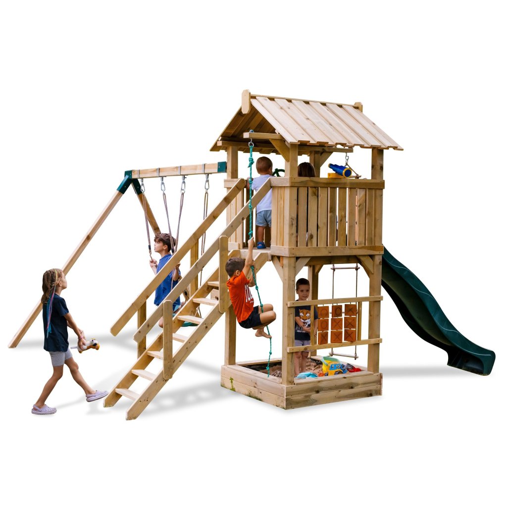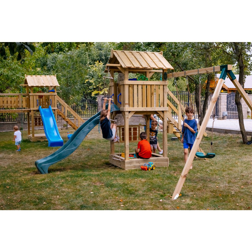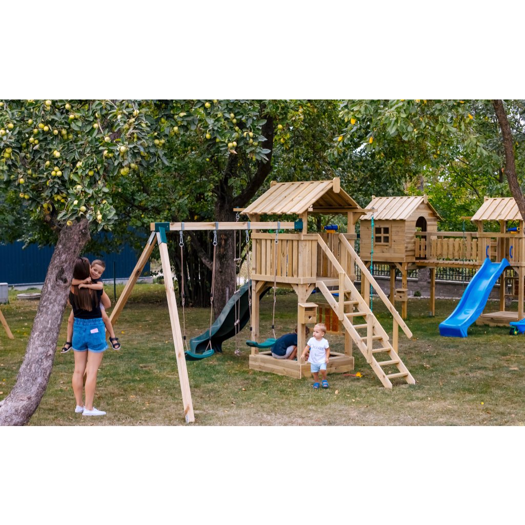 Zostava je vybavená vyvýšeným domčekom s podestou vo výške 128 cm, z ktorej majú deti krásny výhľad do okolia a pocit vlastného útočiska. Z podesty sa môžu s nadšením spustiť po plastovej šmykľavke s dĺžkou 228 cm, ktorá zaručuje plynulú a zábavnú jazdu. Súčasťou hernej veže je rozširujúci hojdačkový modul s dvoma závesnými plastovými hojdačkami, zavesenými na pevných lanách.
