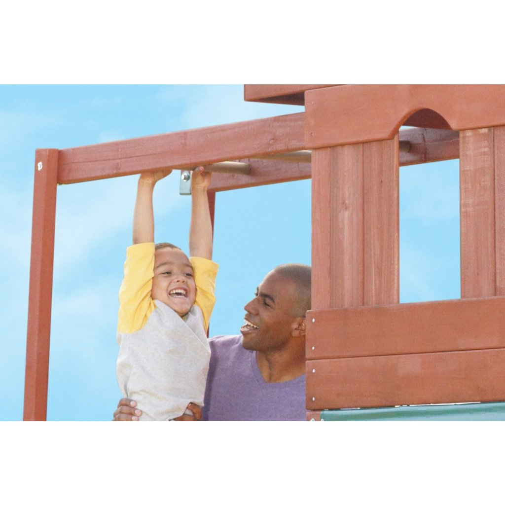 Súčasťou hernej veže je rozšírujúci hojdačkový modul, na ktorom je umiestnená dvojsedačková hojdačka Duoswing a dva hojdačkové sedáky. Všetky plastové časti sú z celoprefarbeného, ??stálofarebného, ??UV odolného plastu na celoročné použitie vonku.Z druhej strany je herná veža rozšírená o ručkovací modul, ktorý je z dreveného cédrového materiálu, vaše deti môžu zlepšovať svoju fyzickú zdatnosť. Zemné kotvy sú tiež súčasťou dodávky, aby zostava bola v teréne bezpečne uchytená.