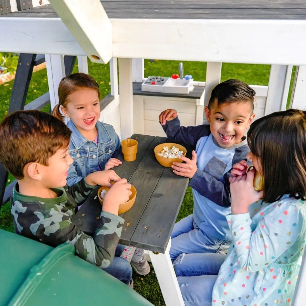 Luxusná herná veža je koncipovaná ako otvorený domček - na podestu vo výške 125 cm je prístup po ležacom rebríku.V spodnej časti hernej veže je z jednej strany umiestnený piknik modul, kde môžu deti pohodlne posedávať, na strane druhej je kuchynka s varnou doskou a kohútikom, kde môžu deti pripravovať najrôznejšie dobroty.Herná veža je zastrešená plastovou strechou.Pre zvýšenie bezpečnosti detí je lezací rebrík v mieste vstupu na podestu doplnený plastovými madlami.