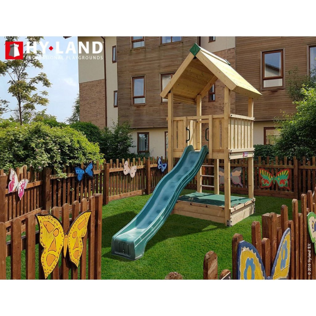 Detské ihrisko Hy-land P2 sa skladá z 1 veže so strechou, 1 nástupného kolmého rebríka (nerezové špruslíky). V spodnej časti zostavy je umiestnené pieskovisko, k tomuto pieskovisku je súčasťou dodávky tiež odolná sieť na pieskovisko, úchyty potrebné na jej upevnenie a podložka pod pieskovisko, ktorá zamedzí prerastaniu trávy do piesku. Strecha zostavy je spojená kovovým ozdobným štítom, ktorý celú strechu.Podlaha veže je vo výške 1,5 m od zeme. K veži je pripojená certifkovaná masívna plastová šmykľavka s dĺžkou 300 cm. Betónovacie kotvenie a všešký spojovací materiál je ošetrený proti korózii zinkom. Zostavu môžete deťom vylepšiť pridaním herných doplnkov, ktoré nájdete v súvisiacom tovare.