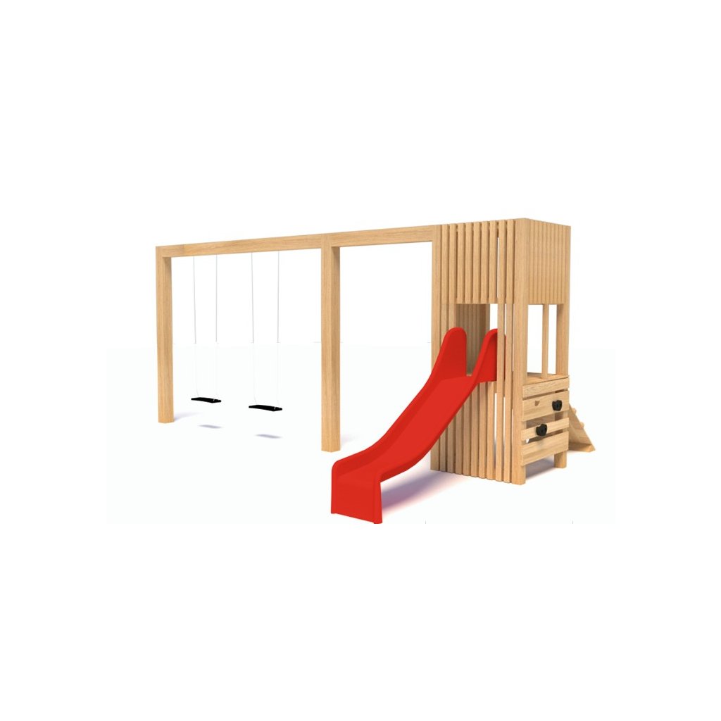 Kvalitní akátová sestava se skluzavkou a dvojhoupačkou - Prismo 2 je vyrobena v moderním designu a je určena do zahrad mateřských a základních škol, na veřejná dětská hřiště, ale doporučujeme ji umístit i ke komerčním objektům - restauracím, hotelům, penzionům, a pod., kde se jistě stane lákadlem pro děti. Krásná masivní herní sestava se skluzavkou a dvojhoupačkou - Prismo 2 je vyrobená z kvalitního a odolného akátového (dubového) dřeva. Herní sestava je složena z těchto částí - věže se střechou, která je zabetonována pevně do terénu. Vstupy na plošinu jsou možné dva - po šikmé plošině s výstupky, po kolmé lezecí stěně s kameny. K sestavě je připojená laminátová skluzavka z výšky 1 m. Věž se skluzavkou je doplněna o dvojhoupačku s certifikovanými houpačkovými sedáky zavěšenými na řetězech.Tato herní sestava je pro děti velmi atraktivní a zajímavá, mohou zde lézt a šplhat, klouzat i houpat na houpačce. Dřevo sestavy je ošetřené vysoce odolnou zdravotně nezávadnou lazurou. . Výška pádu tohoto dětského hřiště je 1,35 metru a proto je nezbytně nutné vytvořit v dopadové oblasti celé herní sestavy tlumící povrch pro případ pádu (např. 30cm silná vrstva písku, kačírku nebo drcené kůry). Minimální prostor s tlumícím povrchem je pod houpačkou 23,5 m2. Náš tip - nejvýhodnější materiál pro vytvoření dopadové plochy tlumící pád z výšky až 3 m jsou pryžové zatravňovací desky Grass a Saf. Jejich instalace je jednoduchá pokládka na terén bez nutnosti zemních prací. Výhody – nevýhody jednotlivých podkladů: Dopadové zatravňovací dlaždice •+zcela bezpečný, rovný , ohraničený povrch •+plní tlumící funkci při dopadu •+estetický vzhled •+nenáročné na údržbu Kačírek ( doporučujeme frakci 4/8) •+plní drenážní funkci •+plní tlumící funkci při dopadu dětí •-děti roznáší kamínky do okolního trávníku Písek •-Zadržuje vodu •-Roznáší se po zahradě •-Dochází k mechanické odírání dřevěných částí herní sestavy •-Láká domácí zvířata ( především kočičky) Mulčovací kůra •-Zadržuje vodu •-Vytváří vlhkost u země a tvoří se plísně •-Sesychá – nutnost doplňovat. Dětské hřiště je určeno pro děti od 3 do 15 let, na děti od 3 do 6 let je nutný dohled dospělé osoby. Sestava se skluzavkou a dvojhoupačkou na dětská hřiště Prismo 2 je certifikovaná dle EN 1176 pro veřejná dětská hřiště.Dodatočné parametre