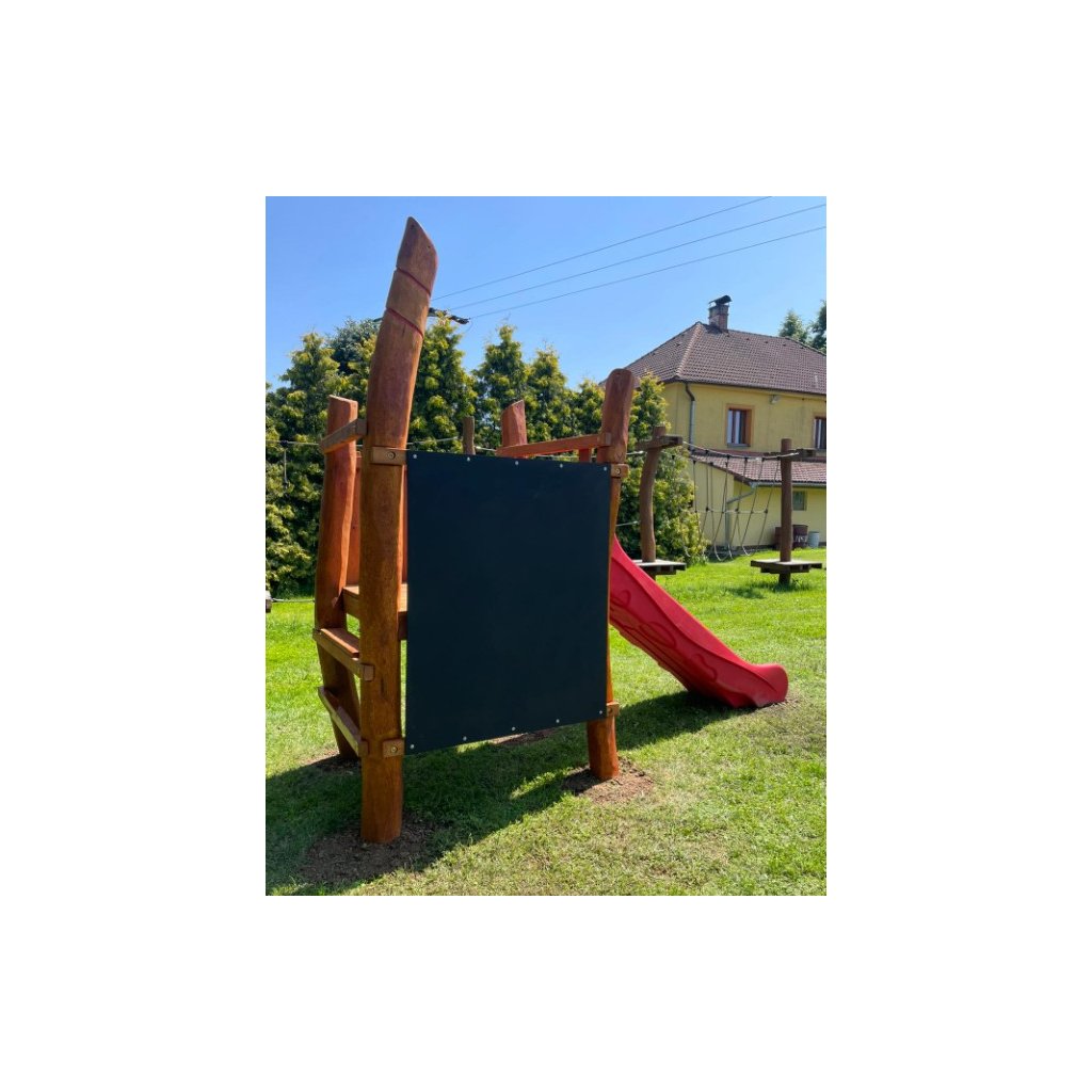 Kvalitní základní akátová sestava se skluzavkou - Lisa je určena do zahrad mateřských a základních škol, na veřejná dětská hřiště, ale doporučujeme ji umístit i ke komerčním objektům - restauracím, hotelům, penzionům, a pod., kde se jistě stane lákadlem pro děti. Krásná masivní herní sestava se skluzavkou - Lisa je vyrobená z kvalitního a odolného akátového (dubového) dřeva, které je natřené lazurou (odstín dle přání zákazníka, případně může dřevo zůstat bez ošetření). Sestava je z tvrdého dřeva má dlouhou životnost bez větších nároků na údržbu.. Herní sestava je složena z těchto částí - věže bez střechy, která je zabetonována pevně do terénu. Vstup na plošinu je možný po žebříku s dřevěnými stupni. Na boku sestavy je umístěna velká tabule na malování, vyrobená z voděodolné překližky upravené nátěrem tabulovou barvou. Součástí dodávky je i odolná laminátová skluzavka. Tato herní sestava je pro děti velmi atraktivní a přitom je to ekonomické řešení kvalitní akátové sestavy se skluzavkou. Výška volného pádu této sestavy se skluzavkou Lisa je 1 m a proto může herní sestava mít jako dopadovou plochu jen udržovaný trávník a není nutné tvořit speciální dopadové plochy. Pokud není na pozemku kvalitní trávník nebo hrozí jeho vyšlapání, doporučujeme zde položit pryžové zatravňovací desky Grass nebo Saf z naší nabídky. Dětské hřiště je určeno pro děti od 3 do 12 let, na děti od 3 do 6 let je nutný dohled dospělé osoby. Sestava z akátu se skluzavkou Lisa je certifikovaná dle EN 1176 pro veřejná dětská hřiště.Dodatočné parametre