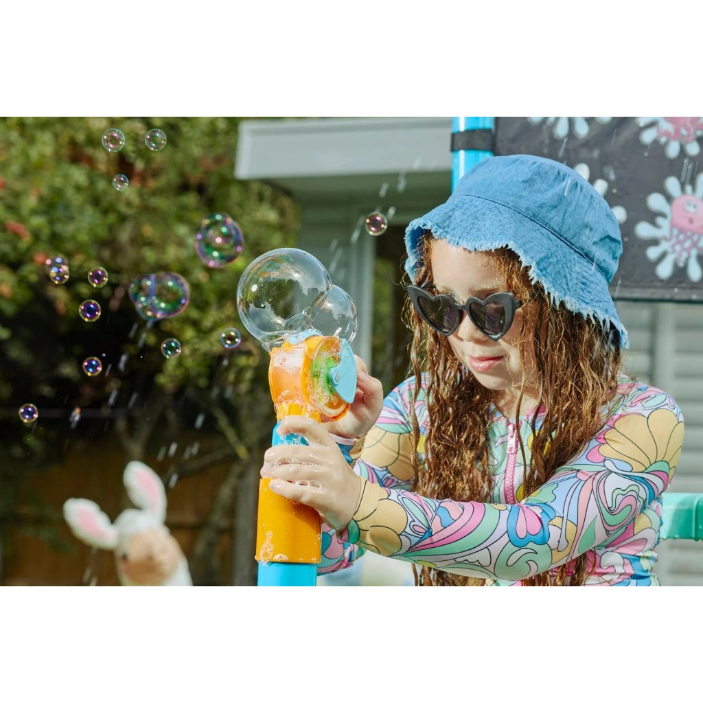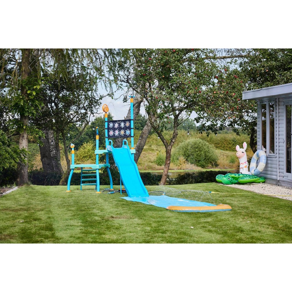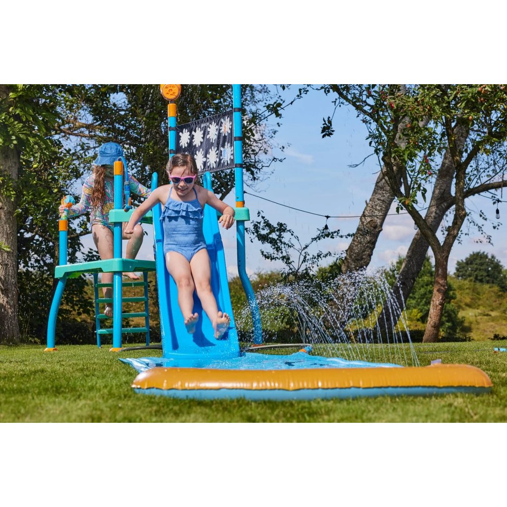 Detské ihrisko Plum Water Park je perfektným riešením, ako preniesť zábavu z aquaparku na záhradu. Deti môžu liezť a kĺzať sa, jednoducho pripojte hadicu, nechajte vodu tiecť a zábava môže začať! Toto vodné herné centrum má štyri vodné doplnky, ktoré podporujú zdravú aktívnu hru a pomáhajú deťom rozvíjať motorické zručnosti a koordináciu. Vodná pištoľ je ideálna pre vodné súboje s priateľmi alebo pre precvičovanie mierenia. Rozprašovače pomáhajú udržiavať deti v chlade počas horúcich slnečných dní a bublifuk poskytuje ďalšie zmyslové hranie. Deti si môžu užiť ešte viac zábavy s zafarbovacou stenou. Deti sa môžu naučiť spoznávať svoje obľúbené morské tvory namierením vodnej pištole na stenu, aby odhalili podvodné živočíchy, a tak prepojiť učenie s hraním. Zafarbovaciu stenu možno tiež používať so štetcom a nádobou na vodu. Akonáhle sa deti dohrajú na plošinách, môžu sa spustiť po 1,8 metra dlhej vodnej šmykľavke a po 3-metrovej dojazdovej ploche, ktorá je vybavená postrekovačmi pre dokonalé kĺzanie! Toto herné centrum je ideálne pre hru na mokre aj na suchu a prináša na vašu záhradu nekonečnú zábavu po celý rok. Súčasťou je 4cestná hadicová spojka, protišmykové herné plošiny a schodíky. Oceľový rám je práškovo lakovaný a pozinkovaný pre maximálnu ochranu proti korózii. Parametre: Materiál: kov Farba: tyrkysová/ modrá Rozmer: 248 x 450 x 204cm Max. hmostnosť používateľa: 50kg Vhodné pre deti od: 3 rokovDodatočné parametre