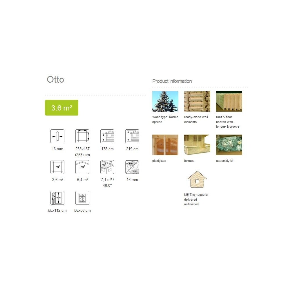 Domček je vyrobený z kvalitného, ??smrekového dreva, v prevedení čisté drevo. Sila stien 16 mm.
