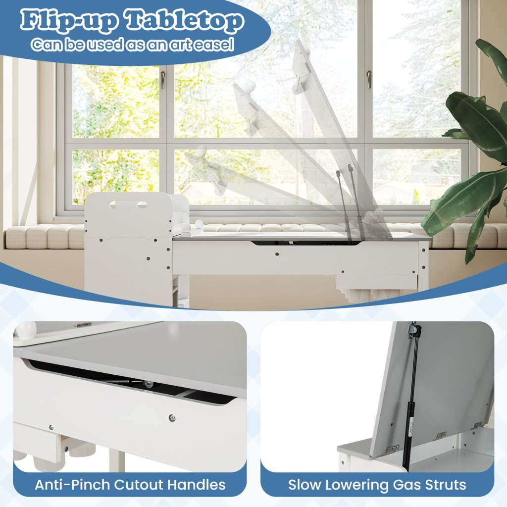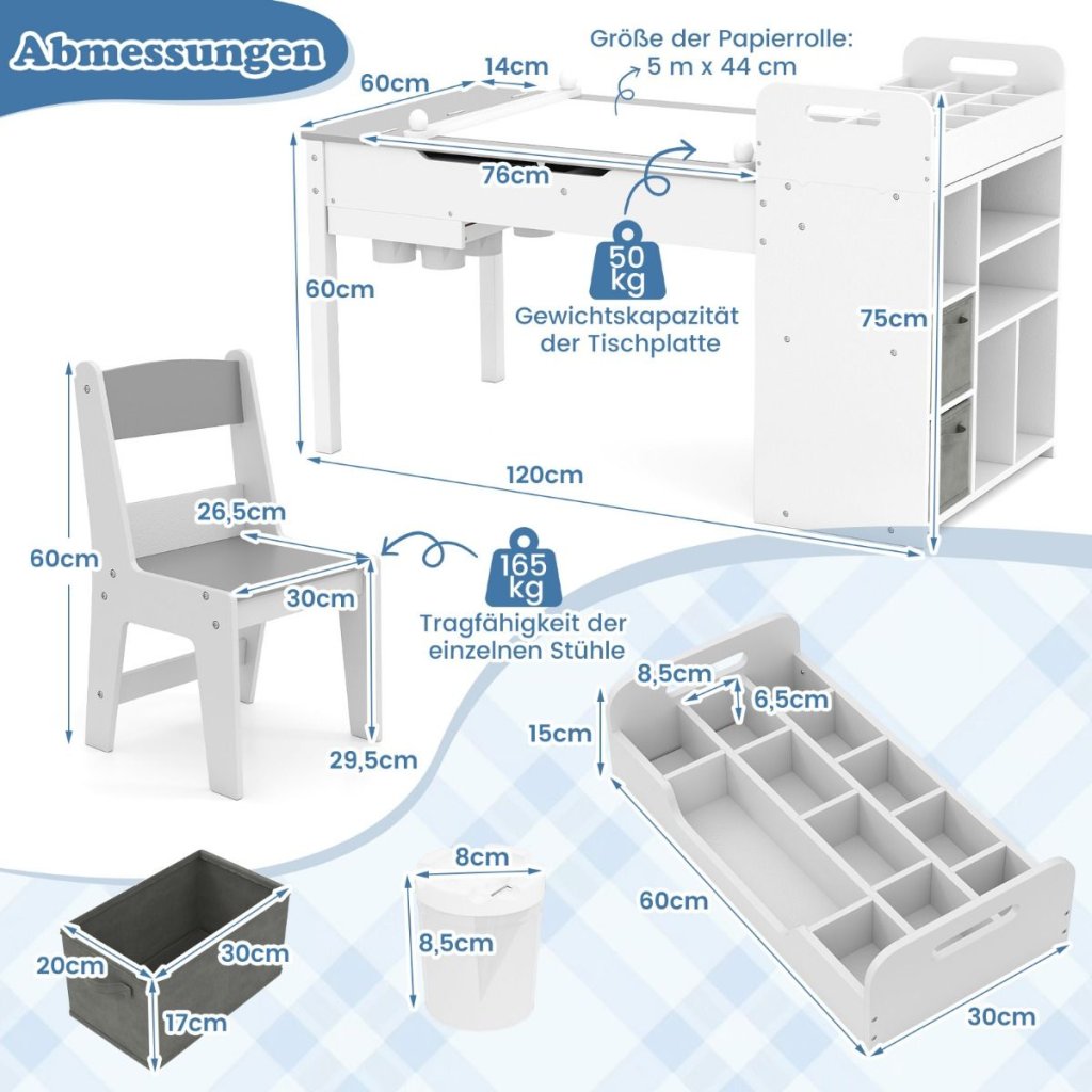 Multifunkčný detský písací stôl je vybavený vyklápacou tabuľou a ponúka dostatok priestoru na kreslenie, maľovanie alebo robenie domácich úloh. Súčasťou sú aj stoličky s vysokým operadlom, ktoré poskytuje vynikajúcu oporu chrbtici vášho dieťaťa a podporuje správne držanie tela počas štúdia a domácich úloh. Strana stola je vybavená poličkami a slúži na ukladanie vecí. Tento produkt je vytvorený s dôrazom na detail, má hladké a okrúhle hrany a skryté skrutky, ktoré zaistia bezpečnosť vášho dieťaťa. Parametre: Farba: natural Materiál: MDF + borovicové drevo Rozmery stola: 120 cm x 60 cm x 60 cm (D x Š x V) Rozmery stoličky: 33 cm x 32 cm x 60 cm (D x Š x V) Veľkosť rolky papiera: 5 m x 44 cm Nosnosť dosky stola: 50 kg Nosnosť každej stoličky: 165 kg Čistá hmotnosť: 34 kg Balíček obsahuje: 1 x umelecký stôl 2 x stolička 2 x látkový box 1 x úložný priestor vo vnútri stola 8 x nádoba na farbu 1 x rolka papiera 1 x Návod na použitieDodatočné parametre