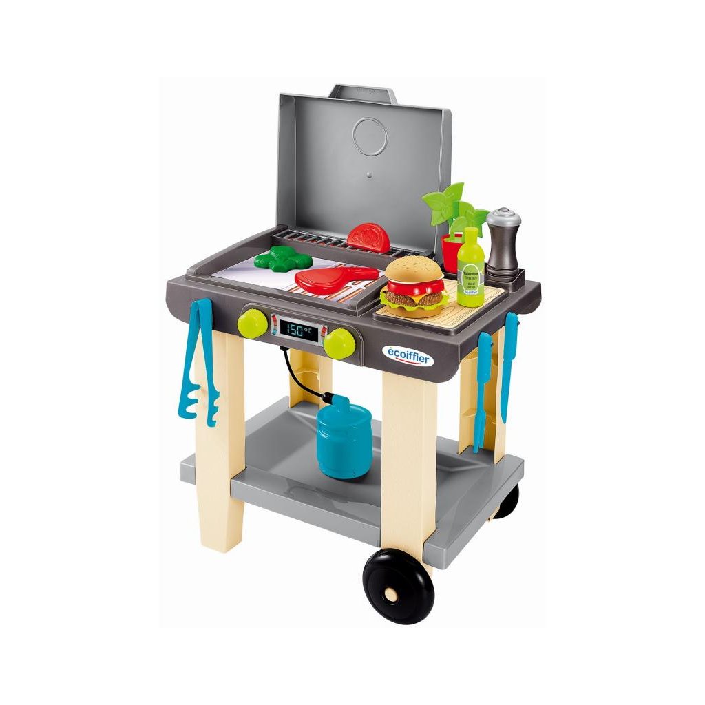 Detský gril s vekom, stolčekom na kolieskach a množstvom príslušenstva, kde sa môžu pripravovať najrôznejšie gurmánske špeciality. Set obsahuje: makety potravín, plynovú fľašu, mlynček so soľou, olivový olej, bazalku v kvetináči a riad potrebný na varenie a krájanie. Rozmery: 43,5 x 59 x 28 cm (otvorený), 43,5 x 40,5 x 28 cm (zatvorený)Dodatočné parametre