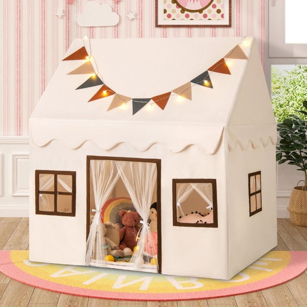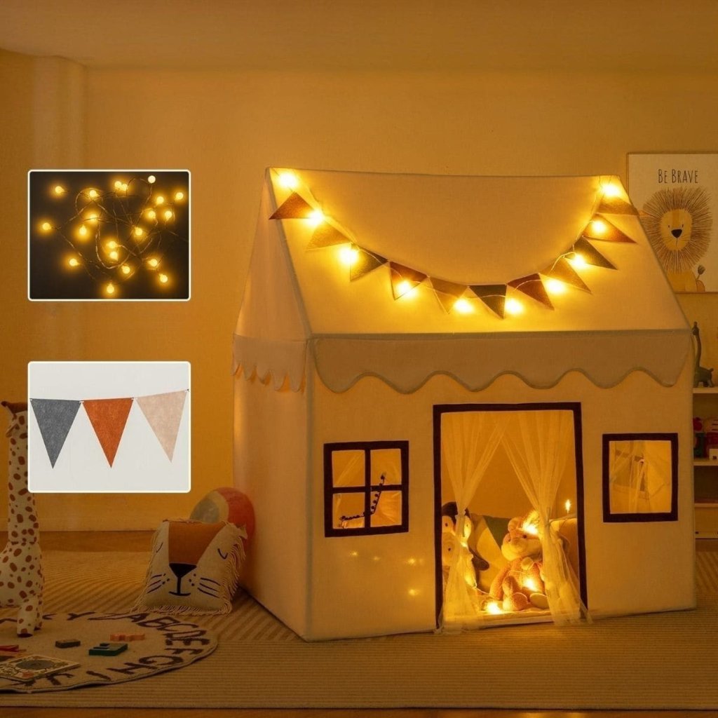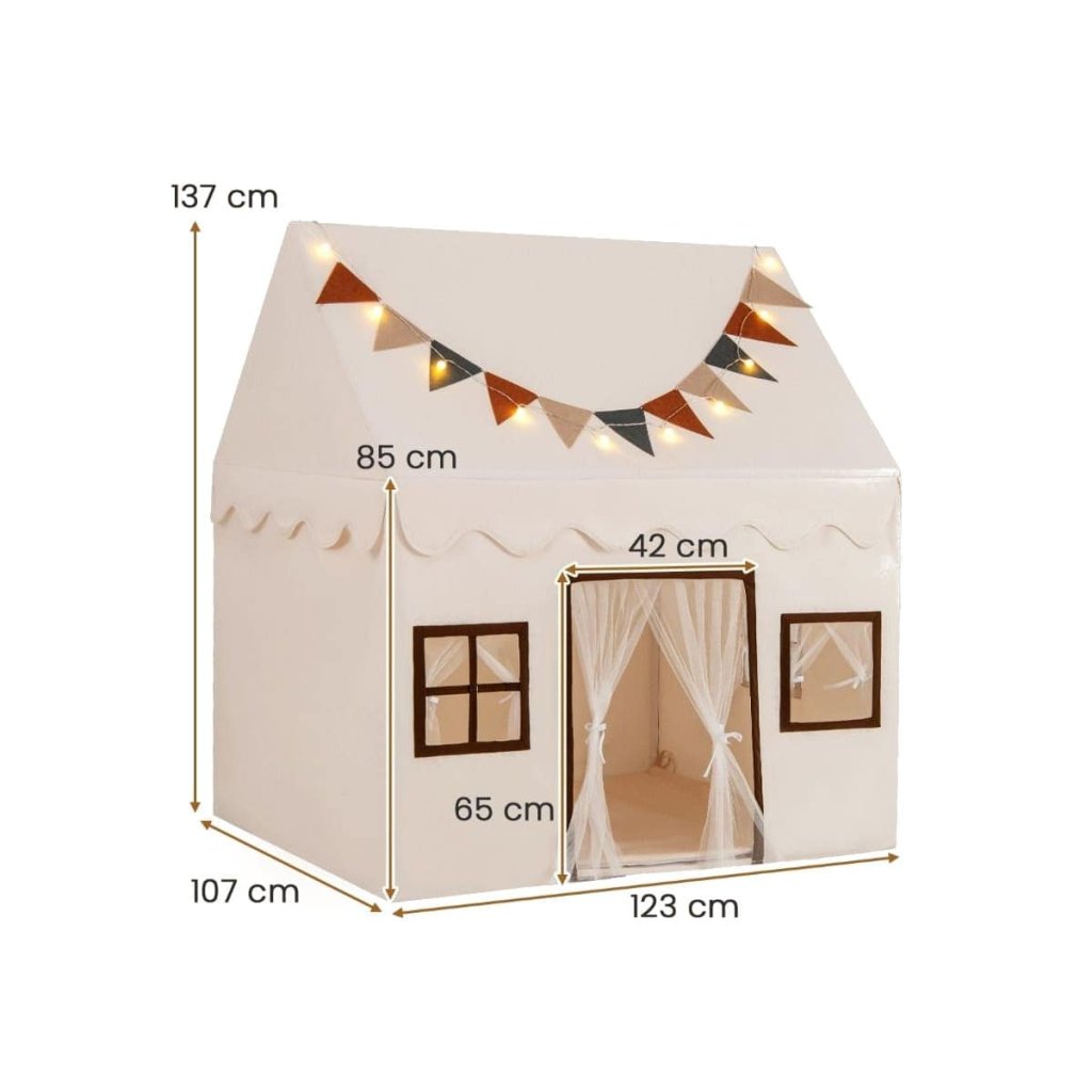 Detský stan na hranie je perfektným darčekom pre chlapcov a dievčatá, ktorí chcú mať svoju tajnú základňu. Priestranný stan umožňuje deťom pozvať svojich najlepších kamarátov na spoločné hranie. Vďaka priedušným sieťovaným závesom sa v interiéri necíti dusno. Domček na hranie je podoprený silnými PVC rúrkami a je veľmi robustný a stabilný. Protišmyková podložka zabraňuje skĺznutiu stanu, zatiaľ čo mäkký povrch z koralového zamatu poskytuje pocit šetrný k pokožke. Vylepšená spodná rámová rúrka a konektor slúži ako plochý prah, takže sa vašim deťom ľahšie nastupuje a vystupuje a nezakopávajú oň. Pútavé svetlá hviezd navyše vytvárajú hrejivú a útulnú atmosféru. Stan môže slúžiť ako čítací kútik, maznanie alebo miesto na spanie pre deti. Špecifikácia Farba: Svetlo hnedá Materiál: Polyester bavlna, PVC, koralový zamat Celkové rozmery: 123 x 107 x 137 cm (D x Š x V) Čistá hmotnosť: 3,5 kg Typ batérie: 2 x AA batérie (nie sú súčasťou balenia) Vhodný vek: 3+ Rozsah dodávky: 1 x detský stan 1 x reťazec hviezd 1 x farebná reťaz 1 x protišmyková podložka 1 x návodDodatočné parametre