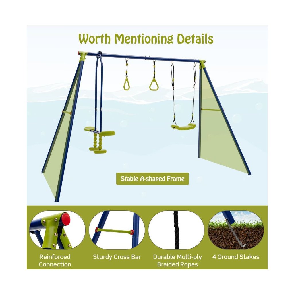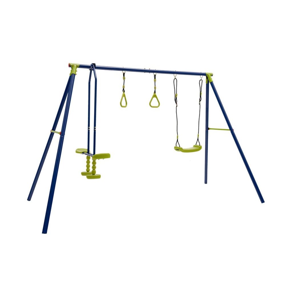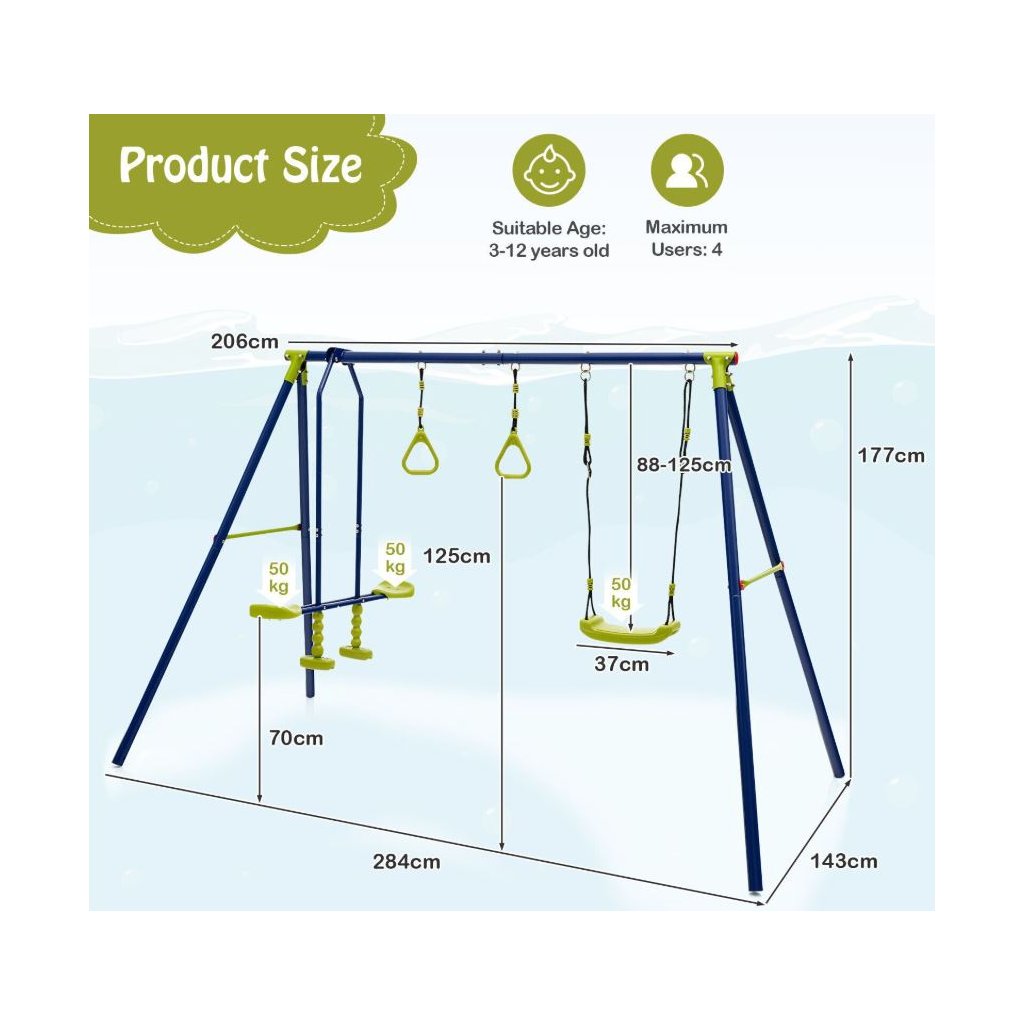 Záhradná kovová hojdačka 3 v 1. Hojdačka zanechá vo vašich deťoch vzácne a sladké spomienky na detstvo! Hojdacia zostava je vabavená hojdacím sedákom, dvojhojdačkou a madlami. Zostavu je možné využiť naplno aj s kamarátmi. Môžete nastaviť výšku sedadla hojdačky medzi 88 cm a 128 cm, aby vyhovovala všetkým potrebám. Ďalšie zemné hroty dodávajú stojanu na hojdačku väčšiu stabilitu. Hodiny zábavy môžu začať! Parametre: Farba: modrá, zelená Materiál: kov, PE Celkové rozmery: 278 x 142 x 177 cm (D x Š x V) Nastaviteľná výška hojdačky: 88 cm-128 cm Max. hmotnosť každej hojdačky: 50 kg Max. hmotnosť dvojhojdačky: 100kg Maximálny povolený počet detí: 4 Odporúčaný vek: 3-10 rokov Čistá hmotnosť: 21 kg Rozsah dodávky: 1 x hojdačka 4 x zemné hroty 1 x užívateľská príručkaDodatočné parametre