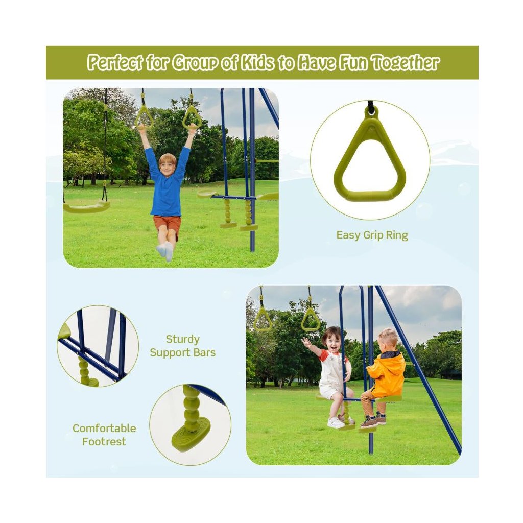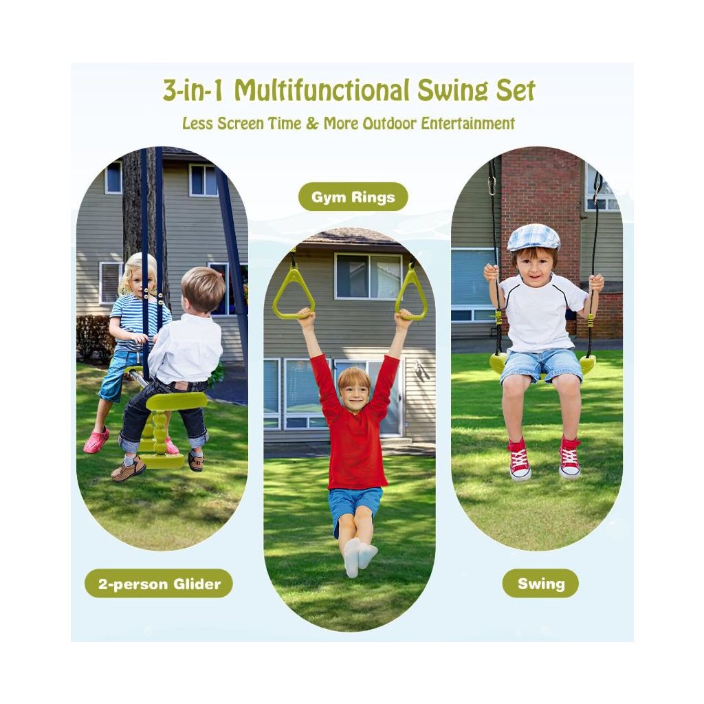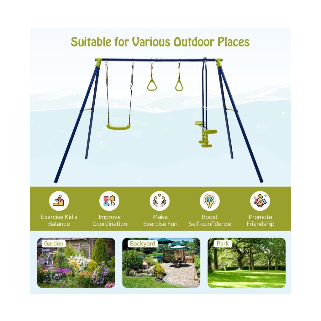 Záhradná kovová hojdačka 3 v 1. Hojdačka zanechá vo vašich deťoch vzácne a sladké spomienky na detstvo! Hojdacia zostava je vabavená hojdacím sedákom, dvojhojdačkou a madlami. Zostavu je možné využiť naplno aj s kamarátmi. Môžete nastaviť výšku sedadla hojdačky medzi 88 cm a 128 cm, aby vyhovovala všetkým potrebám. Ďalšie zemné hroty dodávajú stojanu na hojdačku väčšiu stabilitu. Hodiny zábavy môžu začať! Parametre: Farba: modrá, zelená Materiál: kov, PE Celkové rozmery: 278 x 142 x 177 cm (D x Š x V) Nastaviteľná výška hojdačky: 88 cm-128 cm Max. hmotnosť každej hojdačky: 50 kg Max. hmotnosť dvojhojdačky: 100kg Maximálny povolený počet detí: 4 Odporúčaný vek: 3-10 rokov Čistá hmotnosť: 21 kg Rozsah dodávky: 1 x hojdačka 4 x zemné hroty 1 x užívateľská príručkaDodatočné parametre