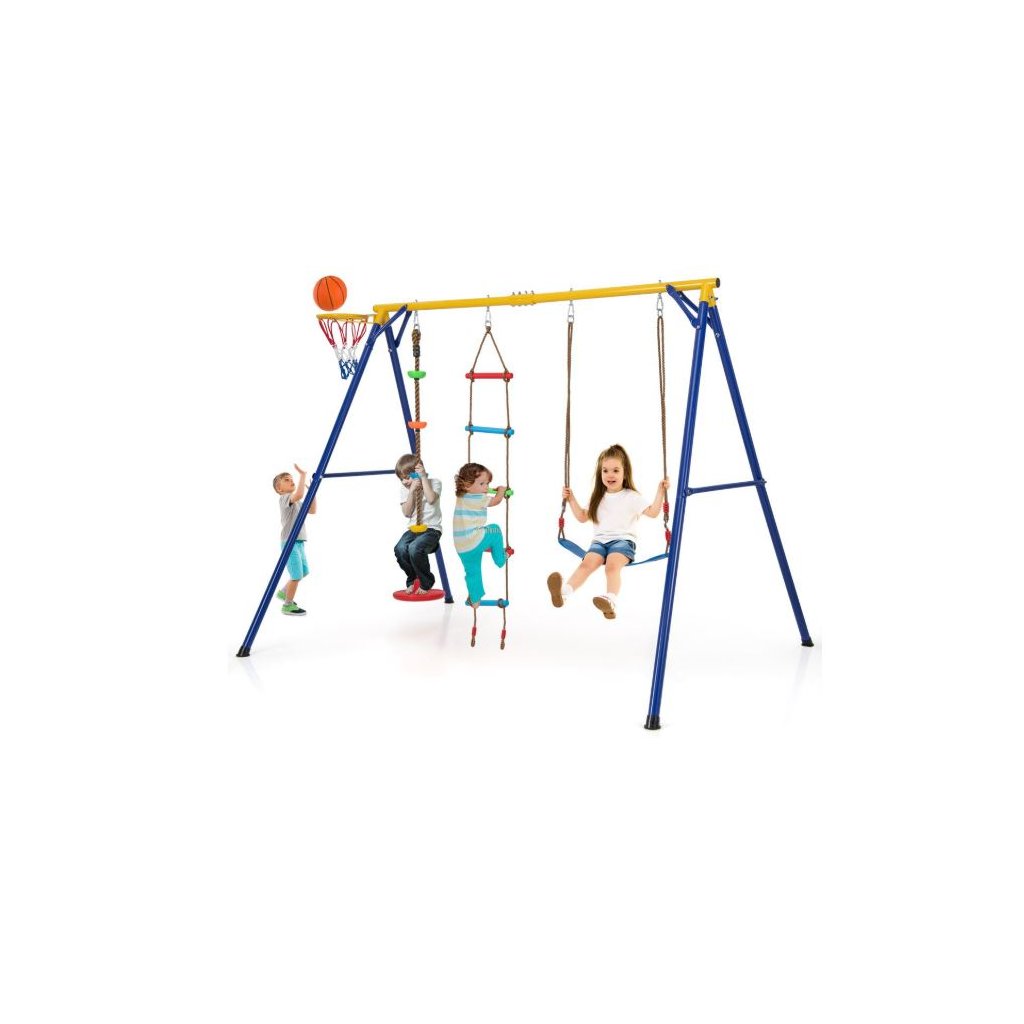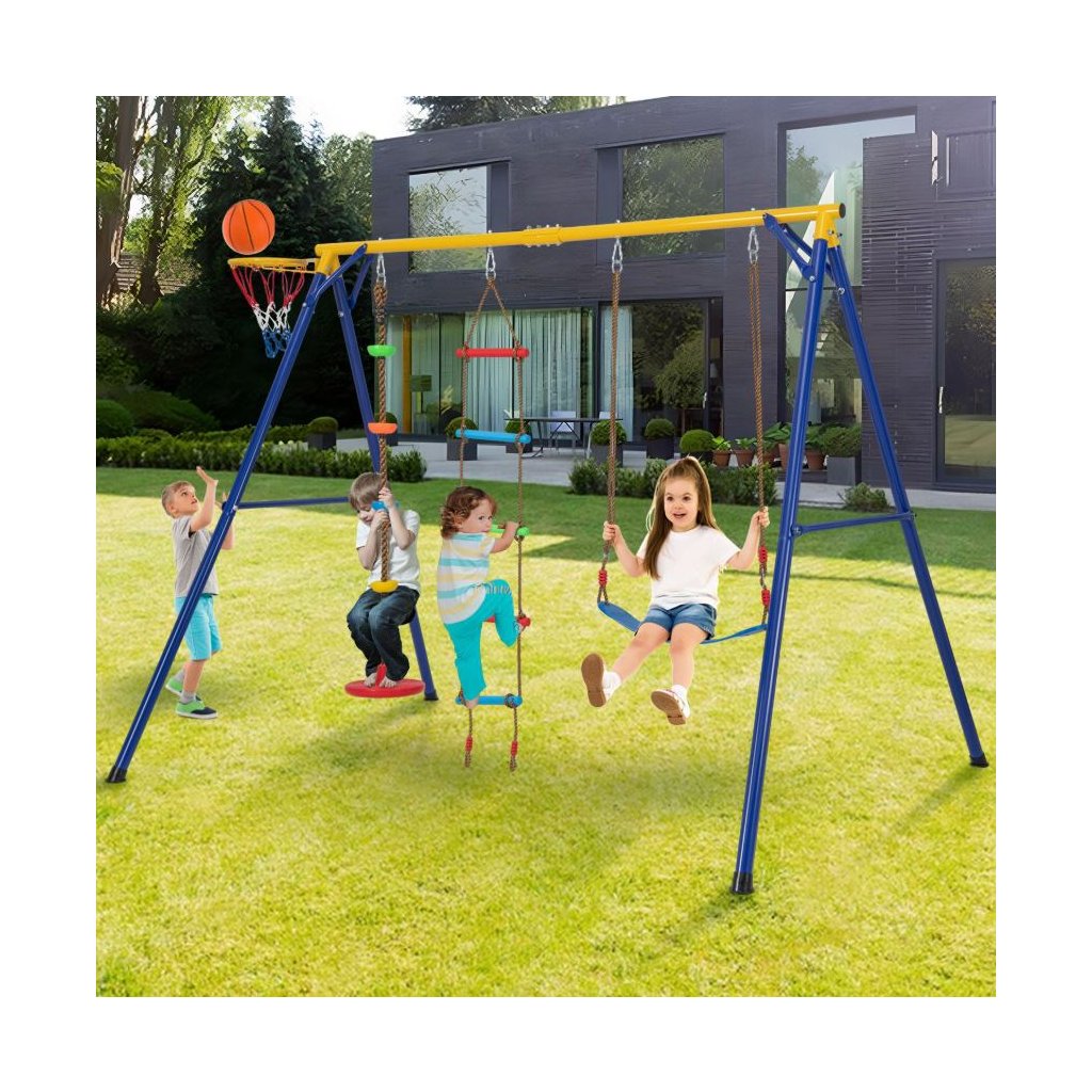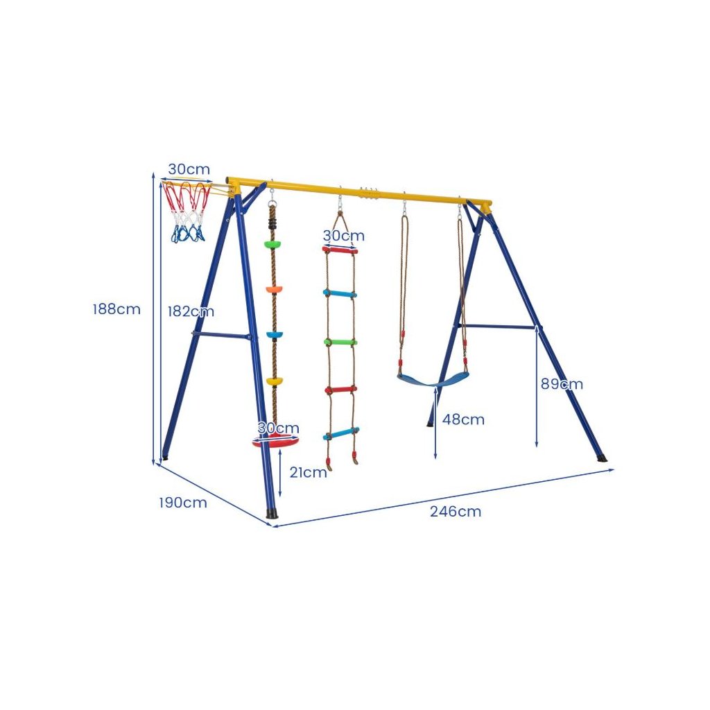 Záhradná kovová hojdačka 4 v 1. Multifunkčná hojdačka 4 v 1 je skvelou voľbou pre zábavu vašich detí. Súčasťou dodávky je 1 basketbalový kôš, 1 šplhací rebrík s farebnými priečkami, 1 disková hojdačka s lanom a 1 hojdačka prak, aby deti mohli hádzať, šplhať alebo sa hojdať. Na celú hojdačky sa navyše zmestia až 4 deti (vážiace nie viac ako 300 kg), takže sa deti môžu baviť spoločne so svojimi kamarátmi. Balenie navyše obsahuje 4 protišmykové podložky na stojky a 6 zemných hrotov, ktoré zaistia stabilitu. Hodiny zábavy môžu začať! Parametre: Farba: žltá + modrá Materiál: uhlíkový kov, PVC, PP, EVA Celkové rozmery: 246 cm x 190 cm x 188 cm (D x Š x V) Celková nosnosť: 300 kg Nosnosť lana s diskom: 100 kg Nosnosť šplhacieho rebríka: 100 kg Nosnosť hojdačky prak: 100 kg Maximálny počet detí: 4 deti Vek: 3-9 rokov Čistá hmotnosť: 22 kg Rozsah dodávky: 1 x konštrukcia 4 x podložky na stojky 6 x zemné hroty 1 x manuálDodatočné parametre