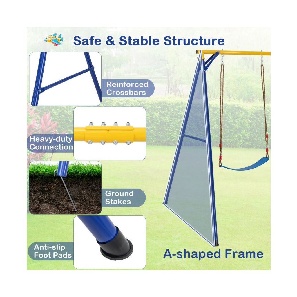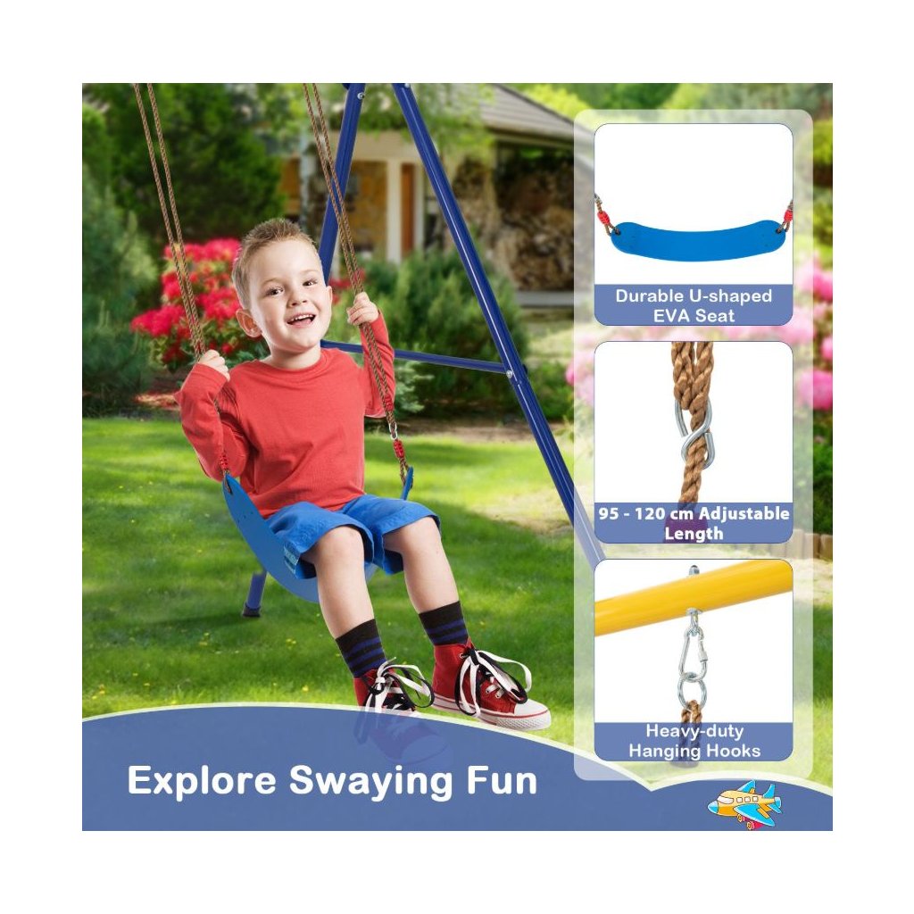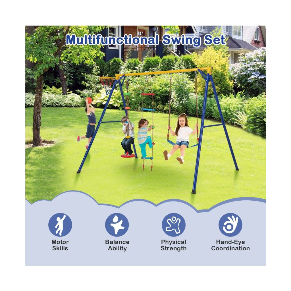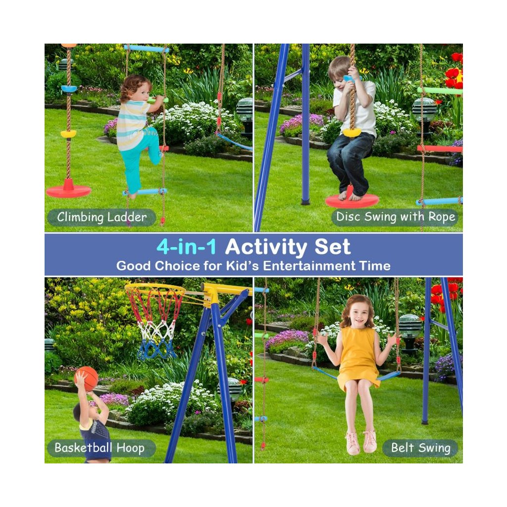 Záhradná kovová hojdačka 4 v 1. Multifunkčná hojdačka 4 v 1 je skvelou voľbou pre zábavu vašich detí. Súčasťou dodávky je 1 basketbalový kôš, 1 šplhací rebrík s farebnými priečkami, 1 disková hojdačka s lanom a 1 hojdačka prak, aby deti mohli hádzať, šplhať alebo sa hojdať. Na celú hojdačky sa navyše zmestia až 4 deti (vážiace nie viac ako 300 kg), takže sa deti môžu baviť spoločne so svojimi kamarátmi. Balenie navyše obsahuje 4 protišmykové podložky na stojky a 6 zemných hrotov, ktoré zaistia stabilitu. Hodiny zábavy môžu začať! Parametre: Farba: žltá + modrá Materiál: uhlíkový kov, PVC, PP, EVA Celkové rozmery: 246 cm x 190 cm x 188 cm (D x Š x V) Celková nosnosť: 300 kg Nosnosť lana s diskom: 100 kg Nosnosť šplhacieho rebríka: 100 kg Nosnosť hojdačky prak: 100 kg Maximálny počet detí: 4 deti Vek: 3-9 rokov Čistá hmotnosť: 22 kg Rozsah dodávky: 1 x konštrukcia 4 x podložky na stojky 6 x zemné hroty 1 x manuálDodatočné parametre