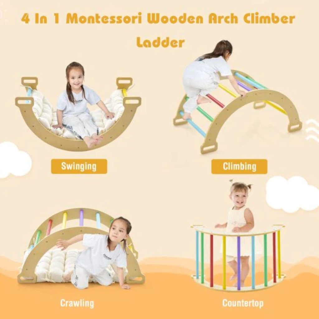 Vďaka mäkkému vankúšu sa deti pri sedení na hojdačke cítia pohodlne. Je tiež vyrobený z masívneho dreva, aby bola zaistená vysoká odolnosť a veľká nosnosť. Vďaka obojstrannému dizajnu je možné túto klenbu použiť nielen ako lezecký rebrík, ale môže slúžiť aj ako hojdačka na relaxáciu a priniesť deťom veľa zábavy. Okrem toho počas procesu hojdania alebo lezenia vaše dieťa zlepšuje rovnováhu, rozširuje motoriku a buduje sebadôveru. Aby sme deťom poskytli väčšie pohodlie, špeciálne sme ho navrhli s mäkkým vankúšikom. Vankúš je potiahnutý bavlneným plátnom, ktoré je šetrné k pokožke. Pohodlná výplň z PP bavlny dáva dieťaťu pocit, že sa dotýka obláčika. Praktické popruhy tiež zaisťujú lepšiu fixáciu. Prírodný drevený materiál je zdravotne nezávadný, šetrný k deťom a dostatočne pevný na to, aby uniesol 50 kg. Zaoblené hrany zabraňujú náhodnému poškriabaniu alebo nárazom. Nemusíte sa teda báť, že by sa vaše dieťa pri hraní často zranilo. Kompaktný lezecký oblúk má ideálne rozmery pre miestnosti s obmedzeným priestorom. Vaše deti ho môžu využívať v škôlkach, herniach, obývačkách alebo denných centrách. Okrem toho sa priestorovo úsporný vankúš dá ľahko uložiť pod pohovku alebo posteľ, keď sa nepoužíva. Parametre: Rozmery lezeckého oblúka: 81 x 50 x 38,5 cm (D x Š x V) Rozmery vankúša: 86 x 49 x 8,5 cm (D x Š x V) Materiál: borovicové drevo, bukové drevo, bavlnené plátno, PP bavlna Celková nosnosť: 50 kgDodatočné parametre