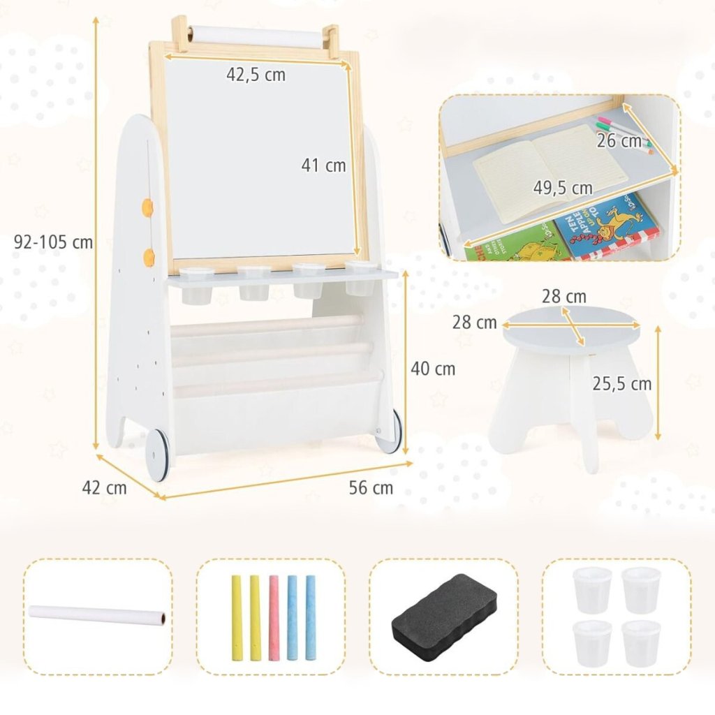 Biely multifunkčný stojan s obojstrannou magnetickou tabuľou, kde deti môžu popustiť uzdu svojej fantázii a kreatívne tvoriť! S touto obojstrannou tabuľou a rolkou výkresového papiera môžu deti pripevňovať magnetické nálepky alebo jednoducho cvičiť kreslenie, maľovanie, písanie a hláskovanie. Vstavaná kovová sponka pomáha papier zaistiť. Stojan má tiež priestranné úložné priestory, v ktorých sú maliarske a kresliace potreby prehľadne usporiadané a ľahko dostupné. Ak deti trávia veľa času kreslením, môžu si oddýchnuť a posadiť sa na stoličku, ktorá je súčasťou sady. Deti môžu svoje obľúbené rozprávkové knihy alebo zošity uložiť do spodnej časti stojana. Stojan je na kolieskach, takže ho deti môžu ľahko presúvať po izbe. Stojan je nastaviteľný do 2 výšok a je vhodný pre deti rôzneho veku. Parametre: Farba: prírodná Materiál: MDF, borovicové drevo Rozmery stola: 56 x 42 x 92-105 cm (dĺžka x šírka x výška) Rozmery tabule/bielej tabule: 42,5 x 41 cm (D x V) Rozmery papierovej rolky: 5 m x 44 cm (D x Š) Rozmery stoličky: 28 x 28 x 25,5 cm (priemer x V) Vhodný vek: od 3 rokov Odporúčaná výška: 80–155 cm Čistá hmotnosť: 4,5 kg Obsah balenia: 1 x detský stojan 1 x stolička 1 x krieda 1 x fixka 1 x špongia 4 x nádoby na farby 1 x rolka papiera 1 x návod na použitieDodatočné parametre