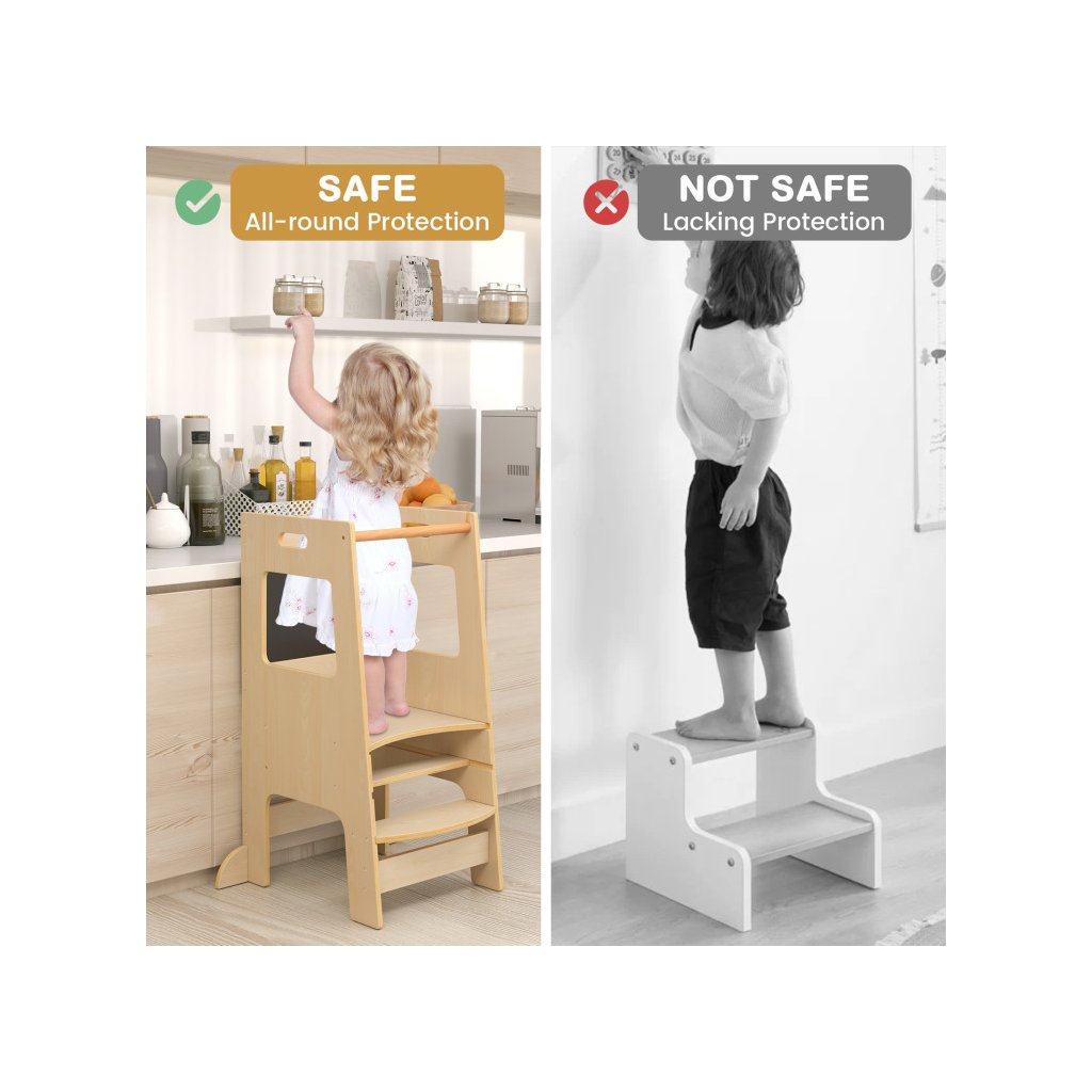 Učiaca veža v minimalistickom drevenom masívnom prevedení sa stane nepostrádateľným pomocníkom každej domácnosti s malými deťmi. Rozvíja a podporuje samostatnosť a schopnosti detí v bežných každodenných činnostiach, ako je čistenie zúbkov, asistencia rodičom v kuchyni, v dielni, umožní dosiahnuť deťom na ich obľúbené hračky a pod. Skvelým bonusom je obojstranná kresliaca tabuľa na kriedy, kde deti môžu rozvíjať svoju kreatívnu fantáziu. Veža sa veľmi ľahko prenáša. Severský dizajn skvele zapadne aj do moderne ladeného interiéru, drevené masívne prevedenie odkazuje k tradničnému materiálu, a farebne neutrálne prevedenie je vhodné pre chlapcov aj dievčatká. *Stabilná konštrukcia sa postará o bezpečnosť Vašich detí *Vysoké bočnice zadná prepážka chránia deti pred pádom *Moderný dizajn v naturálnom prevedení *Kresliaca tabuľa súčasťou veže Parametre: Farba: Prírodné Materiál: Drevo Celkové rozmery veže: 60 x 49 x 91,5 cm (D x Š x V) Nosnosť: 60 kg Vhodný vek: 1 rok Čistá hmotnosť: 8 kgDodatočné parametre