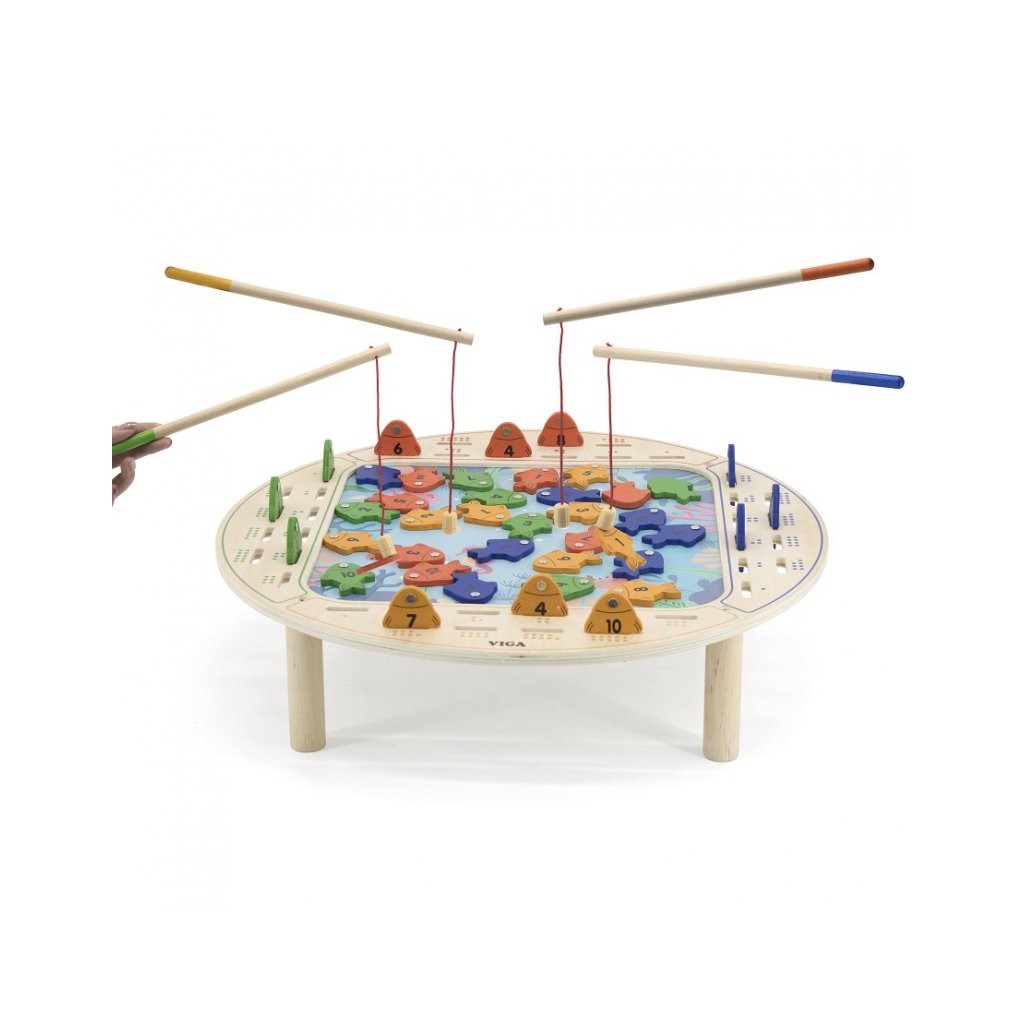 Deti rady hrajú rôzne hry a trávia čas spoločne so svojimi rovesníkmi. Od útleho veku sa učia súťažiť, ale najlepšie sa im to darí pri hre. Hru môžu hrať naraz až 4 hráči. Cieľom hry je uloviť, čo najviac rybičiek. Hračka obsahuje: drevený herný stojan, 4 rybárske prúty, hraciu kocku a 40rýb, - rybky sú v štyroch farbách a na chrbte majú napísané čísla, - deti si môžu usporiadať rybárske súťaže a tiež súťažiť v číselných hrách. Hračka rozvíja: - koordináciu rúk a očí - logické myslenie - sociálne zručnosti - motorické zručnosti Parametre: Rozmery: v. 11 x š. 45 x h. 45 cm Materiál: drevoDodatočné parametre