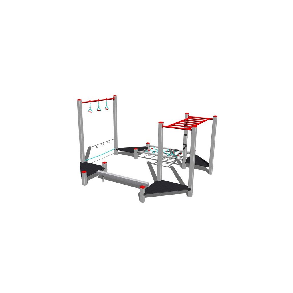 Dobrodružná stezka 104 je vhodná pro mateřské školy - herní prvek je certifikovaný i pro děti od 2 let, obce a restaurace, hotely a pod, velmi dobře podpoří pohybovou aktivitu dětí. Sestava je celokovová a odolává vandalům i povětrnosti, téměř bezúdržbové provedení. Náš tip - tato sestava přinese dětem mnoho zábavy a dobrodružství při přelézání překážek, přeskakování z jedné plošiny na druhou, přechody přes kladiny, lanové prvky, je to takový workoutový (cvičební) prvek pro naše nejmenší. Sestava se skládá z: ručkovací žebřík s přechodovým lanem v dolní části, vodorovný síťový přechod, ručkovací kruhy s přecházecím lanem v dolní části, kladina, 4x podesta. Stezka dovednosti 104 - je vyrobená z konstrukční oceli (kovový profil 100 x 100 mm) , která je proti korozi chráněna povrchovou úpravou zinkováním, čímž se docílí velmi výrazného prodloužení životnosti herního prvku a také ještě vypalovanou barvou Komaxit dle odstínu RAL. Konstrukce sestavy je přímo pevně zabetonována do terénu. Veškeré další kovové prvky jsou také upravovány zinkováním a vypalovanou barvou Komaxit dle odstínu RAL. Síť, lana, kruhy jsou vyrobené z materiálu HERKULES (16 mm lana z polypropylenu s vnitřním ocelovým jádrem). Podesty jsou z vodovzdorné překližky, která je určená pro venkovní prostředí. Veškerý spojovací materiál je pozinkovaný nebo nerezový. Výška volného pádu tohoto dětského hřiště je 1 m. Dobrodružná stezka 104 může mít jako dopadovou plochu jen udržovaný trávník a není nutné tvořit speciální dopadové plochy. Pokud není na pozemku udržovaný trávník nebo hrozí jeho vyšlapání, doporučujeme zde položit pryžové zatravňovací desky Saf nebo Grass. Dětské hřiště je určeno pro děti od 2 do 10 let, na děti od 2 do 6 let je nutný dohled dospělé osoby. Stezka dovednosti 104 je certifikovaná dle EN 1176 pro veřejná dětská hřiště.Dodatočné parametre