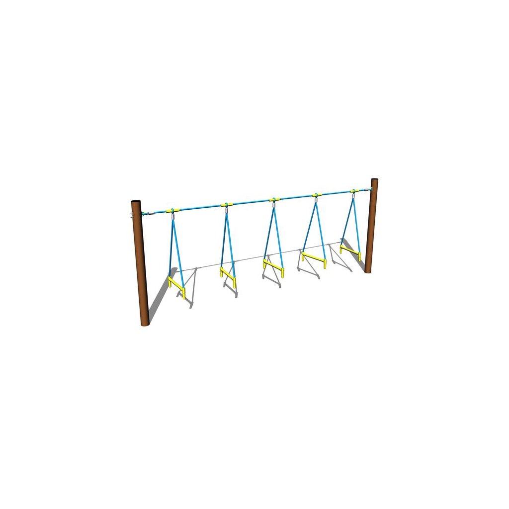 Šplhací sestava 090 - Houpací trojúhelníky je dětská šplhací herní sestava pro děti již od 2 let sestávající z pěti zavěšených lanových trojúhelníků s plastovými stupáky. Tato šplhací sestava dobře doplní veřejná dětská hřiště a zahrady mateřských a základních škol. Děti si mohou zde procvičovat šplhání, rovnováhu a především sílu a koordinaci pohybů, ale mohou se zde i houpat. Nosná konstrukce šplhací sestavy 090 - Houpací trojúhelníky je vyrobena z konstrukční oceli (průměr 89 mm), která je proti korozi chráněna povrchovou úpravou zinkováním a vypalovanou barvou KOMAXIT, čímž se docílí velmi výrazného prodloužení životnosti herního prvku. Barvu konstrukce si může zákazník volit z těchto barev - modré, červené a hnědé. Konstrukce (stojky) jsou betonovány přímo do terénu. Veškeré další kovové prvky jsou také upravovány zinkováním a vypalovanou barvou KOMAXIT. Lana a sítě jsou vyrobeny z materiálu HERKULES (16 mm lana z polypropylenu s vnitřním ocelovým jádrem) a jsou spojována plastovými spoji. Použitý spojovací materiál je pozinkovaný nebo nerezový. Dětské hřiště je určeno pro děti od 2 do 10 let, na děti od 2 do 6 let je nutný dohled dospělé osoby. Herní šplhací sestava 090 - Houpací trojúhelníky je certifikovaná dle EN 1176 pro veřejná dětská hřiště.Dodatočné parametre
