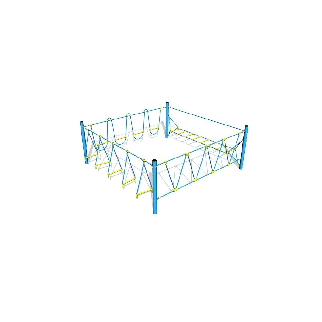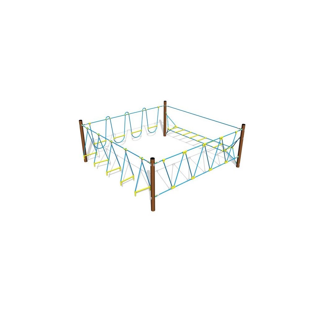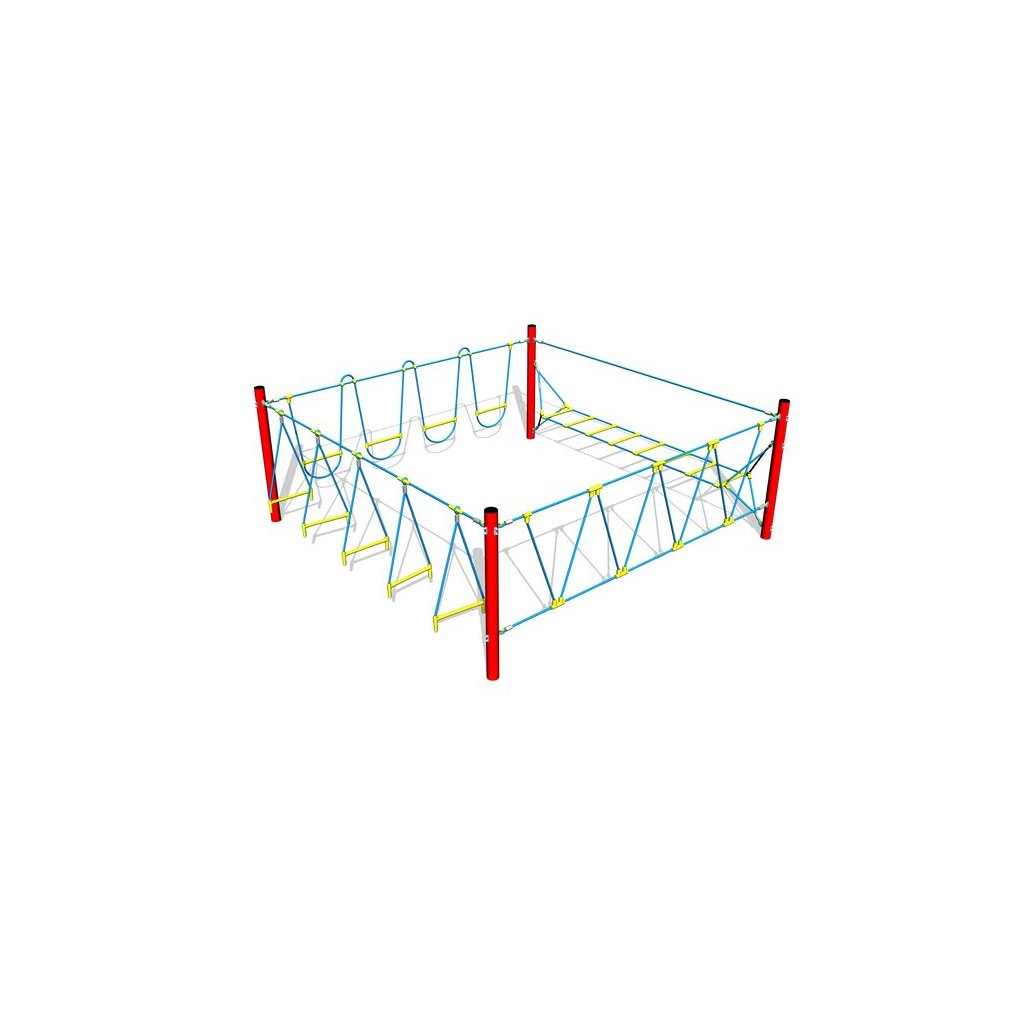 Šplhací sestava - Stezka odvahy Quadrat je dětská herní sestava uzavřeného tvaru,složená je ze čtyř polí - volně zavěšených lanových trojúhelníků v plastovým stupákem, vodorovného žebříku s bezpečnostním lanem, lanových oblouků s plastovými stupáky a kolmé sítě tvořené z cik-cak upevněných lan. Tato šplhací sestava dobře doplní veřejná dětská hřiště a zahrady mateřských a základních škol. Děti si mohou zde procvičovat šplhání, rovnováhu a především sílu a koordinaci pohybů. Na některých sítích se mohou děti i houpat. Nosná konstrukce šplhací sestavy - Stezka odvahy Quadrat je vyrobena z konstrukční oceli (průměr 89 mm), která je proti korozi chráněna povrchovou úpravou zinkováním a vypalovanou barvou KOMAXIT, čímž se docílí velmi výrazného prodloužení životnosti herního prvku. Barvu konstrukce si může zákazník volit z těchto barev - modré, červené a hnědé. Konstrukce šplhací sestavy Stezka odvahy Quadrat jsou betonovány přímo do terénu. Veškeré další kovové prvky jsou také upravovány zinkováním a vypalovanou barvou KOMAXIT. Lana a sítě jsou vyrobeny z materiálu HERKULES (16 mm lana z polypropylenu s vnitřním ocelovým jádrem) a jsou spojována plastovými spoji. Použitý spojovací materiál je pozinkovaný nebo nerezový. Dětské hřiště je určeno pro děti od 2 do 10 let, na děti od 2 do 6 let je nutný dohled dospělé osoby. Herní šplhací sestava - Stezka odvahy Quadrat je certifikovaná dle EN 1176 pro veřejná dětská hřiště.Dodatočné parametre