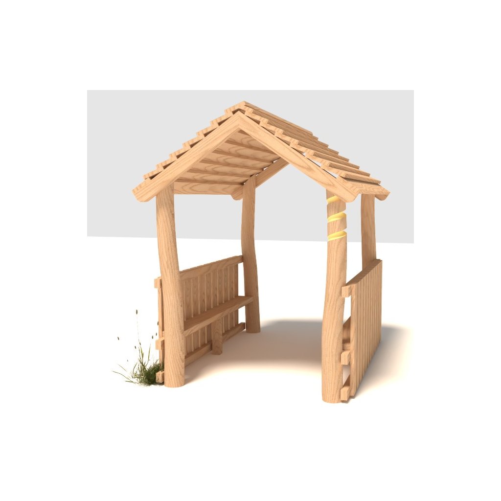 Masivní, velký a odolný domek (altánek) z akátu Fortna zaujme všechny děti, najdou zde útočiště pro hru i úkryt před nepřízní počasí.Je ideálním místem k odpočinku při hře dětí, a dospělí mají přitom přehled aj si hrají. Tento Domeček (altánek) Fortna je vhodný především do mateřských škol, do obcí i na městská veřejná dětská hřiště. Konstrukce domku je tvořena z odolného akátového (dubového) dřeva, které je natřené lazurou (odstín dle přání zákazníka, případně může dřevo zůstat bez ošetření).Stavba z tvrdého dřeva má dlouhou životnost bez větších nároků na údržbu. Domek Fortna je kotvený zabetonováním stojek přímo do terénu. Má masivní střechu a je větších rozměrů, může si zde hrát více dětí najednou, interiét je doplněn i o dvě lavice na sezení po bocích domečku. Výška pádu Domečku Fortna je do 0,6 m a proto nemusí mít dopadové plochy tlumící pád, stačí zde udržovaný trávník. V případě, pokud se zákazník obává vyšlapání trávníku v okolí domečku, doporučujeme zde položit pryžové zatravňovací desky Gras nebo Saf. Najdete je v souvisejícím zboží. Toto zařízení na dětská hřiště je určeno pro děti od 3 do 14 let, na děti od 3 do 6 let je nutný dohled dospělé osoby. Zařízení dětského hřiště Domeček Fortna je certifikovaný dle EN 1176 pro veřejná dětská hřiště.Dodatočné parametre