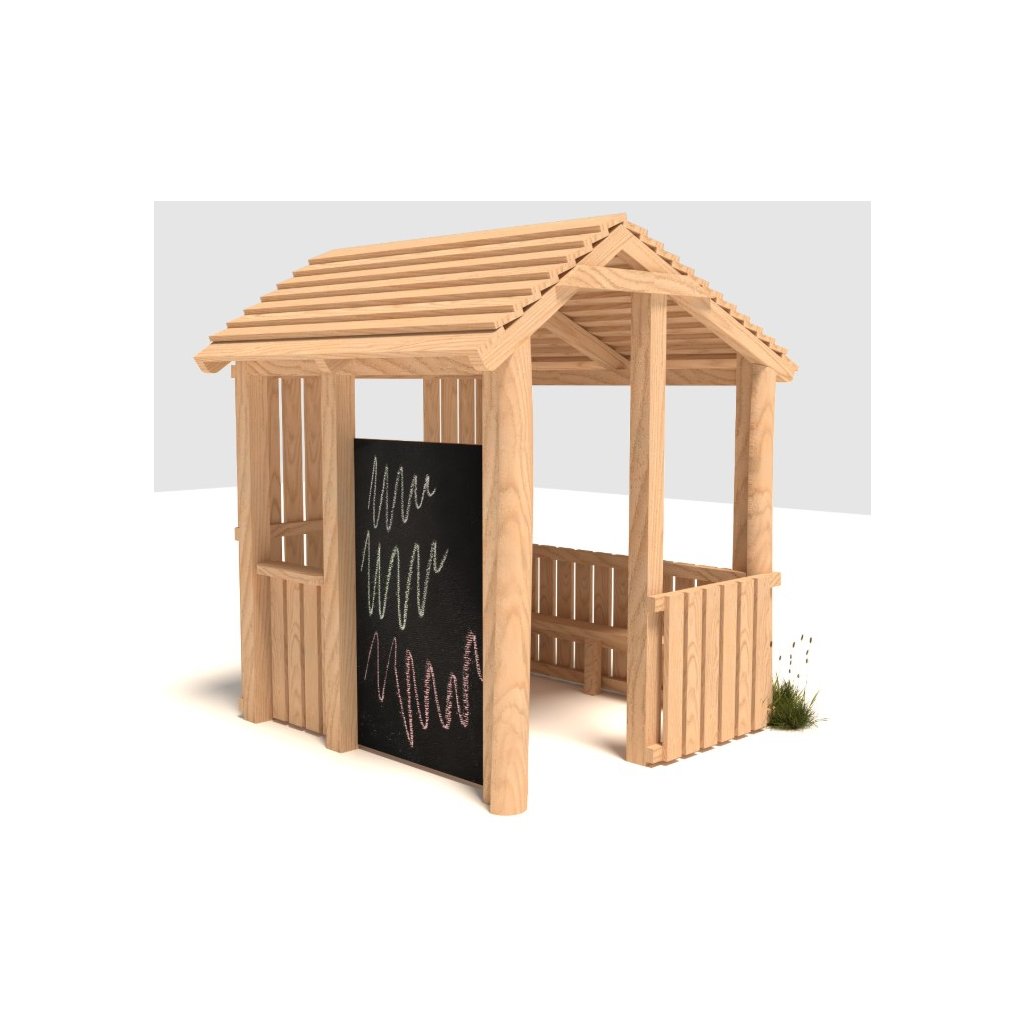Masivní, velký a odolný domek (altánek) z akátu Kim zaujme všechny děti, najdou zde útočiště pro hru i úkryt před nepřízní počasí. Mohou si zde hrát na školu, malovat a nebo jen tak odpočívat ve stínu. Tento Domeček Kim je vhodný především do mateřských škol, do obcí i na městská veřejná dětská hřiště. Konstrukce domku je tvořena z odolného akátového (dubového) dřeva, které je natřené lazurou (odstín dle přání zákazníka, případně může dřevo zůstat bez ošetření). Domeček z tvrdého dřeva má dlouhou životnost bez větších nároků na údržbu. Domek Kim je kotvený zabetonováním stojek do terénu. Má masivní střechu a je větších rozměrů, může si zde hrát více dětí najednou, interiét je doplněn i o lavice na sezení po bocích domečku. Velká tabule na boku domečku bude jistě lákat děti k malování a budou zde rozvíjet své fantazie a kreativitu. Výška pádu Domečku Kim je do 0,6 m a proto nemusí mít dopadové plochy tlumící pád, stačí zde udržovaný trávník. V případě, pokud se zákazník obává vyšlapání trávníku v okolí domečku, doporučujeme zde položit pryžové zatravňovací desky Gras nebo Saf. Najdete je v souvisejícím zboží. Toto zařízení na dětská hřiště je určeno pro děti od 3 do 14 let, na děti od 3 do 6 let je nutný dohled dospělé osoby. Zařízení dětského hřiště Domeček Kim je certifikovaný dle EN 1176 pro veřejná dětská hřiště.Dodatočné parametre