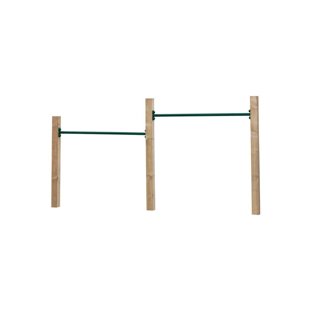 Hrazda Tumble Bar Double je robustný vonkajší gymnastický prvok navrhnutý pre aktívny pohyb, spoločnú hru a rozvoj detskej motoriky. Vďaka dvom paralelným hrazdám umožňuje viacerým deťom súčasne cvičiť, hojdať sa, visieť. Konštrukcia je tvorená masívnymi štvorcovými drevenými stĺpmi z impregnovaného FSC certifikovaného dreva, ktoré je odolné voči poveternostným vplyvom, hnilobe a škodcom. Drevo je dodávané vopred upravené a nevyžaduje ďalšie ošetrenie pred inštaláciou. Kovové hrazdy sú pevne uchytené medzi stojkami a zaisťujú vysokú odolnosť pri dynamickom zaťažení. Konštrukcia podporuje rozvoj sily hornej časti tela, koordinácie, rovnováhy i priestorového vnímania. Pri používaní sa odporúča bezpečné ukotvenie do zeme a inštalácia na dostatočne mäkký dopadový povrch.Nutné zabetónovať, kotvy nie sú súčasťou dodávky! Hrazda je ošetrená práškovou farbou, priemer trubky 34 mm, hrúbka steny 2 mm. Rozmer: 280 × 9 × 240 cmDodatočné parametre