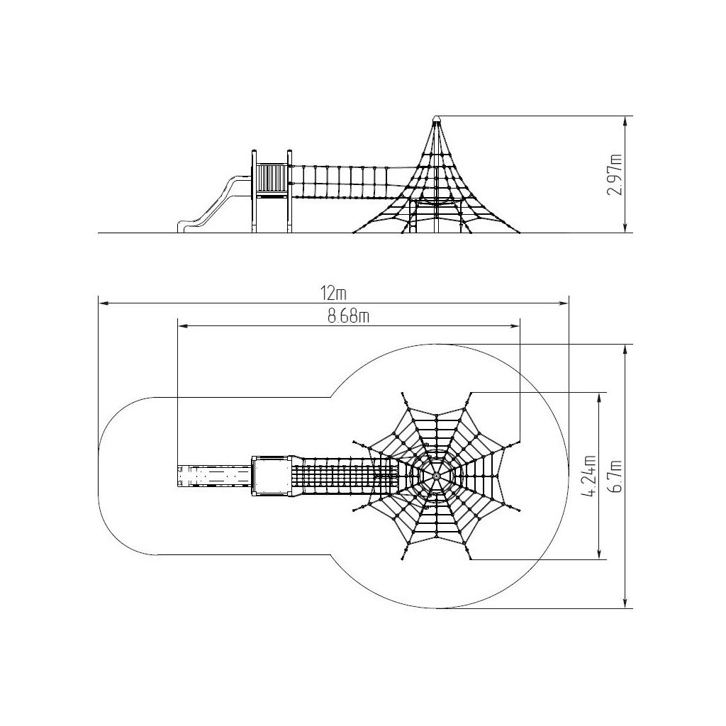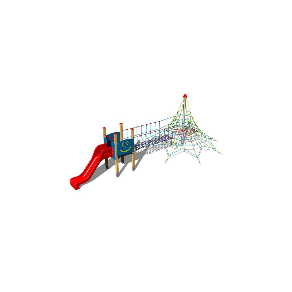 Lanová šplhací věž se skluzavkou 831D umožní dětem šplhání po lanech, lezení, dobrodružný přechod mostu, klouzání po skluzavce a mnoho dalších aktivit. Lanová šplhací věž se skluzavkou 831D má ocelový sloup o průměru 114 mm, šplhací síť je vyrobena z lan Herkules ((16 mm lana z polypropylenu s vnitřním ocelovým jádrem), k síti je připevněno také vnitřní lanové patro, napínací zámky jsou nerezové. Konstrukce věže se skluzavkou je z je vyrobená z kvalitního dřeva, z lepených hranolů 100 x 100 mm. Toto řešení zajišťuje maximální možnou ochranu proti vzniku prasklin, které jsou běžné u výrobků z mimostředového dřeva. Povrchová úprava těchto hranolů je impregnace a třívrstvá aplikace vrchního lazurovacího laku, splňujícího podmínky normy EN 71/3 (bezpečné pro dětské hračky). Tyto hranoly jsou do terénu ukotveny pomocí ocelových patek, které jsou chráněny proti korozi žárovým zinkováním a betonovány do terénu. Kotvy jsou připevněny k hernímu prvku pomocí šroubů a jejich konstrukce zaručuje, že dřevěné prvky nebudou v přímém kontaktu se zemí. Skluzavka je vyrobena z odolného a trvanlivého třívrstvého laminátu. Čelo skluzavky je z vysoce kvalitního plastu HDPE (vysokotlaký, celoprobarvený polyetylen, který se vyznačuje vysokou barevnou stálostí, odolností proti UV záření a hlavně bezpečností, protože je nelámavý a nehrozí tak žádné nebezpečí zranění dětí ostrými úlomky). Podesta věže je vyrobena z vodovzdorné překližky. Šplhací herní sestava se skluzavkou 831D je velmi pěkně vypracovaná, dětem nabídne mnoho příležitostí ke šplhání, lezení, klouzání a bude vhodně rozvíjet jejich motorické schopnosti. Sestava je díky své výšce vhodná pro děti od 3 do 15 let, které rádi lezou a posilují. Tuto herní sestavu doporučujeme na dětská hřiště, do zahrad mateřských škol, ale i k restauracím, hotelům, dětským centrům, a pod. Lanová šplhací věž se skluzavkou 831 se skládá z: 1× ocelový sloup síťová plocha z lan Herkules vnitřní lanové patro lanový žebřík šplhací lano masivní lanový most věž bez střechy laminátová skluzavka Lanová šplhací věž se skluzavkou 831D má pádovou výšku 1 m a proto stačí jako dopadová plocha jen udržovaný trávník. a není nutné tvořit speciální dopadové plochy. Pokud není na pozemku kvalitní trávník nebo hrozí jeho vyšlapání, doporučujeme zde položit pryžové zatravňovací desky Grass nebo Saf z naší nabídky. Herní prvek je určený pro děti ve věku od 3 do 15 let, na děti od 3 do 6 let je nutný dohled dospělé osoby. Lanová šplhací věž se skluzavkou 831D je certifikovaná dle EN 1176 pro veřejná dětská hřiště.Dodatočné parametre