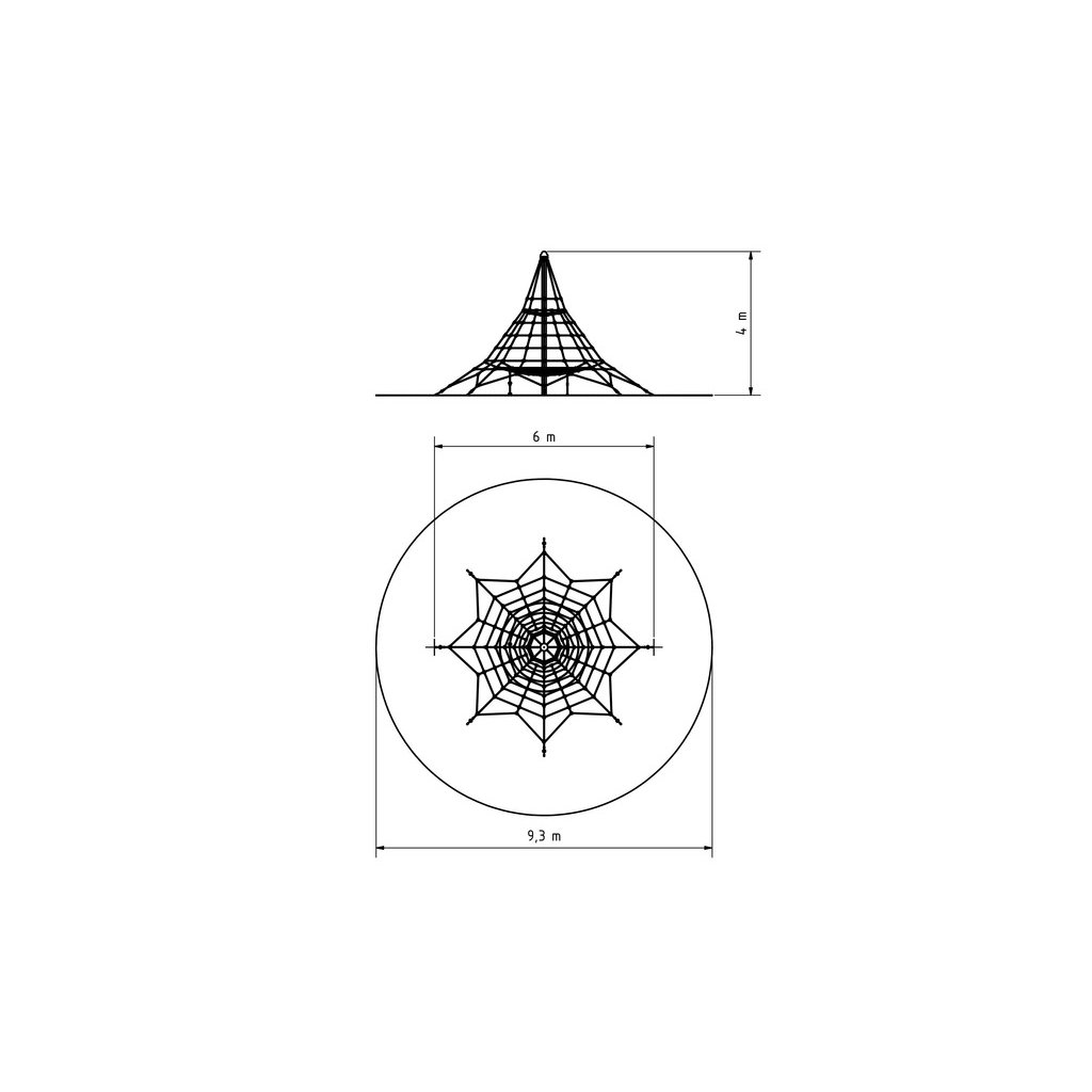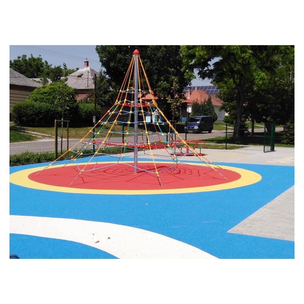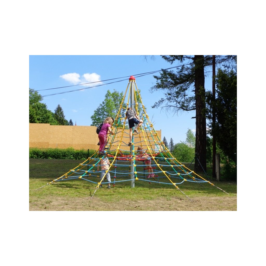 Lanová šplhací věž 4 m - umožní dětem šplhání po lanech a hru na veřejných dětských hřištích. Lanová šplhací věž 4m má ocelový sloup o průměru 114 mm, šplhací síť je vyrobena z lan Herkules (16 mm lana z polypropylenu s vnitřním ocelovým jádrem), k síti je připevněno ve výšce 1 m také vnitřní lanové patro se šplhacím žebříkem a lanem s plastovými úchyty, nad ním je ještě jedno vodorovné síťové patro, kde mohou děti také odpočívat a hrát si. Napínací zámky (pomocí kterých se síť na pyramidě vypíná) jsou nerezové. Šplhací herní sestava Lanová věž 4 m je velmi pěkně vypracovaná, dětem nabídne mnoho příležitostí ke šplhání, lezení a bude vhodně rozvíjet jejich motorické schopnosti. Sestava je díky své výšce vhodná pro děti od 3 do 15 let, které rádi lezou a posilují. Tuto herní sestavu doporučujeme na dětská hřiště, do zahrad mateřských škol, ale i k restauracím, hotelům, dětským centrům, a pod. Konstrukce herního prvku je vyrobena z odolné oceli, která je ošetřena zinkováním proti korozi. Všechny sítě používané na tyto herní sestavy jsou vyrobené z lan s ocelovou výztuží (typu Herkules). Tato lana jsou velmi odolná vandalům a mají také dlouhou životnost. Tato herní sestava velmi dobře odolává zátěži i vandalům. Lanová šplhací věž 4 m se skládá z: 1× ocelový sloup síťová plocha z lan Herkules 2 x vnitřní lanové patro lanový žebřík šplhací lano s plastovými úchyty spojovací materiál Lanová šplhací věž 4m má pádovou výšku 1 m a proto stačí jako dopadová plocha jen udržovaný trávník. a není nutné tvořit speciální dopadové plochy. Pokud není na pozemku kvalitní trávník nebo hrozí jeho vyšlapání, doporučujeme zde položit pryžové zatravňovací desky Grass nebo Saf z naší nabídky Lanová šplhací věž 4 m je certifikovaná dle EN 1176 pro veřejná dětská hřiště.Dodatočné parametre