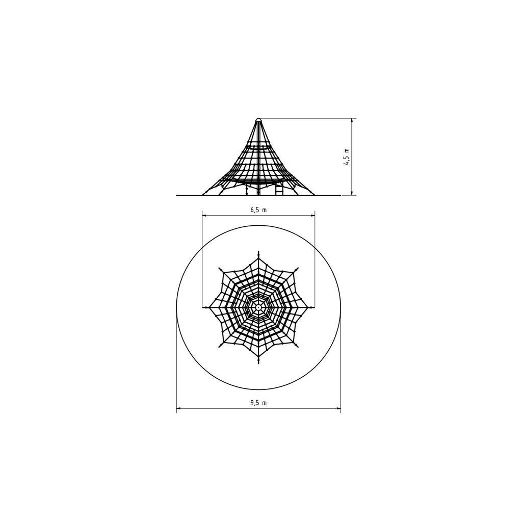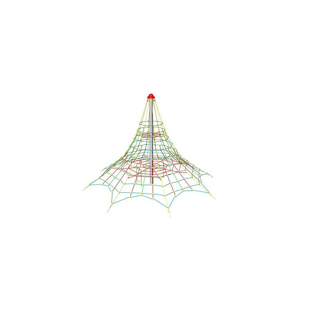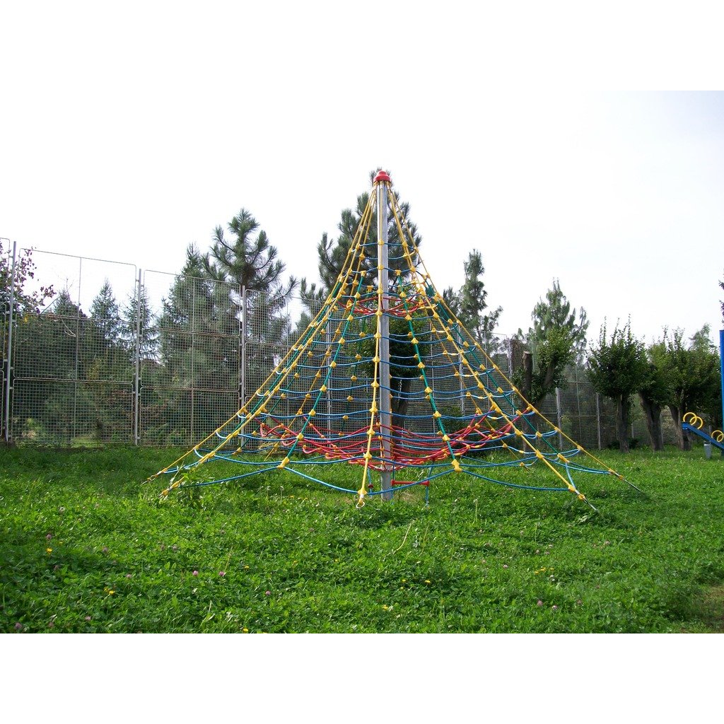 Lanová šplhací věž 4,5 m - umožní dětem šplhání po lanech a hru na veřejných dětských hřištích. Lanová šplhací věž 4,5 m má ocelový sloup o průměru 159 mm, šplhací síť je vyrobena z lan Herkules (16 mm lana z polypropylenu s vnitřním ocelovým jádrem), k síti je připevněno ve výšce cca. 1 m také vnitřní lanové patro se šplhacím žebříkem a lanem s plastovými úchyty, nad ním je ještě jedno vodorovné síťové patro, kde mohou děti také odpočívat a hrát si. Napínací zámky (pomocí kterých se síť na pyramidě vypíná) jsou nerezové. Šplhací herní sestava Lanová věž 4,5 m je velmi pěkně vypracovaná, dětem nabídne mnoho příležitostí ke šplhání, lezení a bude vhodně rozvíjet jejich motorické schopnosti. Sestava je díky své výšce vhodná pro děti od 3 do 15 let, které rádi lezou a posilují. Tuto herní sestavu doporučujeme na dětská hřiště, do zahrad mateřských škol, ale i k restauracím, hotelům, dětským centrům, a pod. Konstrukce herního prvku je vyrobena z odolné oceli, která je ošetřena zinkováním proti korozi. Všechny sítě používané na tyto herní sestavy jsou vyrobené z lan s ocelovou výztuží (typu Herkules). Tato lana jsou velmi odolná vandalům a mají také dlouhou životnost. Tato herní sestava velmi dobře odolává zátěži při hře většího počtu dětí a také vandalům. Lanová šplhací věž 4,5 m se skládá z: 1× ocelový sloup síťová plocha z lan Herkules 2 x vnitřní lanové patro lanový žebřík šplhací lano s plastovými úchyty spojovací materiál Lanová šplhací věž 4,5 m má pádovou výšku 1 m a proto stačí jako dopadová plocha jen udržovaný trávník. a není nutné tvořit speciální dopadové plochy. Pokud není na pozemku kvalitní trávník nebo hrozí jeho vyšlapání, doporučujeme zde položit pryžové zatravňovací desky Grass nebo Saf z naší nabídky Lanová šplhací věž 4,5 m je certifikovaná dle EN 1176 pro veřejná dětská hřiště.Dodatočné parametre