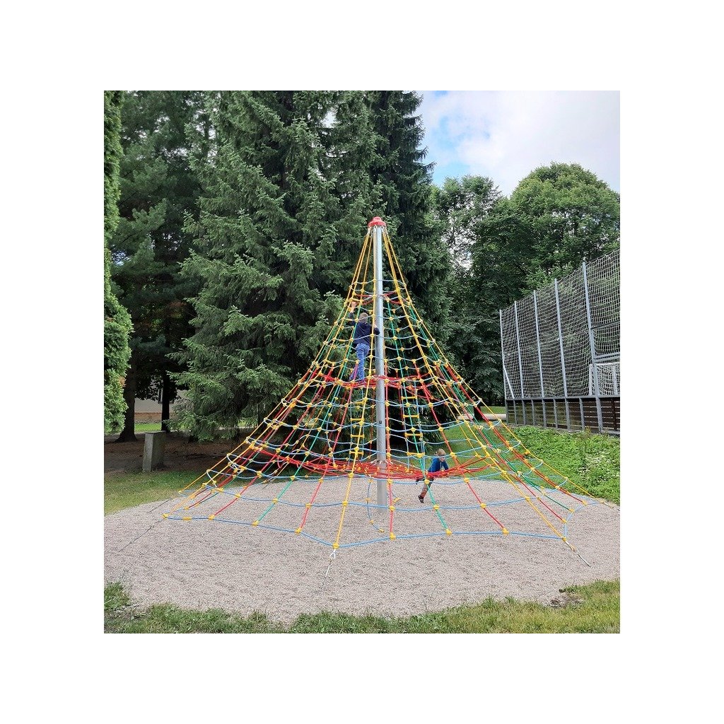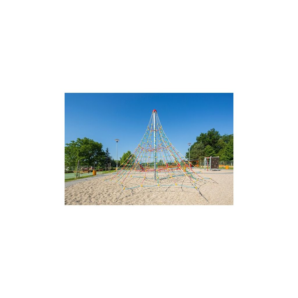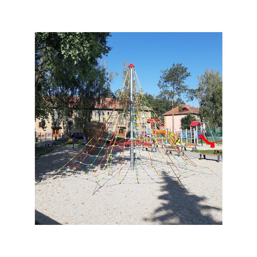 Lanová šplhací věž 5,5 m - umožní dětem šplhání po lanech a hru na veřejných dětských hřištích. Lanová šplhací věž 5,5 m (v.p. 1,5 m) má ocelový sloup o průměru 159 mm, šplhací síť je vyrobena z lan Herkules (16 mm lana z polypropylenu s vnitřním ocelovým jádrem), k síti je připevněno 2 x vnitřní lanové patro, spodní se šplhacím žebříkem a lanem s plastovými úchyty, zde mohou děti i odpočívat a nebo si hrát. Napínací zámky (pomocí kterých se síť na pyramidě vypíná) jsou nerezové. Šplhací herní sestava Lanová věž 5,5 m (v.p. 1,5 m) je opravdu velká a dobře navržená šplhací pyramida, dětem nabídne mnoho příležitostí ke šplhání, lezení a bude vhodně rozvíjet jejich motorické schopnosti. Sestava je díky své výšce vhodná pro děti od 3 do 15 let, které rádi lezou a posilují. Tuto herní sestavu doporučujeme na dětská hřiště, do zahrad mateřských škol, ale i k restauracím, hotelům, dětským centrům, a pod. Konstrukce herního prvku je vyrobena z odolné oceli, která je ošetřena zinkováním proti korozi. Všechny sítě používané na tyto herní sestavy jsou vyrobené z lan s ocelovou výztuží (typu Herkules). Tato lana jsou velmi odolná vandalům a mají také dlouhou životnost. Tato herní sestava velmi dobře odolává zátěži při hře většího počtu dětí a také vandalům. Lanová šplhací věž 5,5 m se skládá z: 1× ocelový sloup síťová plocha z lan Herkules 2 x vnitřní lanové patro 1 x lanový žebřík 1 x šplhací lano s plastovými úchyty spojovací materiál Lanová šplhací věž 5,5 m má pádovou výšku 1,5 m. Proto je nezbytně nutné vytvořit v dopadové oblasti lanové věže tlumící povrch pro případ pádu (např. 30cm silná vrstva písku, kačírku nebo drcené kůry). Náš tip - nejvýhodnější materiál pro vytvoření dopadové plochy tlumící pád z výšky až 3 m jsou pryžové zatravňovací desky Grass a Saf. Jejich instalace je jednoduchá pokládka na terén bez nutnosti zemních prací. Najdete je v souvisejícím zboží. Výhody – nevýhody jednotlivých podkladů: Dopadové pryžové dlaždice •+zcela bezpečný, rovný , ohraničený povrch •+plní tlumící funkci při dopadu •+estetický vzhled •+nenáročné na údržbu • - nutnost větší stavební přípravy (ideálně podkladový beton) Kačírek ( doporučujeme frakci 4/8) •+plní drenážní funkci •+plní tlumící funkci při dopadu dětí •-děti roznáší kamínky do okolního trávníku Písek •-Zadržuje vodu •-Roznáší se po zahradě •-Dochází k mechanické odírání částí herní sestavy •-Láká domácí zvířata ( především kočičky) Mulčovací kůra •-Zadržuje vodu •-Vytváří vlhkost u země a tvoří se plísně •-Sesychá – nutnost doplňovat. Lanová šplhací věž 5,5 (v.p.1,5 m) je určena pro děti od 3 do 15 let, na děti od 3 do 6 let je nutný dohled dospělé osoby. Lanová šplhací věž 5,5 m (v.p. 1,5 m) je certifikovaná dle EN 1176 pro veřejná dětská hřiště.Dodatočné parametre