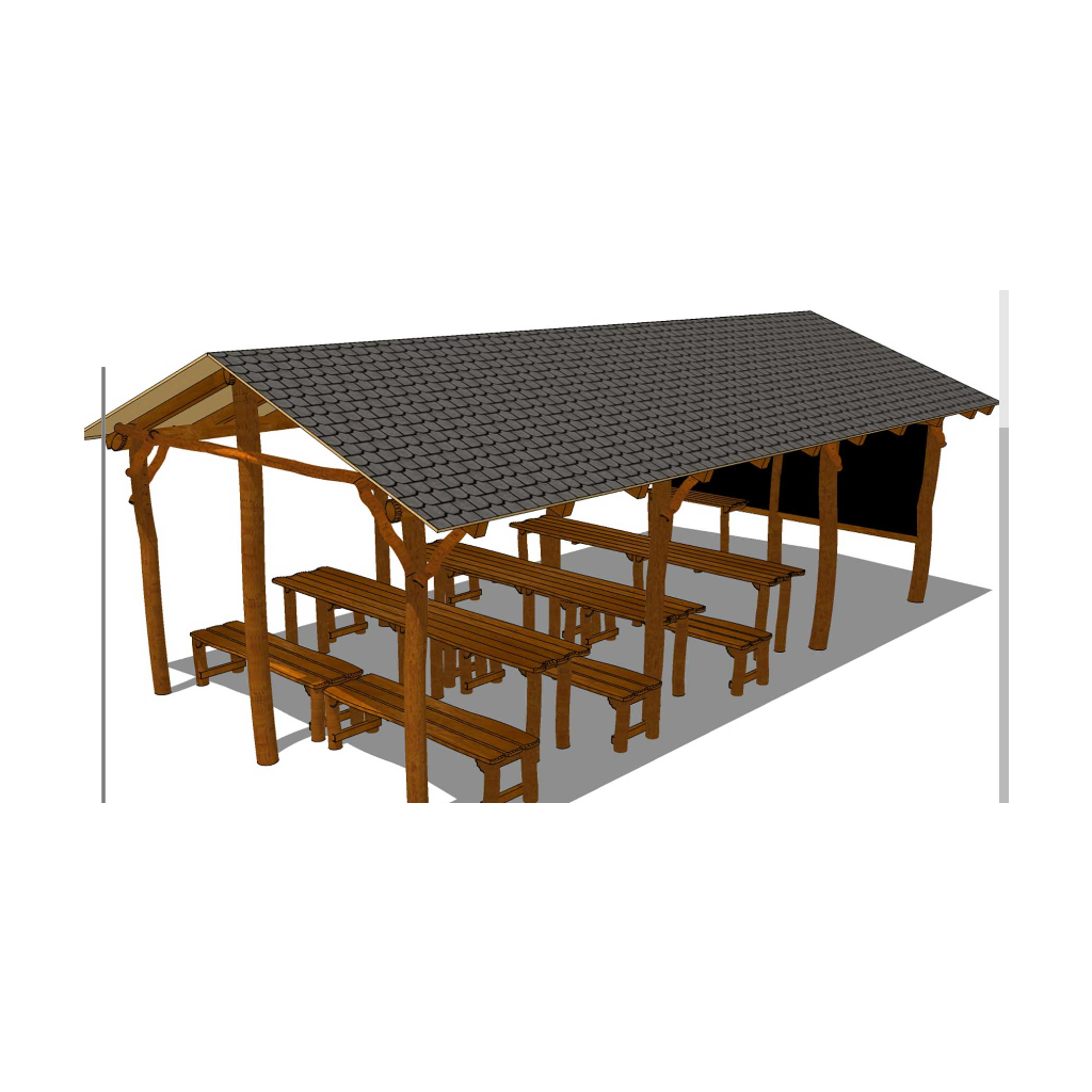 Venkovní učebna vhodně doplní veřejné i soukromé odpočinkové prostory. Je vhodná do zahrad mateřských a základních škol ale i na veřejná dětská hřiště do obcí a měst. Učebna je velká a osazená lavicemi, stoly a tabulí pro malování křídou, jistě ji lze využít ve školách jako venkovní učeb Venkovní učebna je vyrobená z odolného akátového (dubového) dřeva, které je natřené lazurou a má dlouhou životnost. Má dřevěnou konstrukci z kulatin, na které je upevněna střecha z prken, která je pokrytá šindelem. Součástí dodávky jsou také masivní lavice a stoly, které však nejsou nujak kotvené do terénu (dle konkrétního podkladu vám rádi doporučíme vhodné kotvení). V přední části učebny je umístěná velká tabule na malování křídou, tato vhodně doplňuje venkovní učebnu. Konstrukce učebny je pevně zabetonovaná do terénu a zaručí dostatečnou stabilitu celé konstrukce i po zatížení např. sněhem, větrem , apod.. Tento mobiliář umístěte dostatečně daleko od ostatních herních prvků, dodržujte potřebný volný prostor dle EN 1176. Teréní úpravy a případná dlažba pod učebnou nejsou součástí dodávky! Pokud budete chtít zabránit vyšlapání trávy pod stavbou, doporučujeme zde položit zatravňovací desky Saf nebo Grass z naší nabídky. Najdete v souvisejícím zboží. Tento mobilář je vyrobený v souladu s normou EN 1176.Dodatočné parametre