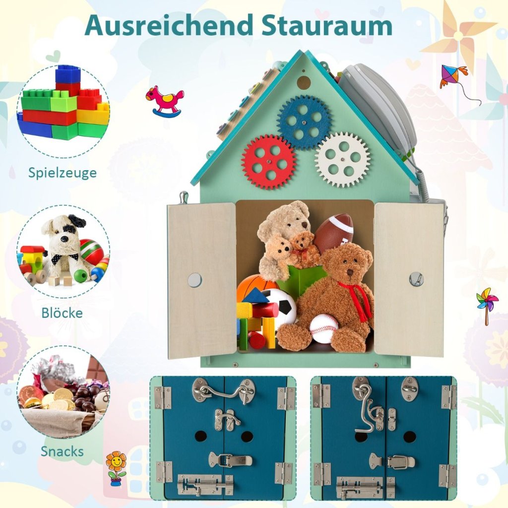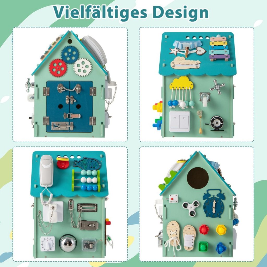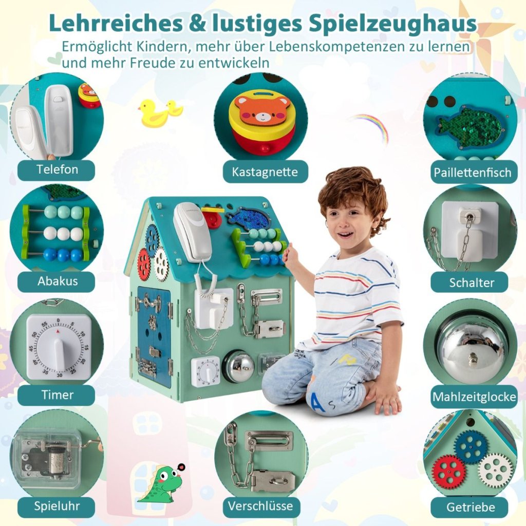 Multifunkčný domček má mnoho častí pre extra zábavu. Táto vzdelávacia hračka je vybavená mnohými hracími plochami, ako je Velcro, spínač, valček, hodiny a západka, kde sa deti môžu naučiť viac zručností. Táto hračka v tvare domčeka je vybavená vo vnútri a má dostatok úložného priestoru pre detské hračky. Deti si tak vypestujú dobrý návyk ukladať a triediť svoje veci. Domček je vyrobený z odolných panelov a vysoko kvalitného kovového materiálu, čo zaisťuje dlhú životnosť. Zaoblené rohy navyše zabraňujú náhodnému nárazu. Pomáha trénovať jemnú motoriku detí a zlepšovať ich každodenné zručnosti Okrúhle rohy bez otrepov chránia citlivú detskú pokožku Farba: Modrá Materiál: MDF + kov Celkové rozmery: 33 x 33 x 45 cm (D x Š x V) Vnútorný úložný priestor: 28 x 27 x 43 cm (D x Š x V) Čistá hmotnosť: 4 kg Obsah balenia: 1 x domček na hranie 1 x návodDodatočné parametre