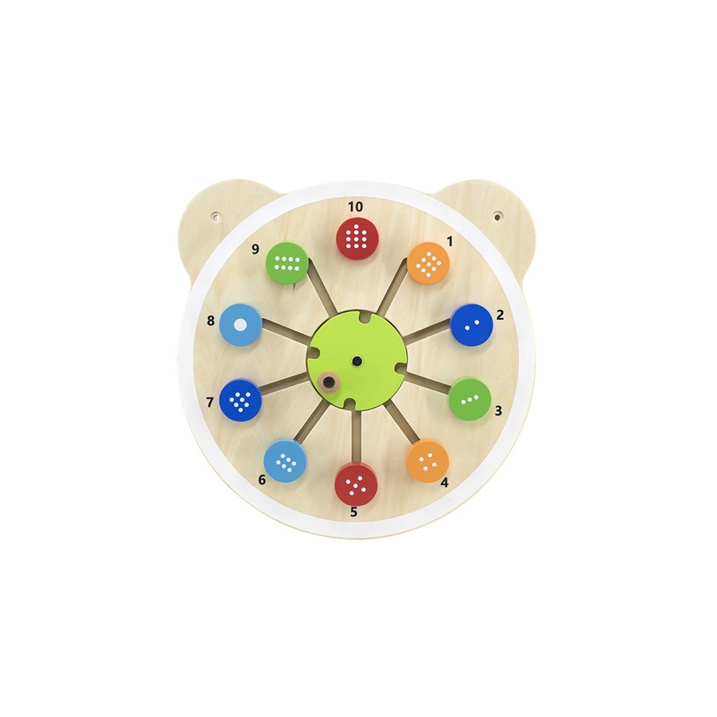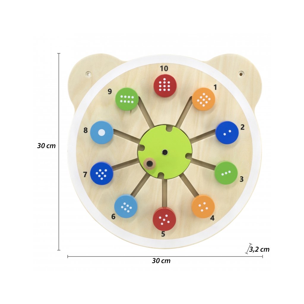 Jedna zo série drevených dosiek s roztomilou hlavou medvedíka. Doska s okrúhlymi blokmi so správnym počtom bodiek, ktoré zodpovedajú príslušnému číslu na doske. Výrobok je ideálny na použitie doma a vo vzdelávacích a predškolských zariadeniach. Zaujímavý design tvaru tabule určite upúta pozornosť každého batoľaťa. Celá súprava je vyrobená z lakovaného dreva a natretá netoxickými farbami v žiarivých farbách, ktoré uspokoja každého používateľa a poskytnú mu veľa zábavy. Výrobok je určený pre deti od 18 mesiacov. V našej ponuke nájdete celú sériu hlavičiek s medvedíkmi. Hra pozostáva z presúvania okrúhlych kociek tak, aby sa príslušný počet bodiek na kocke zhodoval s príslušným číslom na hracej ploche. Všetko je vyrobené z lakovaného dreva a natreté netoxickými farbami v žiarivých farbách. Rozmery: š. 30 x v. 30 x hl. 3,2 cm Materiál: drevoDodatočné parametre