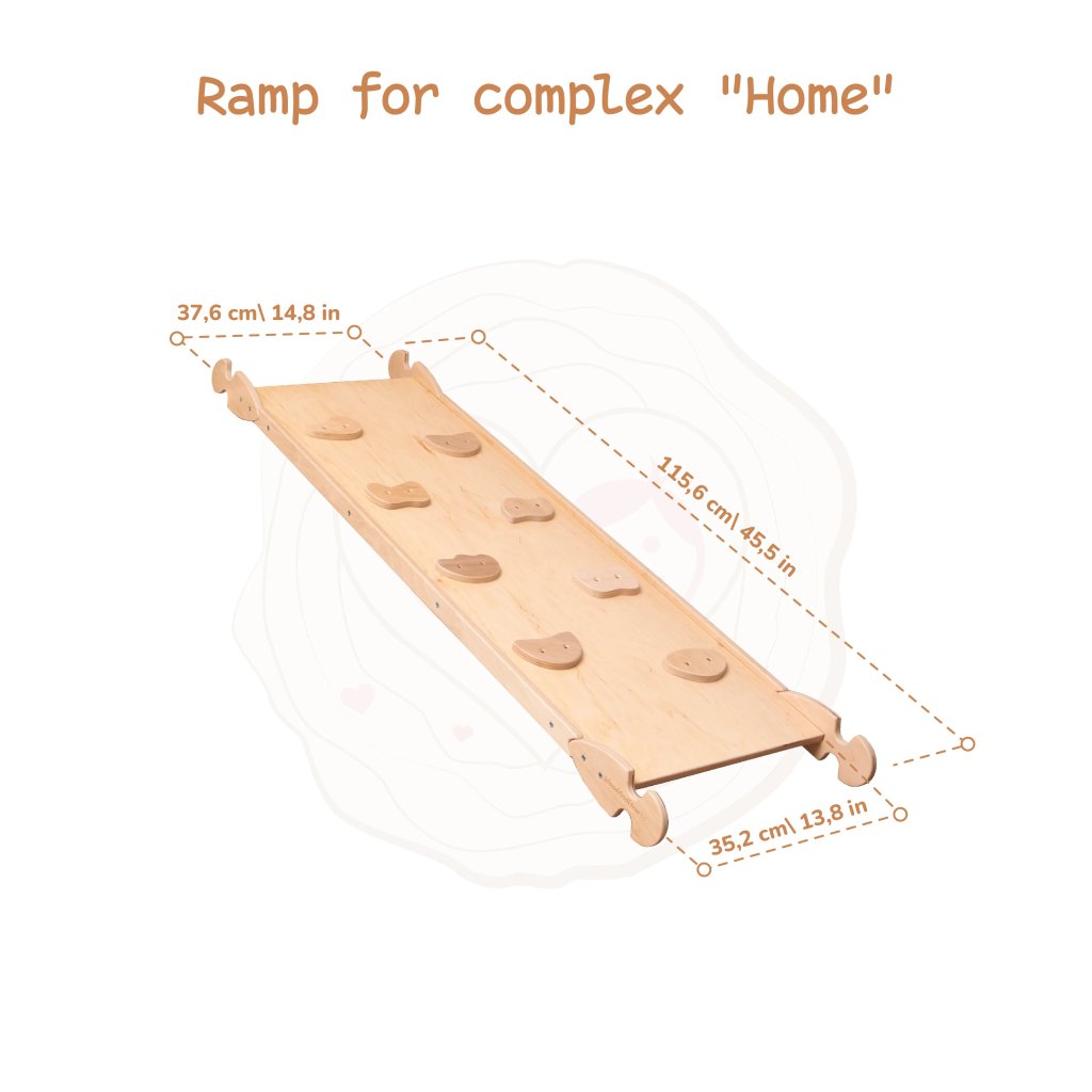 Montessori domček na hranie Home so šmykľavkou, rampou, hojdacím diskom, gymnastickými kruhmi, lanom s drevenými schodíkmi v farebném designu je všestranné interiérové ihrisko určené na zapojenie detskej motoriky, kontroly rovnováhy, koordinácie pohybu a nepoznávacej predstavivosti do hry. Vďaka svojej prívetivej štruktúre poskytuje množstvo príležitostí na lezenie, šplhanie a zlepšovanie fyzickej kondície, a to vďaka herným prvkom, ktoré domček na hranie Home obsahuje. Deti si domček Montessori Home okamžite zamilujú, je to nekonečné lezenie, plazenie, hojdanie sa po celom domčeku, navyše domček má aj obojstrannú lezeckú stenu s drevenými lezeckými bodmi, ktoré keď sa otočia, môžu sa používať, dokonca aj ako šmykľavka, ktorú bezpečne pripevníte k domčeku. Obojstranná rampa sa dá použiť aj vo vnútri domčeka ako stolík, kde si deti môžu maľovať a kreatívne tvoriť svoje umelecké diela. Deti môžu na domček vyliezť z troch strán, jedna strana je tvorená drevenými priečkami s pomocnou priečkou privarenou k hornej časti strechy, ako komín domčeka, ktorý slúži na ľahšie preliezanie strechy. Druhá strana domčeka má kombináciu lanovej steny s priečkami na lezenie a plazenie a cez drevené priečky pokračujú na vrchol striešky a posledná strana domčeka má drevené okno, cez ktoré môžu preliezať, a okno je upevnené prírodnými lanami, cez ktoré môžu tiež preliezať. V domčeku môžete zavesiť hojdací disk, lano s lezeckými schodíkmi a gymnastické drevené kruhy, ktoré môžete ľubovoľne meniť podľa preferencií detí. Pri hojdaní zároveň nezabudnite na mäkčený matrac, ktorý je tiež súčasťou balenia týchto doplnkov Home. Domček môžete doplniť hojdačkou ....a ďalšie prvky nájdete v sekcii súvisiaci tovar a domček môžete vylepšiť podľa fyzických potrieb vašich detí. Domček, je vyrobený z prvotriedneho masívneho bukového dreva, známeho svojou pevnosťou a pružnosťou, uprednostňuje odolnosť a šetrnosť k životnému prostrediu. Použitie vysokokvalitného ekologického laku na vodnej báze zaručuje bezpečnú a príjemnú hru a prirodzenú farbu dreva s pastelovými doplnkami alebo kombináciu bielej a prírodného dreva. Vnútorné ihrisko Montessori s maximálnou nosnosťou 60 kg ponúka deťom bezpečné prostredie na skúmanie a rozvoj ich fyzických schopností. Parametre: Celková výška: 142 cm Celková šírka: 109,5 cm Hĺbka domčeka na hranie: 94,4 cm, s obojstrannou rampou: 210 cm Nosnosť: 60 kg Domček obsahuje: Obojstranná rampa (šmykľavka, lezecká stena) hojdací disk gymnastické kruhy lano so šplhacími schodíkmi matraceDodatočné parametre
