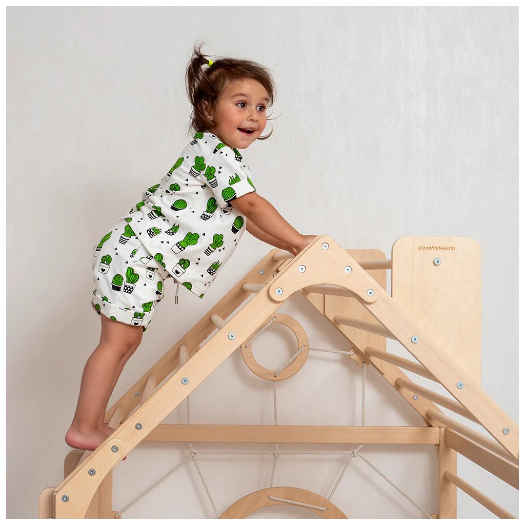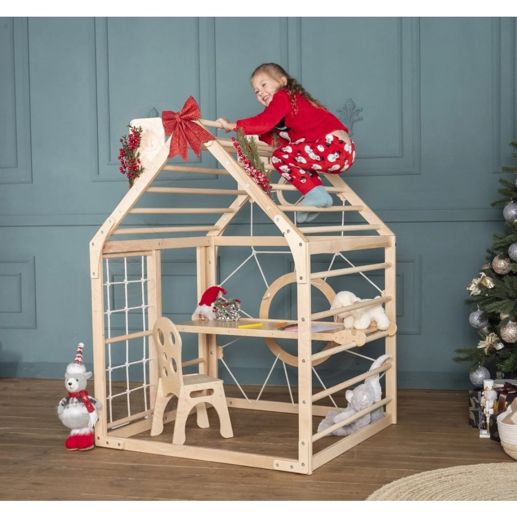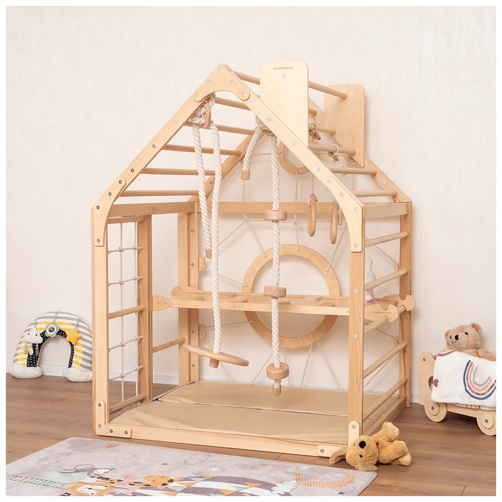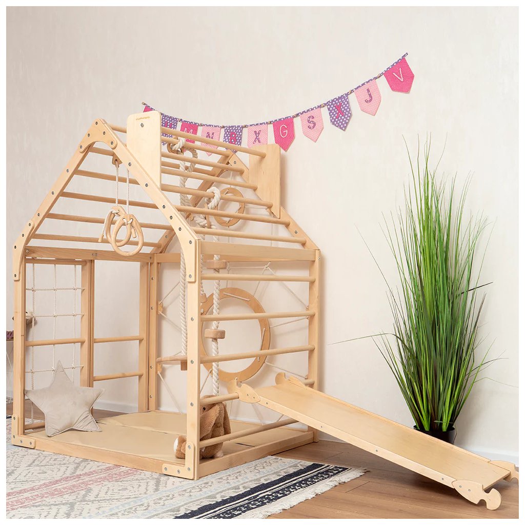 Montessori domček na hranie Home so šmykľavkou, rampou, hojdacím diskom, gymnastickými kruhmi, lanom s drevenými schodíkmi v prírodnom dizajne je všestranné interiérové ihrisko určené na zapojenie detskej motoriky, kontroly rovnováhy, koordinácie pohybu a nepoznávacej predstavivosti do hry. Vďaka svojej prívetivej štruktúre poskytuje množstvo príležitostí na lezenie, šplhanie a zlepšovanie fyzickej kondície, a to vďaka herným prvkom, ktoré domček na hranie Home obsahuje. Deti si domček Montessori Home okamžite zamilujú, je to nekonečné lezenie, plazenie, hojdanie sa po celom domčeku, navyše domček má aj obojstrannú lezeckú stenu s drevenými lezeckými bodmi, ktoré keď sa otočia, môžu sa používať, dokonca aj ako šmykľavka, ktorú bezpečne pripevníte k domčeku. Obojstranná rampa sa dá použiť aj vo vnútri domčeka ako stolík, kde si deti môžu maľovať a kreatívne tvoriť svoje umelecké diela. Deti môžu na domček vyliezť z troch strán, jedna strana je tvorená drevenými priečkami s pomocnou priečkou privarenou k hornej časti strechy, ako komín domčeka, ktorý slúži na ľahšie preliezanie strechy. Druhá strana domčeka má kombináciu lanovej steny s priečkami na lezenie a plazenie a cez drevené priečky pokračujú na vrchol striešky a posledná strana domčeka má drevené okno, cez ktoré môžu preliezať, a okno je upevnené prírodnými lanami, cez ktoré môžu tiež preliezať. V domčeku môžete zavesiť hojdací disk, lano s lezeckými schodíkmi a gymnastické drevené kruhy, ktoré môžete ľubovoľne meniť podľa preferencií detí. Pri hojdaní zároveň nezabudnite na mäkčený matrac, ktorý je tiež súčasťou balenia týchto doplnkov Home. Domček môžete doplniť hojdačkou ....a ďalšie prvky nájdete v sekcii súvisiaci tovar a domček môžete vylepšiť podľa fyzických potrieb vašich detí. Domček, je vyrobený z prvotriedneho masívneho bukového dreva, známeho svojou pevnosťou a pružnosťou, uprednostňuje odolnosť a šetrnosť k životnému prostrediu. Použitie vysokokvalitného ekologického laku na vodnej báze zaručuje bezpečnú a príjemnú hru a prirodzenú farbu dreva s pastelovými doplnkami alebo kombináciu bielej a prírodného dreva. Vnútorné ihrisko Montessori s maximálnou nosnosťou 60 kg ponúka deťom bezpečné prostredie na skúmanie a rozvoj ich fyzických schopností. Parametre: Celková výška: 142 cm Celková šírka: 109,5 cm Hĺbka domčeka na hranie: 94,4 cm, s obojstrannou rampou: 210 cm Nosnosť: 60 kg Domček obsahuje: Obojstranná rampa (šmykľavka, lezecká stena) hojdací disk gymnastické kruhy lano so šplhacími schodíkmi matraceDodatočné parametre