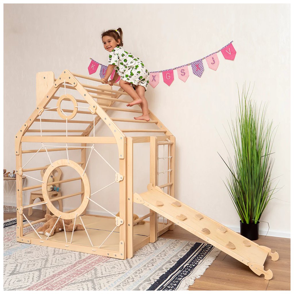Montessori domček na hranie Home natural so šmykľavkou a rampou