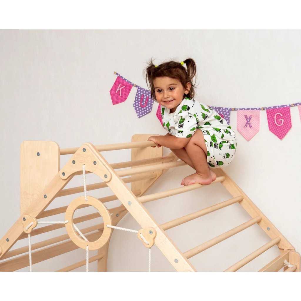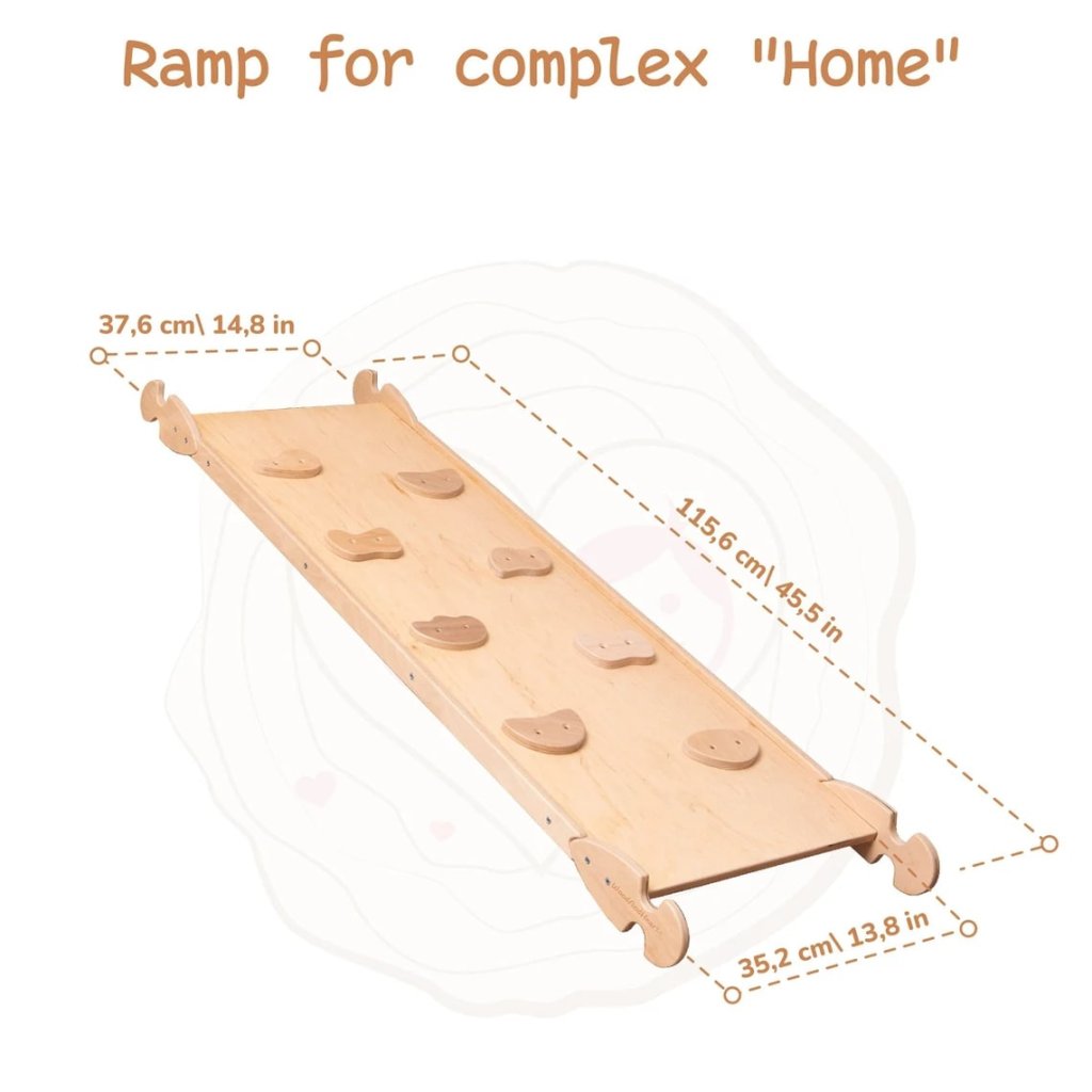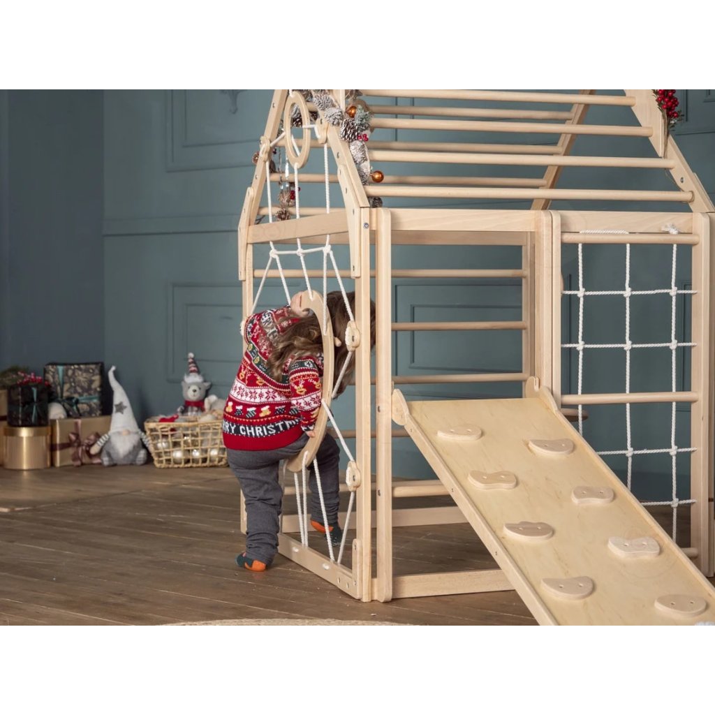 Montessori domček na hranie Home so šmykľavkou a rampou v prírodnom dizajne je všestranný interiérový hrací priestor navrhnutý tak, aby pri hre zapojil detskú motoriku, kontrolu rovnováhy, koordináciu pohybov a nespútanú predstavivosť. Vďaka svojej prívetivej štruktúre poskytuje množstvo príležitostí na lezenie, šplhanie a zlepšovanie fyzickej kondície, a to vďaka herným prvkom, ktoré domček Home obsahuje. Deti si domček Montessori Home okamžite zamilujú, je to nekonečné lezenie, plazenie, preliezanie po celom domčeku, navyše má domček obojstrannú lezeckú stenu s drevenými lezeckými bodmi, ktoré sa po otočení dajú použiť aj ako šmykľavka, ktorú môžete bezpečne pripevniť k domčeku. Obojstranná rampa sa dá použiť aj vo vnútri domčeka ako stôl, kde si deti môžu maľovať a kreatívne tvoriť svoje umelecké diela. Deti môžu na domček vyliezť z troch strán, jedna strana je tvorená drevenými priečkami s pomocnou priečkou privarenou k hornej časti strechy, ako komín domčeka, ktorý slúži na ľahšie lezenie po streche. Druhá strana domčeka má kombináciu lanovej steny s priečkami na lezenie a plazenie a cez drevené priečky pokračujú na vrchol striešky a posledná strana domčeka má drevené okno, cez ktoré môžu preliezať, a okno je upevnené prírodnými lanami, cez ktoré môžu tiež preliezať. K domčeku môžete pridať hojdací disk, hojdačku ....a ďalšie prvky v sekcii súvisiace položky a domček môžete vylepšovať podľa fyzických potrieb vašich detí. Dom je vyrobený z prémiového masívneho bukového dreva, známeho svojou pevnosťou a pružnosťou, pričom prioritou je odolnosť a šetrnosť k životnému prostrediu. Použitie vysokokvalitného ekologického laku na vodnej báze zaručuje bezpečnú a príjemnú hru a prirodzenú farbu dreva s pastelovými doplnkami alebo kombináciu bielej a prírodného dreva. Vnútorné ihrisko Montessori s maximálnou nosnosťou 60 kg ponúka deťom bezpečné prostredie na skúmanie a rozvoj ich fyzických schopností. Parametre: Celková výška: 142 cm Celková šírka: 109,5 cm Hĺbka domčeka na hranie: 94,4 cm, s obojstrannou rampou: 210 cm Nosnosť: 60 kg UPOZORNENIE : MATRAC NIE JE SÚČASŤOU BALENIADodatočné parametre