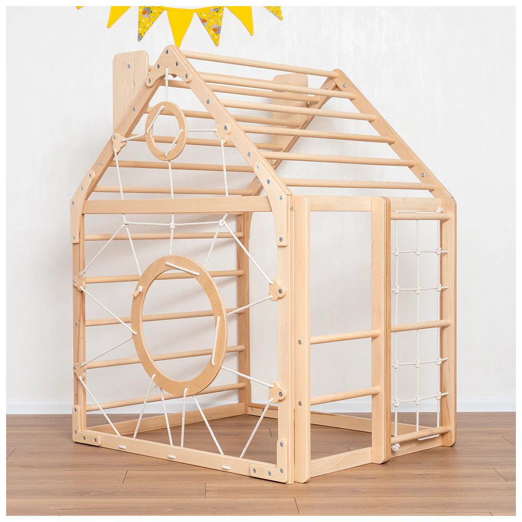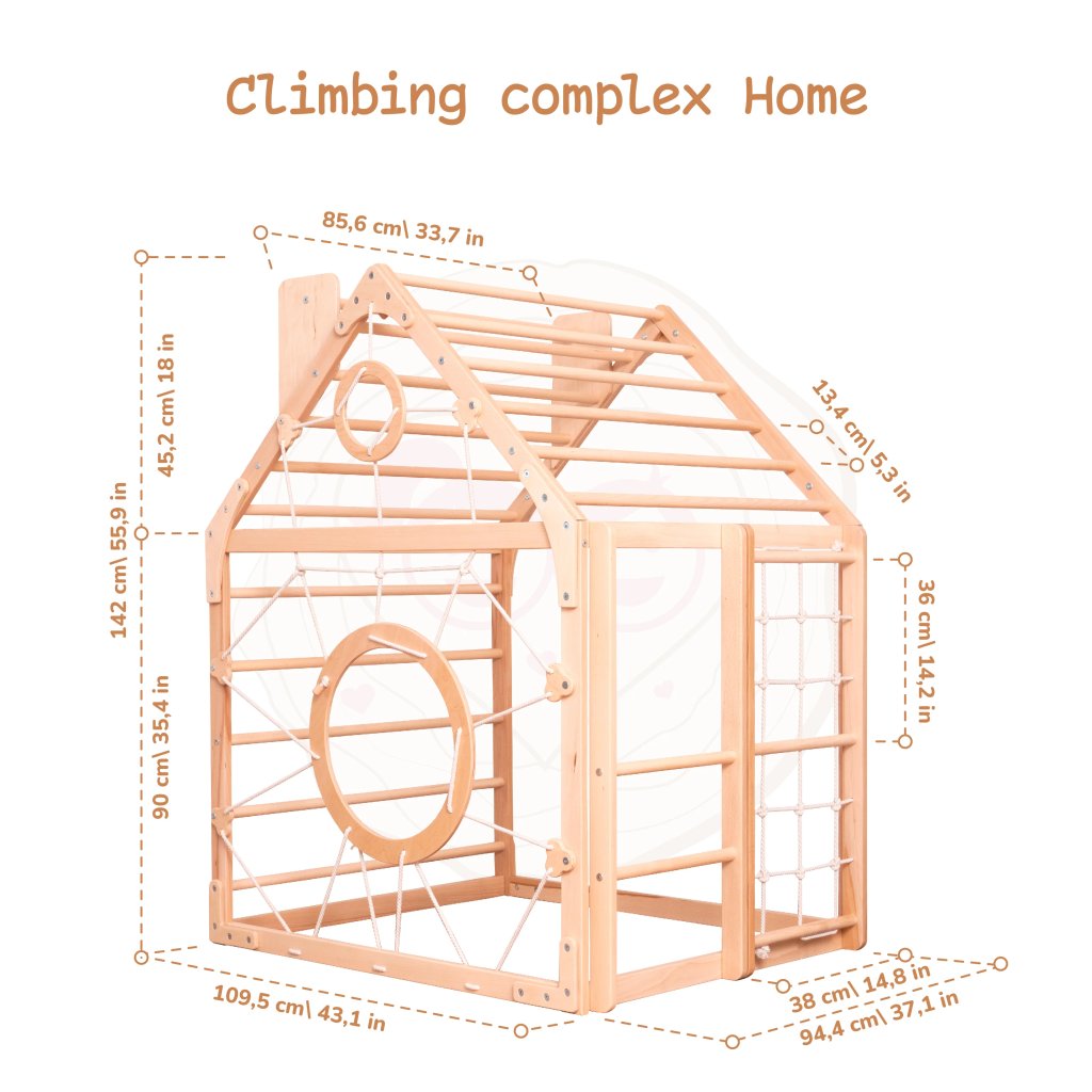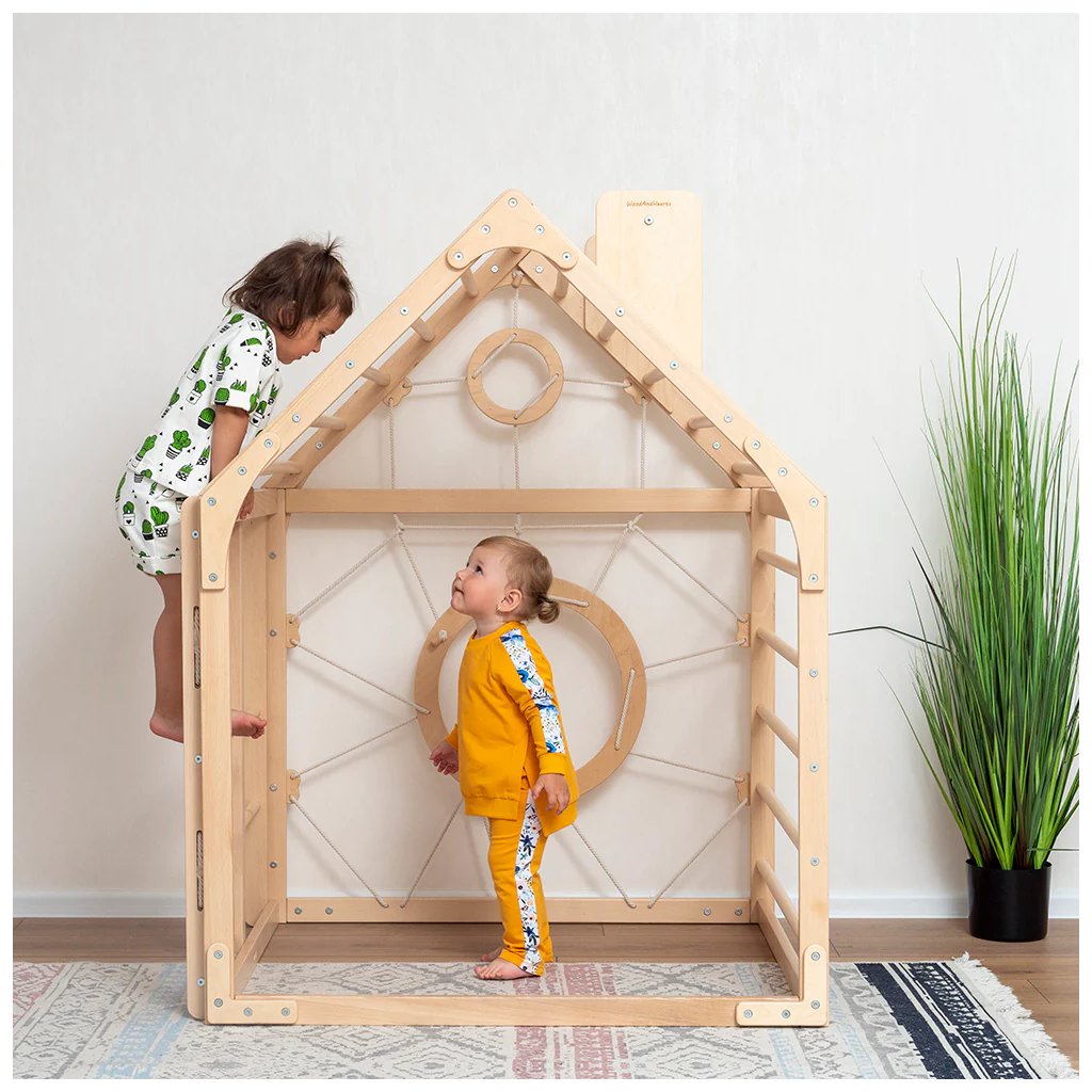 Montessori domček na hranie Home in Natural je všestranné interiérové ihrisko navrhnuté tak, aby pri hre zapojilo detskú motoriku, kontrolu rovnováhy, koordináciu pohybov a nespútanú predstavivosť. Vďaka svojej prívetivej štruktúre poskytuje rôzne príležitosti na lezenie, šplhanie a zlepšovanie fyzickej kondície, a to vďaka herným prvkom, ktoré domček na hranie Home obsahuje. Deti si domček Montessori Home okamžite zamilujú, je to nekonečné lezenie, plazenie po celom domčeku. Deti môžu liezť na domček z troch strán, jedna strana je z drevených priečok s pomocnou priečkou privarenou k vrcholu strechy, ako komín domčeka, ktorá slúži na ľahšie lezenie po streche. Druhá strana domčeka má kombináciu lanovej steny s priečkami na lezenie a plazenie a cez drevené priečky pokračujú na vrchol striešky a posledná strana domčeka má drevené okno, cez ktoré môžu preliezať, a okno je upevnené prírodnými lanami, cez ktoré môžu tiež preliezať. K domčeku môžete pridať hojdací disk, hojdačku ....a ďalšie prvky v sekcii súvisiace položky a domček môžete vylepšovať podľa fyzických potrieb vašich detí. Domček na hranie, je vyrobený z prvotriedneho masívneho bukového dreva, známeho svojou pevnosťou a pružnosťou, uprednostňuje odolnosť a šetrnosť k životnému prostrediu. Použitie vysokokvalitného ekologického laku na vodnej báze zaručuje bezpečnú a príjemnú hru a prirodzenú farbu dreva s pastelovými doplnkami alebo kombináciu bielej farby a prírodného dreva. Vnútorné ihrisko Montessori s maximálnou nosnosťou 60 kg ponúka deťom bezpečné prostredie na skúmanie a rozvoj ich fyzických schopností. Parametre: Celková výška: 142 cm Celková šírka: 109,5 cm Hĺbka: 94,4 cm Nosnosť: 60 kgDodatočné parametre