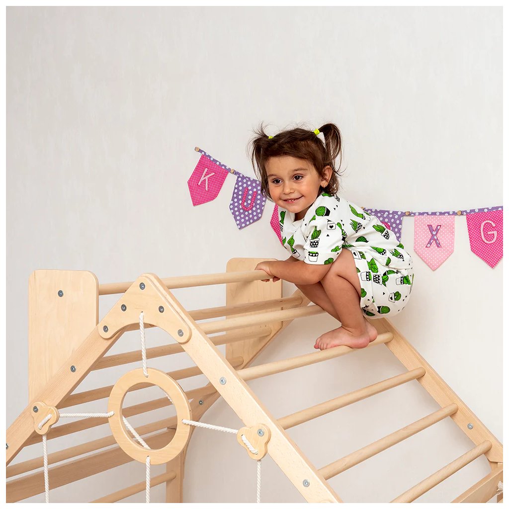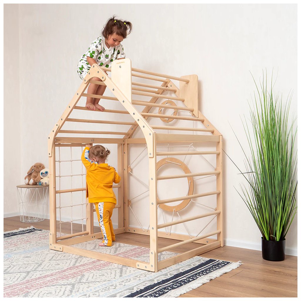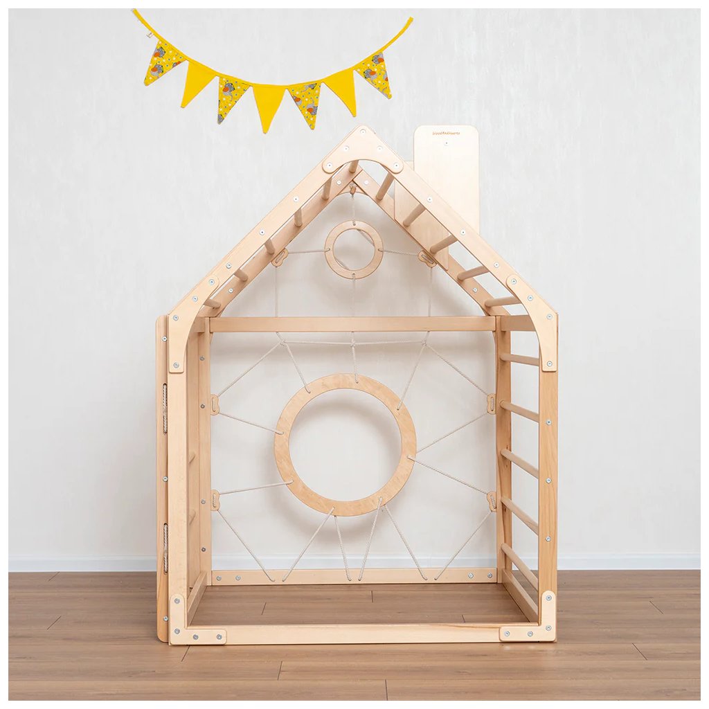 Montessori domček na hranie Home in Natural je všestranné interiérové ihrisko navrhnuté tak, aby pri hre zapojilo detskú motoriku, kontrolu rovnováhy, koordináciu pohybov a nespútanú predstavivosť. Vďaka svojej prívetivej štruktúre poskytuje rôzne príležitosti na lezenie, šplhanie a zlepšovanie fyzickej kondície, a to vďaka herným prvkom, ktoré domček na hranie Home obsahuje. Deti si domček Montessori Home okamžite zamilujú, je to nekonečné lezenie, plazenie po celom domčeku. Deti môžu liezť na domček z troch strán, jedna strana je z drevených priečok s pomocnou priečkou privarenou k vrcholu strechy, ako komín domčeka, ktorá slúži na ľahšie lezenie po streche. Druhá strana domčeka má kombináciu lanovej steny s priečkami na lezenie a plazenie a cez drevené priečky pokračujú na vrchol striešky a posledná strana domčeka má drevené okno, cez ktoré môžu preliezať, a okno je upevnené prírodnými lanami, cez ktoré môžu tiež preliezať. K domčeku môžete pridať hojdací disk, hojdačku ....a ďalšie prvky v sekcii súvisiace položky a domček môžete vylepšovať podľa fyzických potrieb vašich detí. Domček na hranie, je vyrobený z prvotriedneho masívneho bukového dreva, známeho svojou pevnosťou a pružnosťou, uprednostňuje odolnosť a šetrnosť k životnému prostrediu. Použitie vysokokvalitného ekologického laku na vodnej báze zaručuje bezpečnú a príjemnú hru a prirodzenú farbu dreva s pastelovými doplnkami alebo kombináciu bielej farby a prírodného dreva. Vnútorné ihrisko Montessori s maximálnou nosnosťou 60 kg ponúka deťom bezpečné prostredie na skúmanie a rozvoj ich fyzických schopností. Parametre: Celková výška: 142 cm Celková šírka: 109,5 cm Hĺbka: 94,4 cm Nosnosť: 60 kgDodatočné parametre