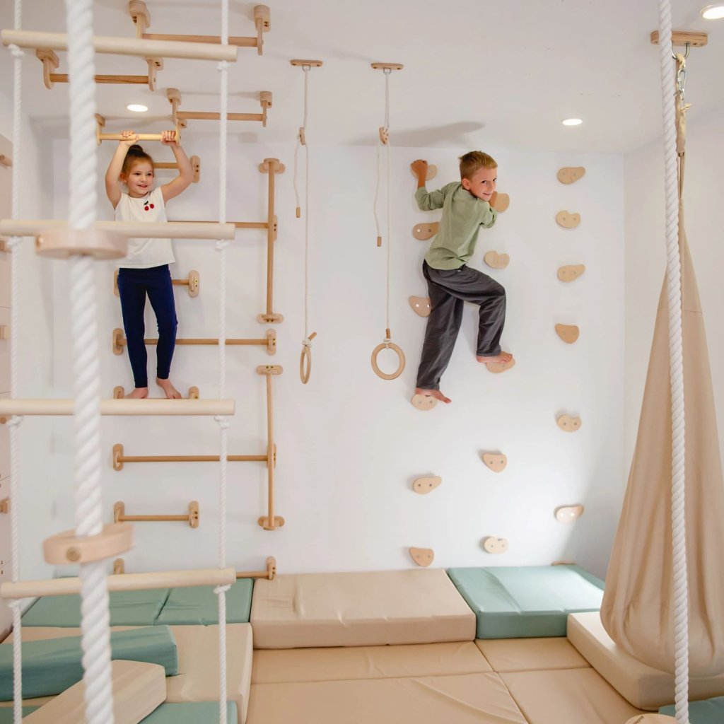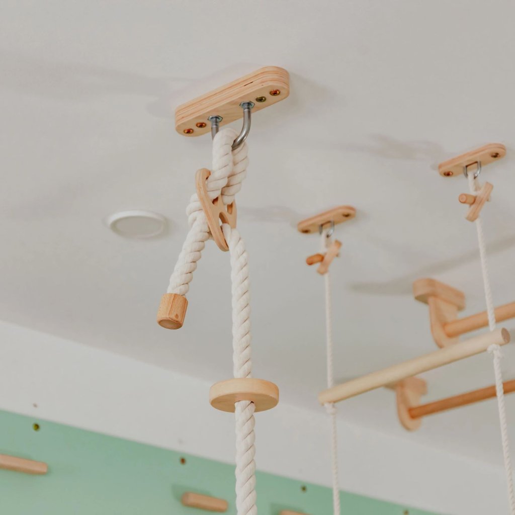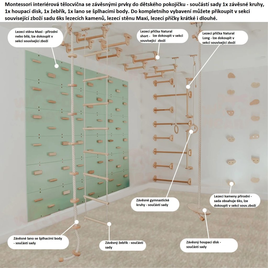 Závesné interiérové ??prvky, ktoré ponúkajú inšpiratívny spôsob, ako premeniť detskú izbu či herňu na aktívny a kreatívny priestor pre pohyb a objavovanie. Vytvorte deťom ich vlastný hrací priestor, kde budú radi tráviť čas a hlavne zdokonaľovať svoju fyzickú zdatnosť, flexibilitu, silu a môžu sa zlepšovať, kedykoľvek budú chcieť, pretože herné prvky majú doma a kedykoľvek v dosahu, kedy budú chcieť aktívnu zábavu. Závesné prvky sú z prírodného lana a sú vyrobené z bukového dreva, čo zaručuje konštrukčnú pevnosť aj esteticky prírodný vzhľad. Prirodzená farba dreva nezaťažuje dizajn interiéru a dobre ladí s modernými aj pokojnejšími priestormi. Montáž je jednoduchá a flexibilná - vďaka možnosti kombinovať niekoľko sád je možné vytvoriť väčšiu plochu či systém pre viac detí či variabilné hranie. Odporúčaný limit pre bežné použitie je 60 kg. Tým je zaistená bezpečnosť a dlhodobá spoľahlivosť pri každodennom hraní. So závesnými prvkami získavate vybavenie, ktoré podporuje rozvoj telesnej sily, koordinácie, rovnováhy i motorických zručností detí a zároveň sa stáva štýlovým prvkom každého priestoru. Podľa potrieb vašich detí môžete herný priestor rozšíriť podľa vašich možností a preferencií Vašich detí, všetky aktívne doplnky na vytvorenie herničky môžete vyberať v sekcii súvisiaci tovar. Sada obsahuje: 1x hojdací disk, 1x gymnastické kruhy, 1x 8 stupňový povrazový rebrík, 1x šplhacie lano s 8 šplhacími bodmi, 1x montážne sety na upevnenie do stropu súčasťou baleniaDodatočné parametre